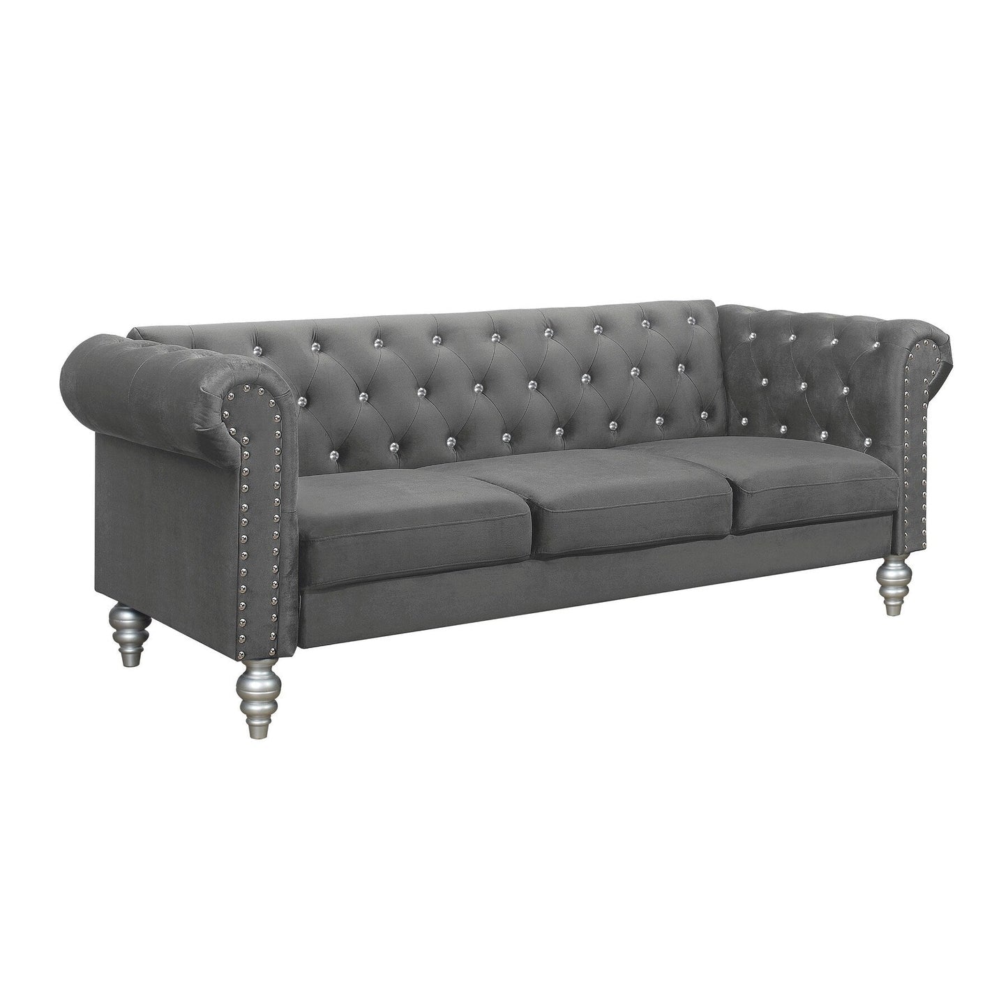 Introduci lusso e comfort nel tuo soggiorno con il nostro divano con braccioli arrotondati. Lo schienale imbottito, i braccioli arrotondati e la seduta profonda e imbottita creano un'atmosfera elegante e rilassante. Lo schienale è elegantemente trapuntato con bottoni a rombo, completato da una rifinitura a borchie lungo i braccioli arrotondati, che aggiunge un tocco di raffinatezza. Sostenuto da quattro robuste gambe in legno tornito, questo divano fonde il comfort moderno con il fascino vintage, rendendolo un'aggiunta perfetta sia per il relax che per valorizzare l'estetica della tua casa.