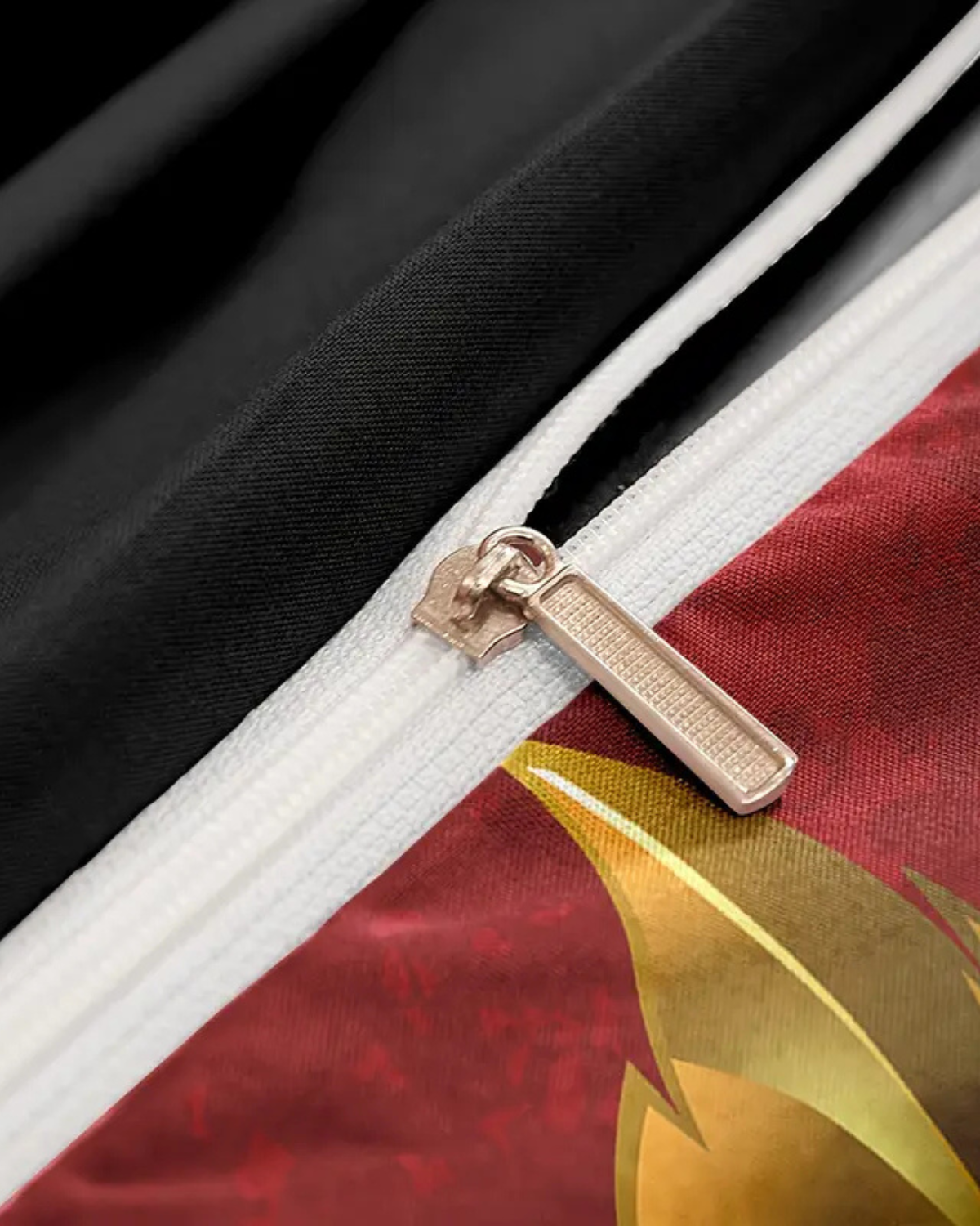 Esalta l'atmosfera della tua camera da letto con il set di biancheria da letto Rosa Luxe . Questo raffinato set, composto da copripiumino e due federe coordinate, unisce opulenza e romanticismo in un design mozzafiato. L'intenso sfondo bordeaux funge da sfondo perfetto per le sontuose rose dorate e cremisi, creando un accattivante contrasto che trasuda eleganza.