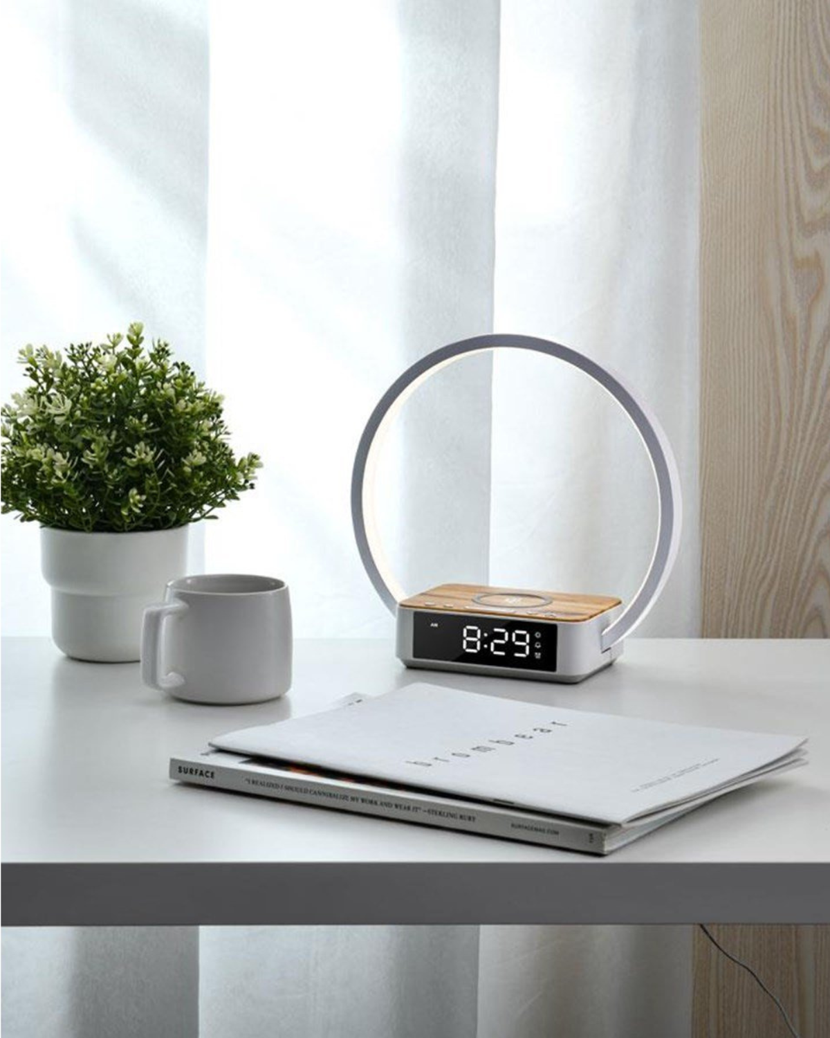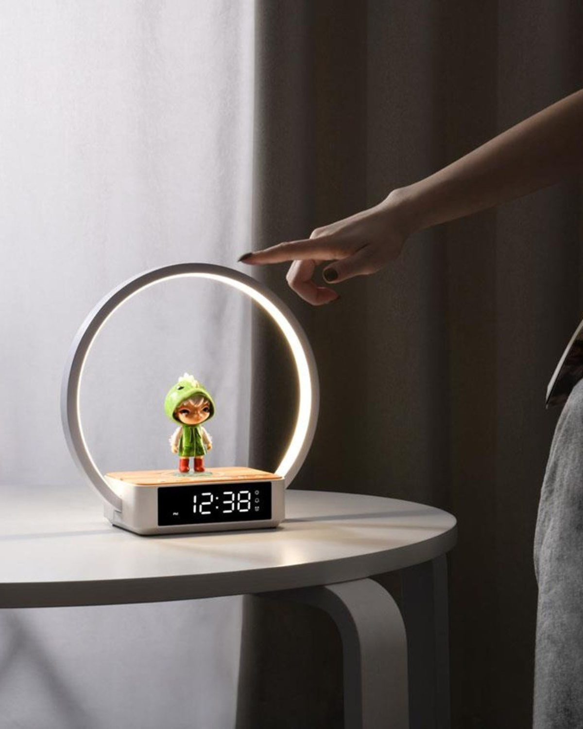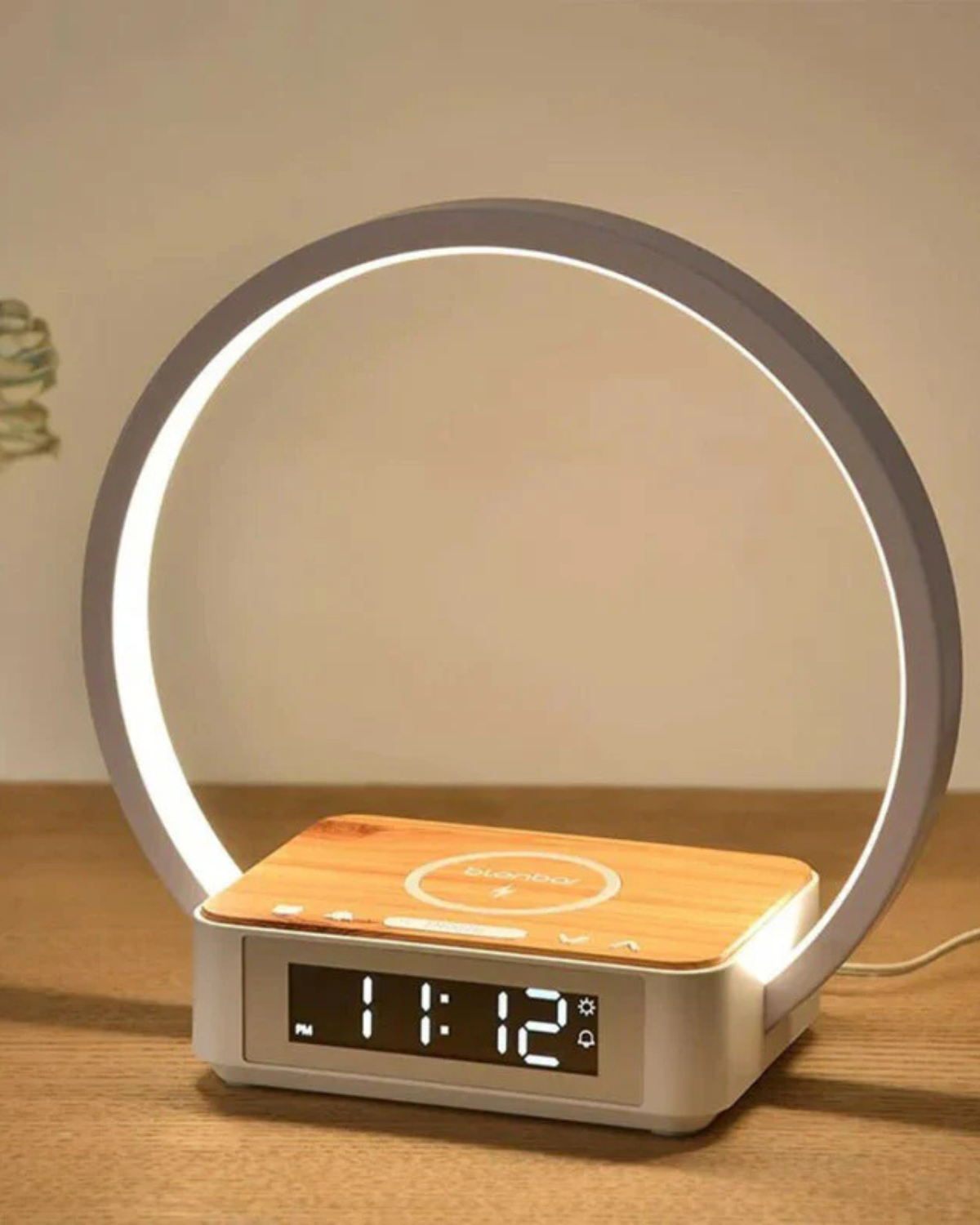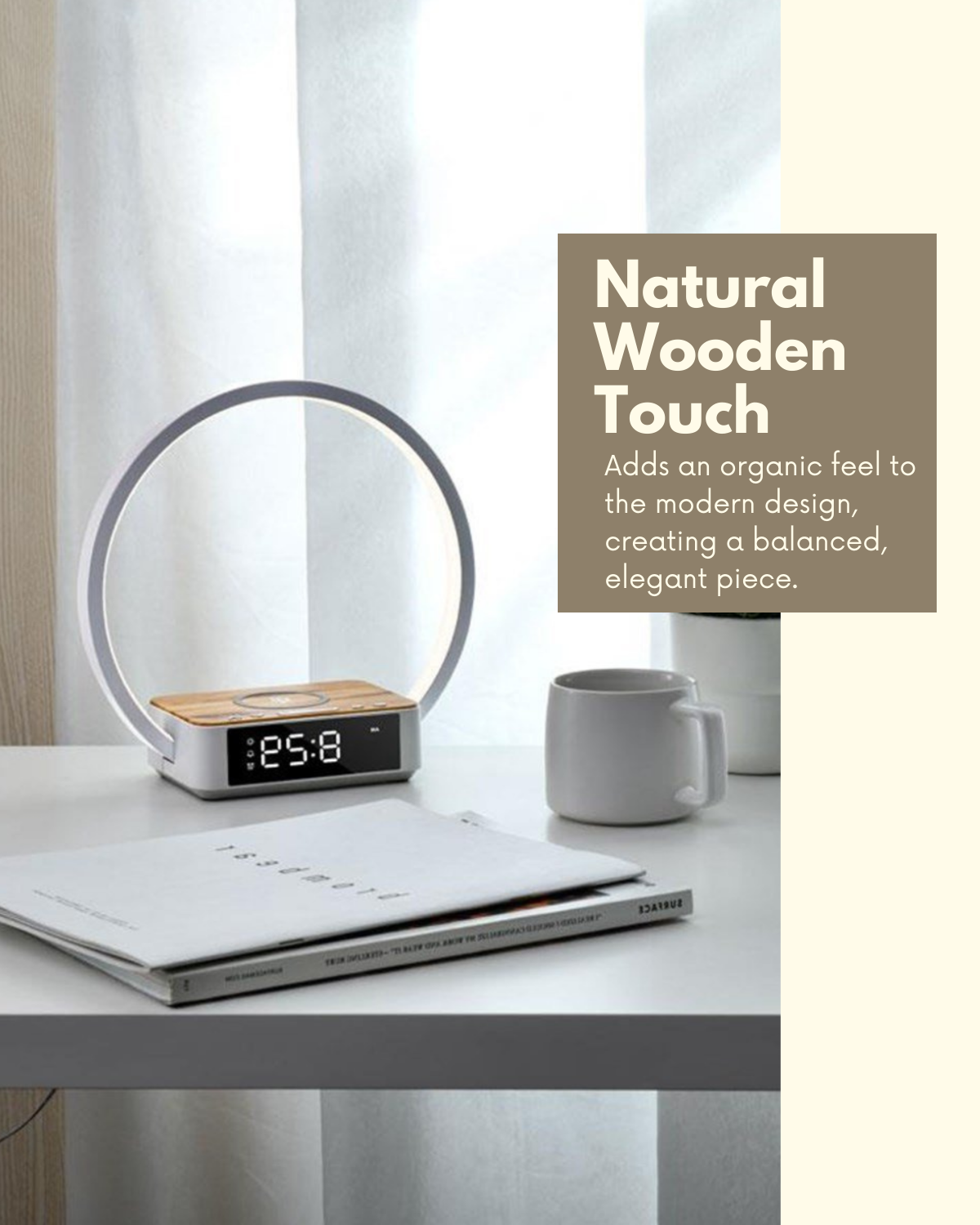 Realizzato con un elegante design circolare, integra perfettamente una sveglia digitale, un caricabatterie wireless e un'illuminazione LED dimmerabile , rendendolo il compagno perfetto per il comodino. La calda superficie in legno aggiunge un tocco naturale, bilanciando la raffinatezza contemporanea con il calore naturale.