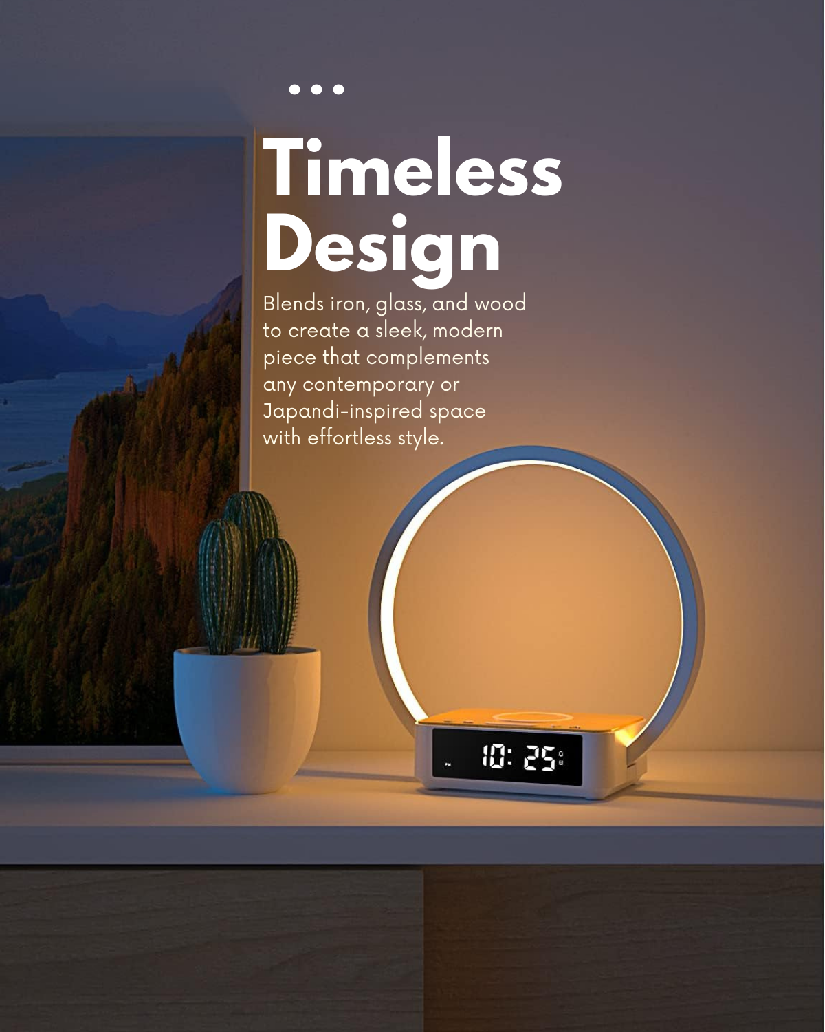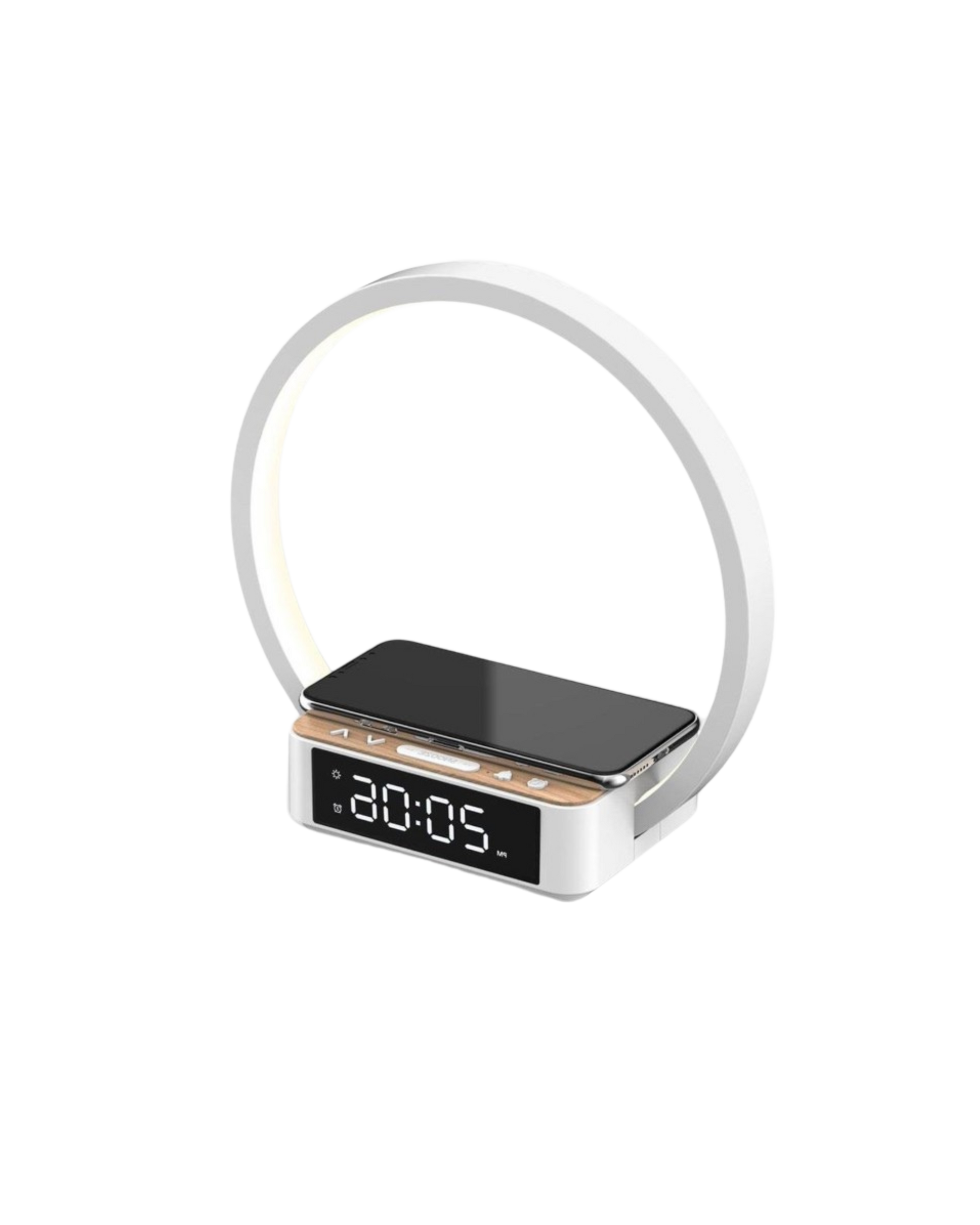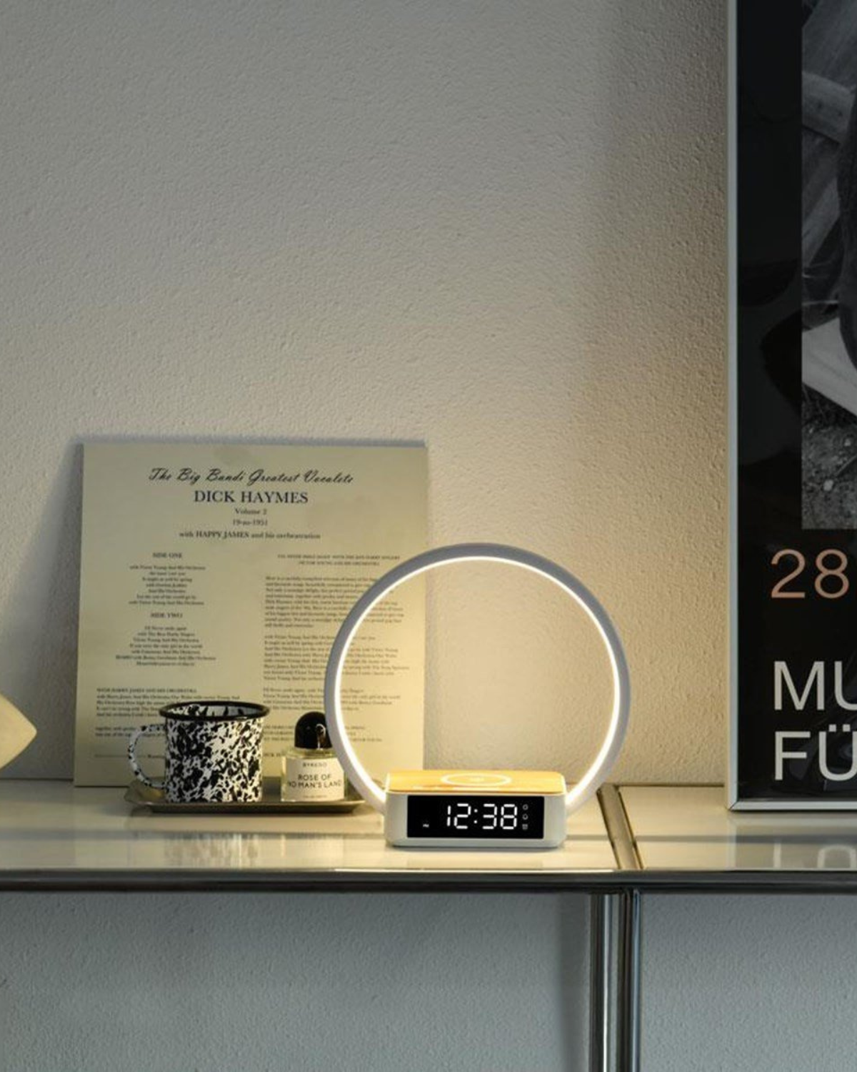 Realizzato con un elegante design circolare, integra perfettamente una sveglia digitale, un caricabatterie wireless e un'illuminazione LED dimmerabile , rendendolo il compagno perfetto per il comodino. La calda superficie in legno aggiunge un tocco naturale, bilanciando la raffinatezza contemporanea con il calore naturale.