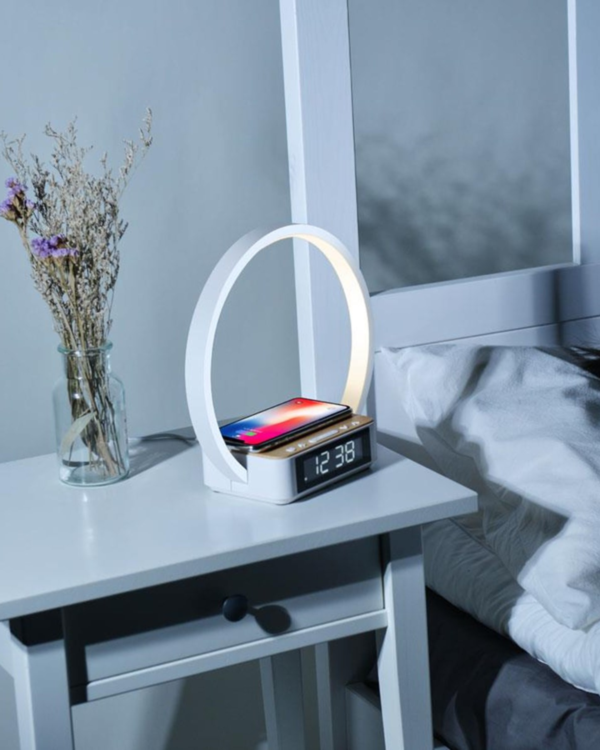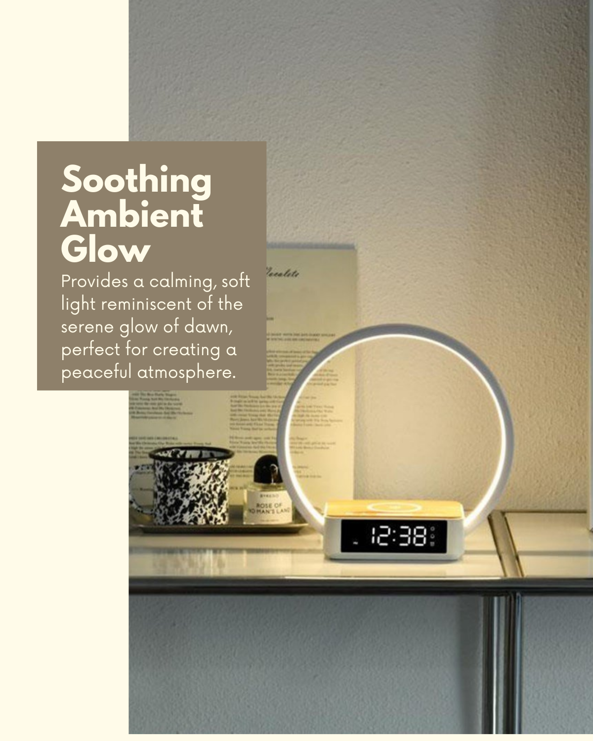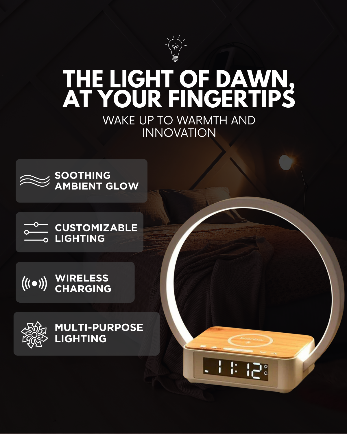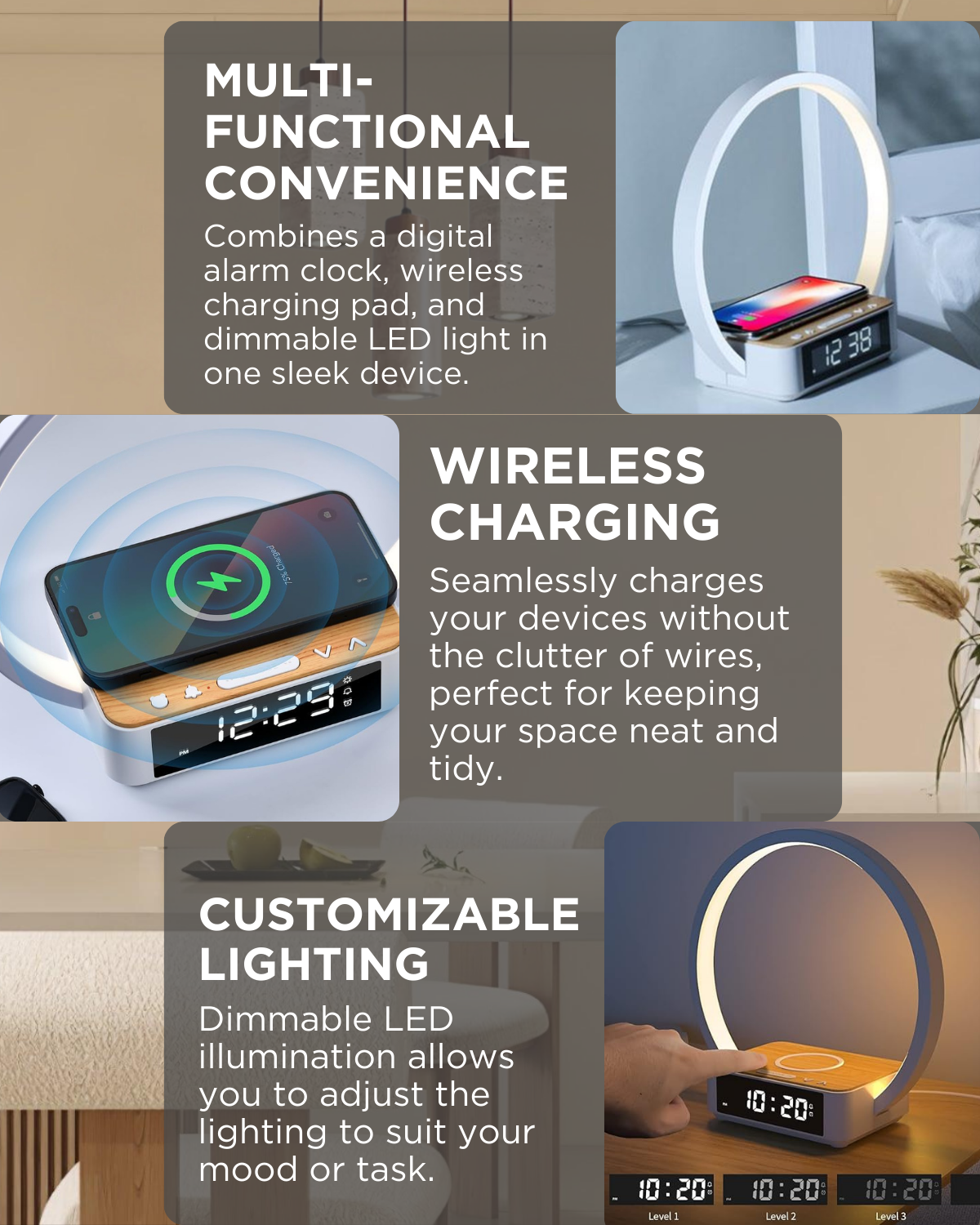 Realizzato con un elegante design circolare, integra perfettamente una sveglia digitale, un caricabatterie wireless e un'illuminazione LED dimmerabile , rendendolo il compagno perfetto per il comodino. La calda superficie in legno aggiunge un tocco naturale, bilanciando la raffinatezza contemporanea con il calore naturale.