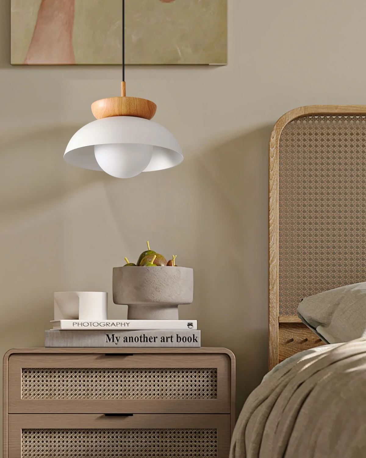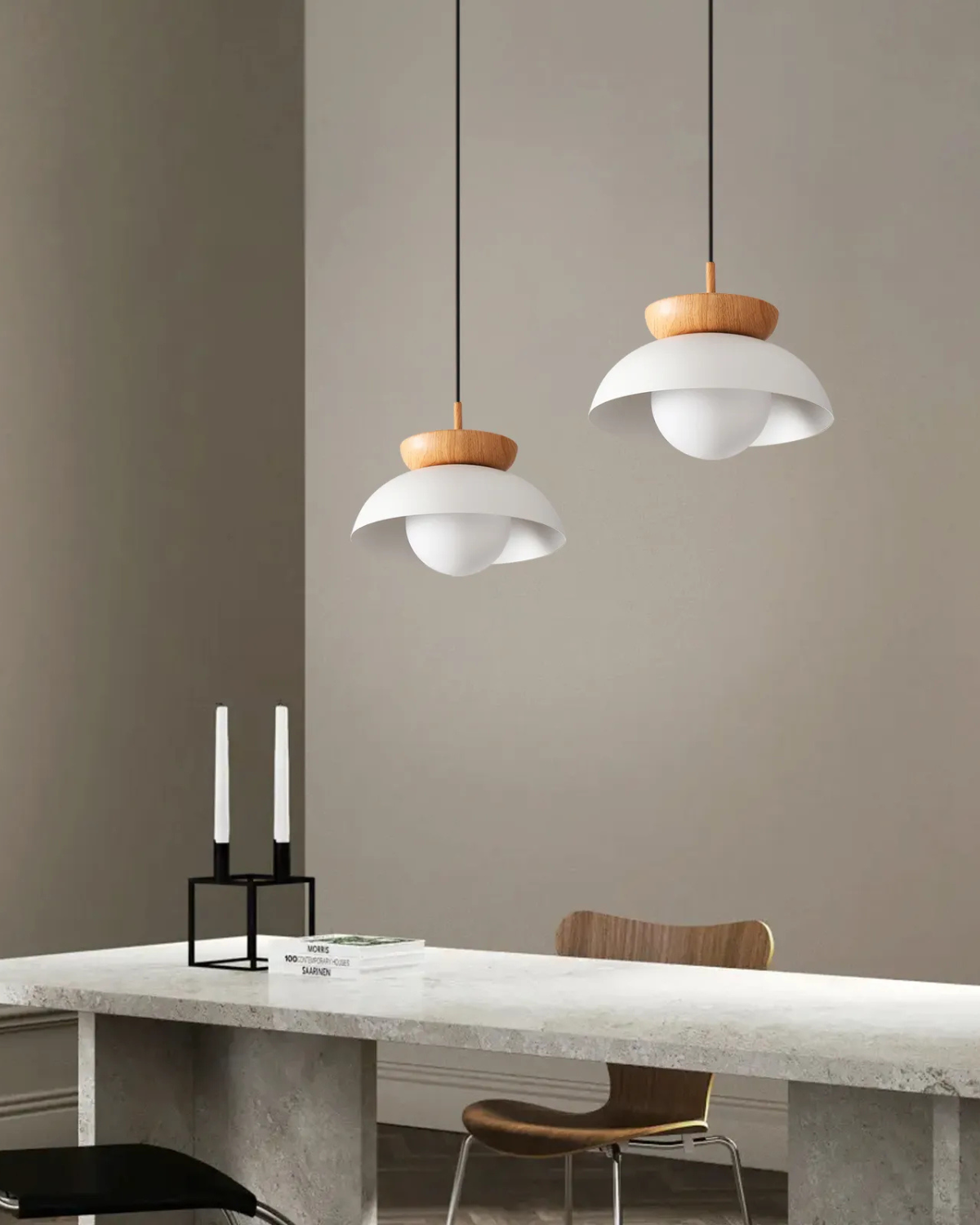 La luce soffusa del globo satinato crea un'atmosfera calda e accogliente, rendendolo perfetto per sale da pranzo, angoli accoglienti o soggiorni moderni. L'armonioso contrasto tra il legno naturale e l'elegante finitura opaca aggiunge un tocco raffinato a qualsiasi arredamento.