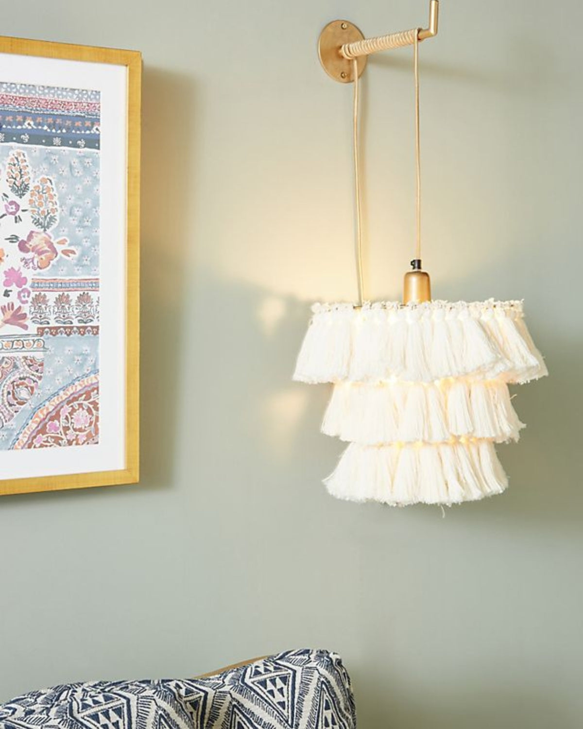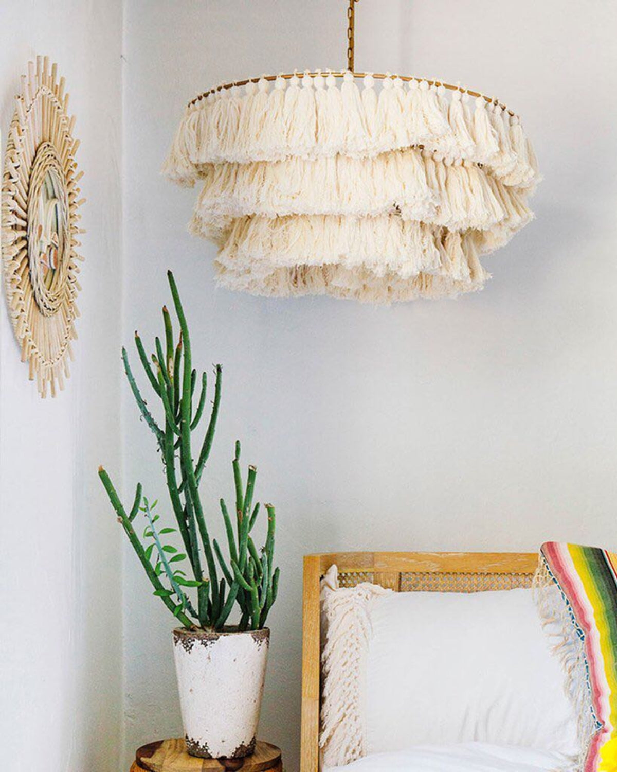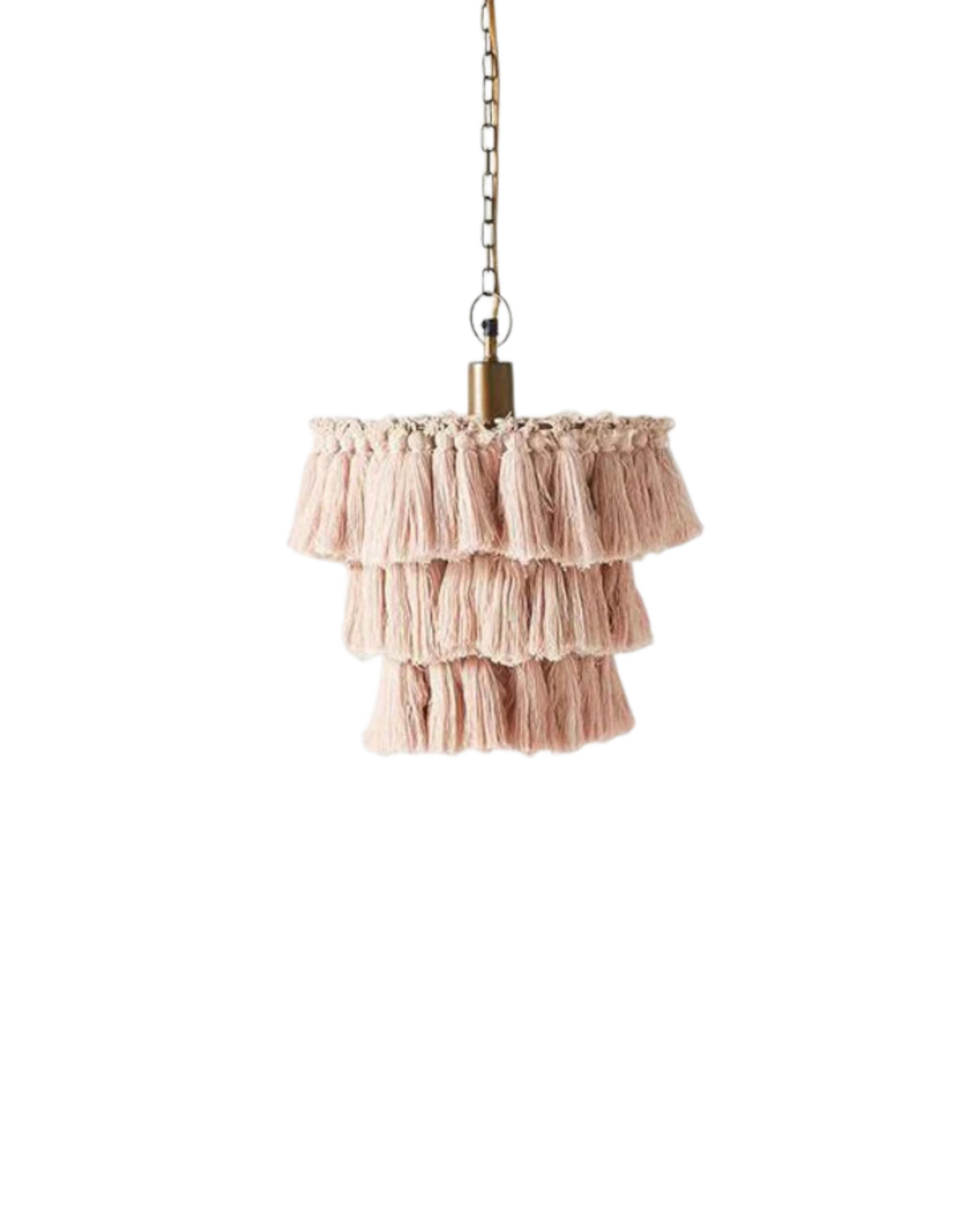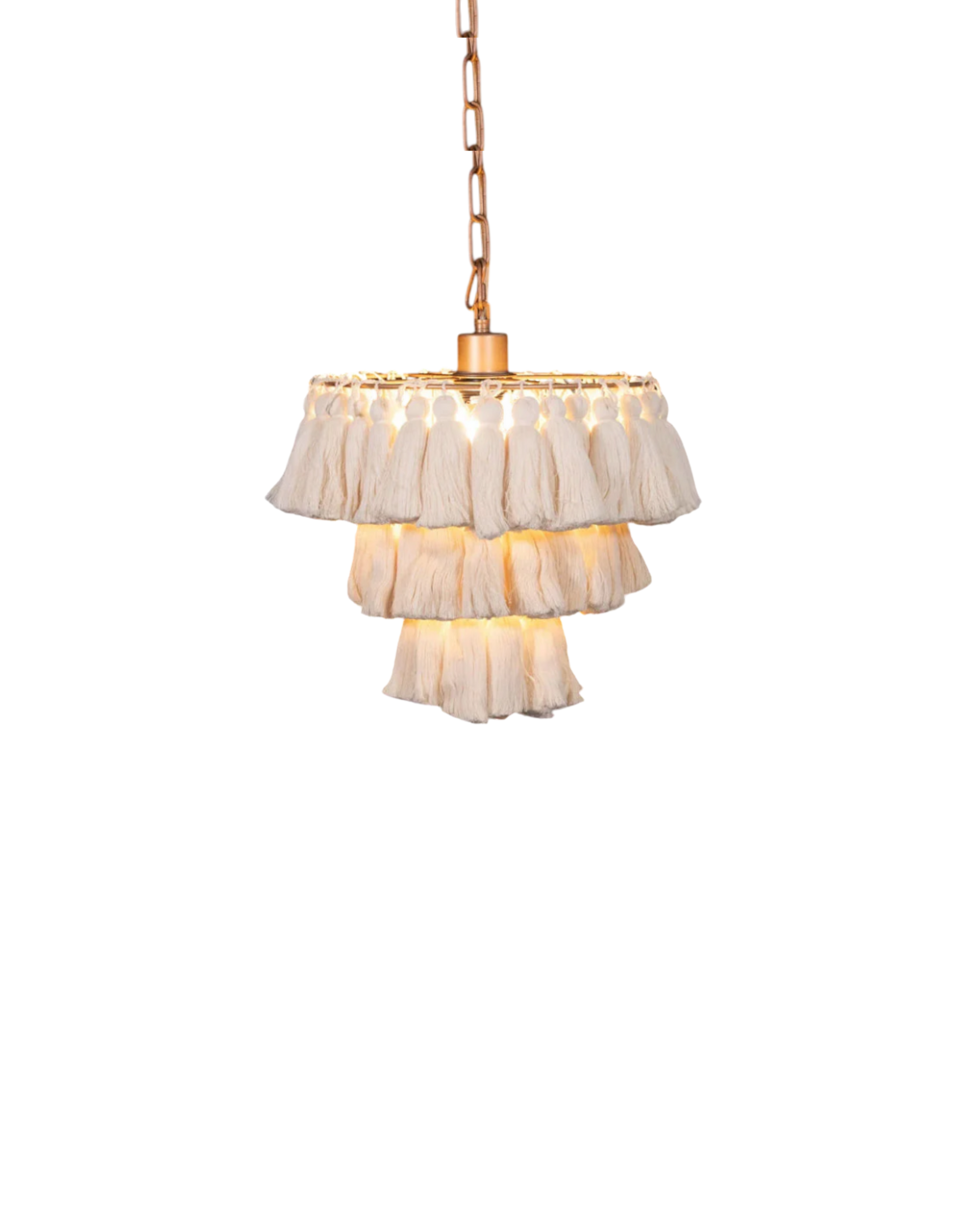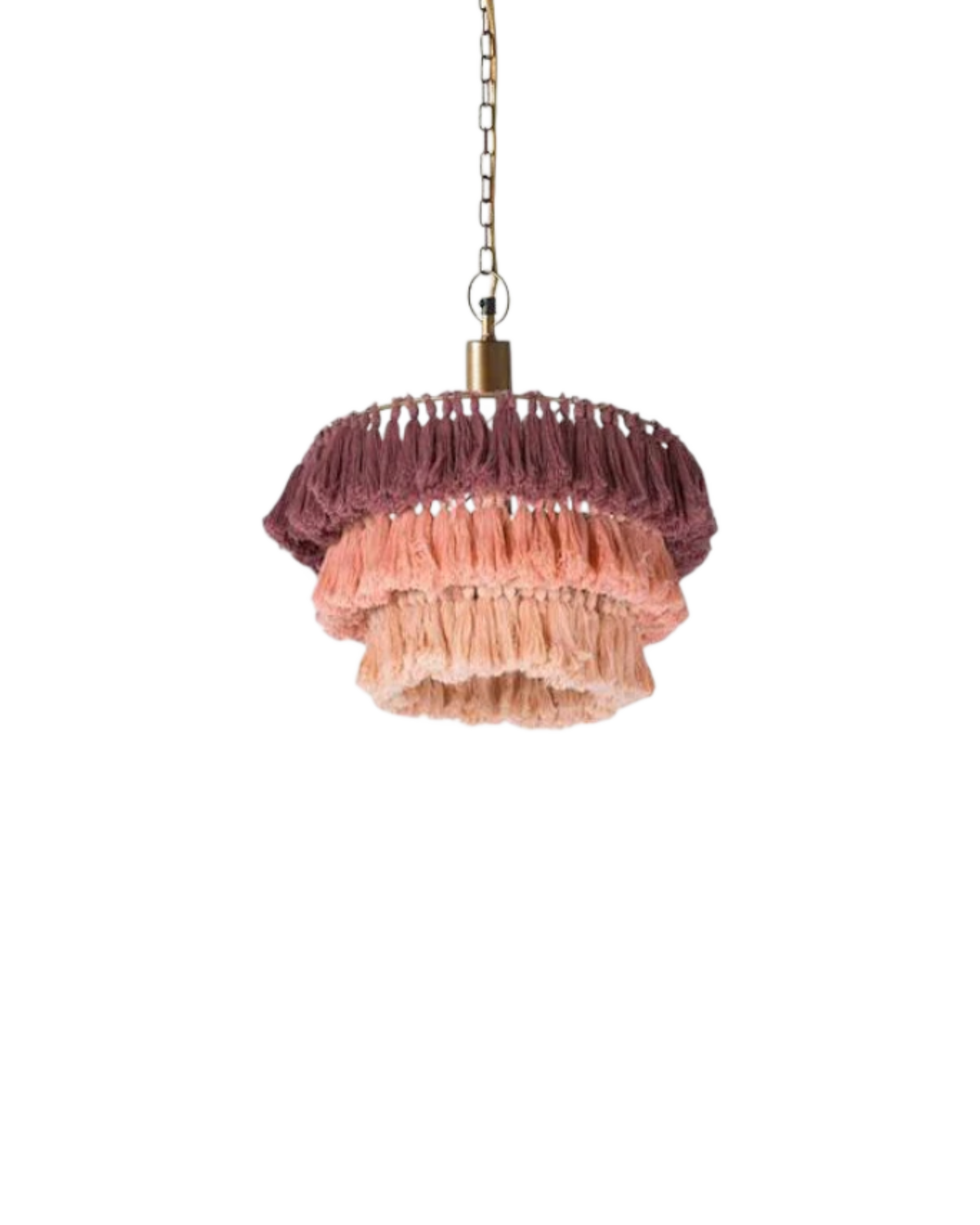 Con una cascata di nappe delicatamente annodate e una solida struttura in ottone, questa lampada è più che semplicemente funzionale: è un'espressione di raffinata arte boho. Che si tratti di impreziosire una sala da pranzo, una camera da letto o un angolo creativo, trasforma stanze ordinarie in poetici santuari di luce e texture.