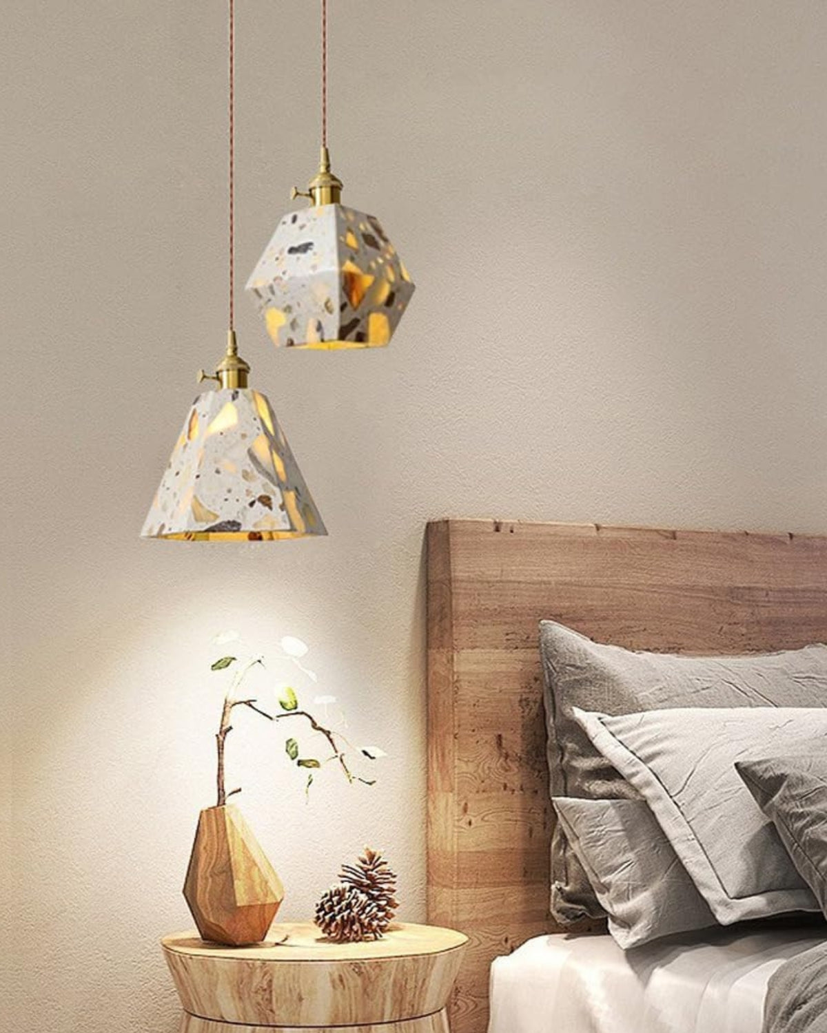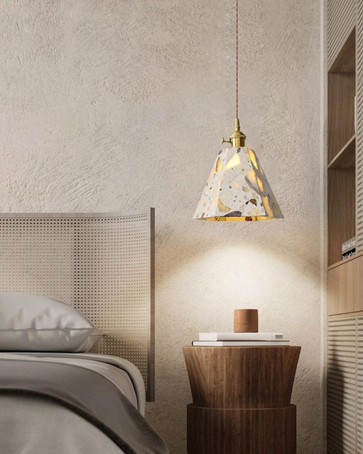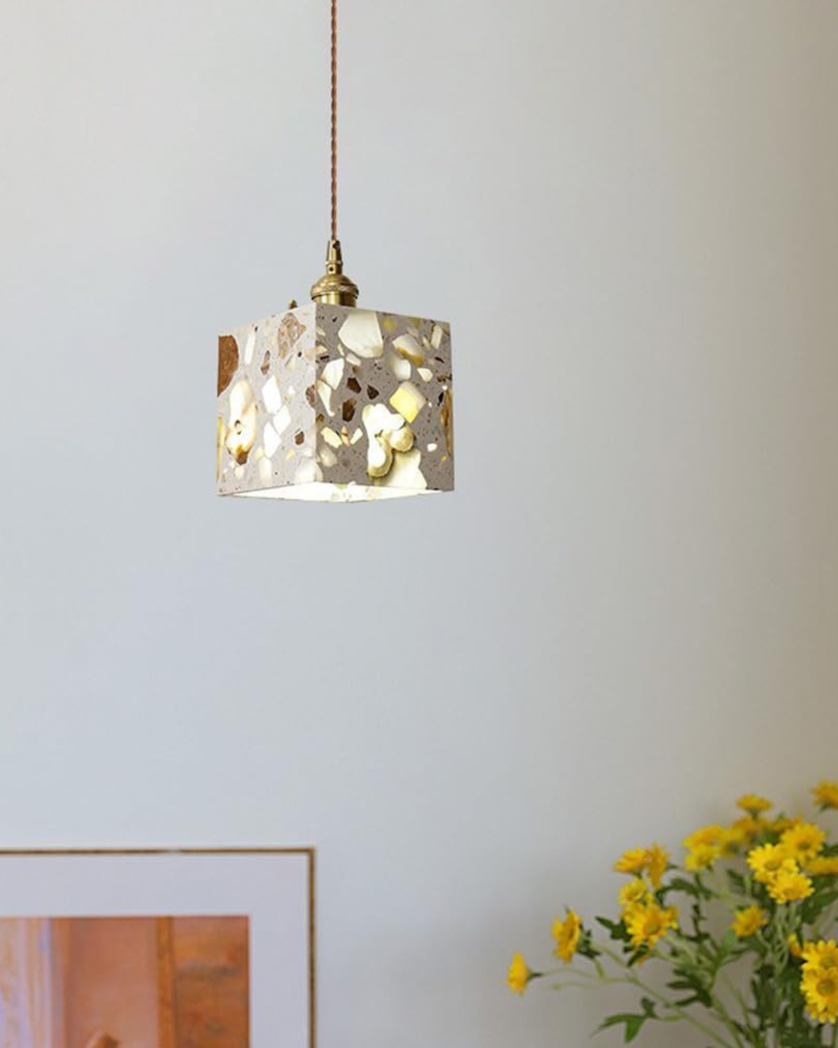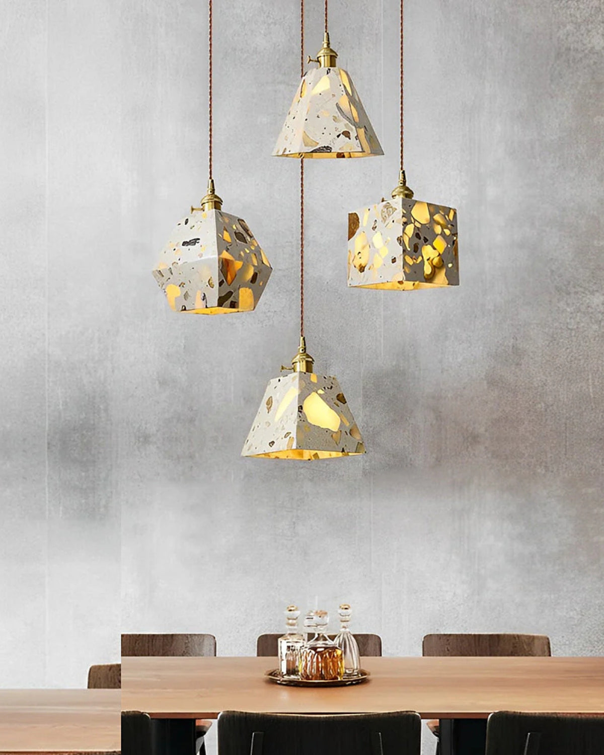 Sapientemente realizzato in pietra terrazzo di alta qualità, cemento e rame spazzolato, ogni pezzo presenta un mosaico unico di frammenti naturali, che conferisce carattere, texture e fascino visivo a qualsiasi ambiente. Che sia sospeso sopra un tavolo da pranzo, un comodino o un accogliente angolo lettura, la sua luce soffusa e la sua silhouette audace creano un punto focale di grande impatto.