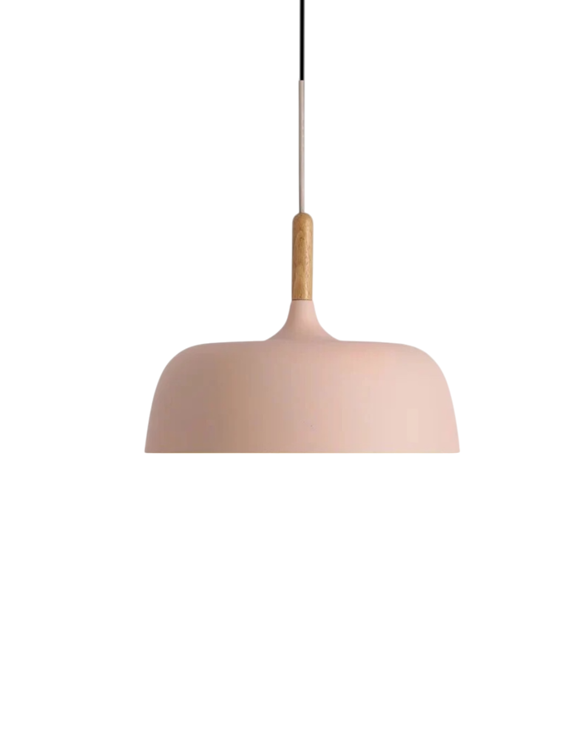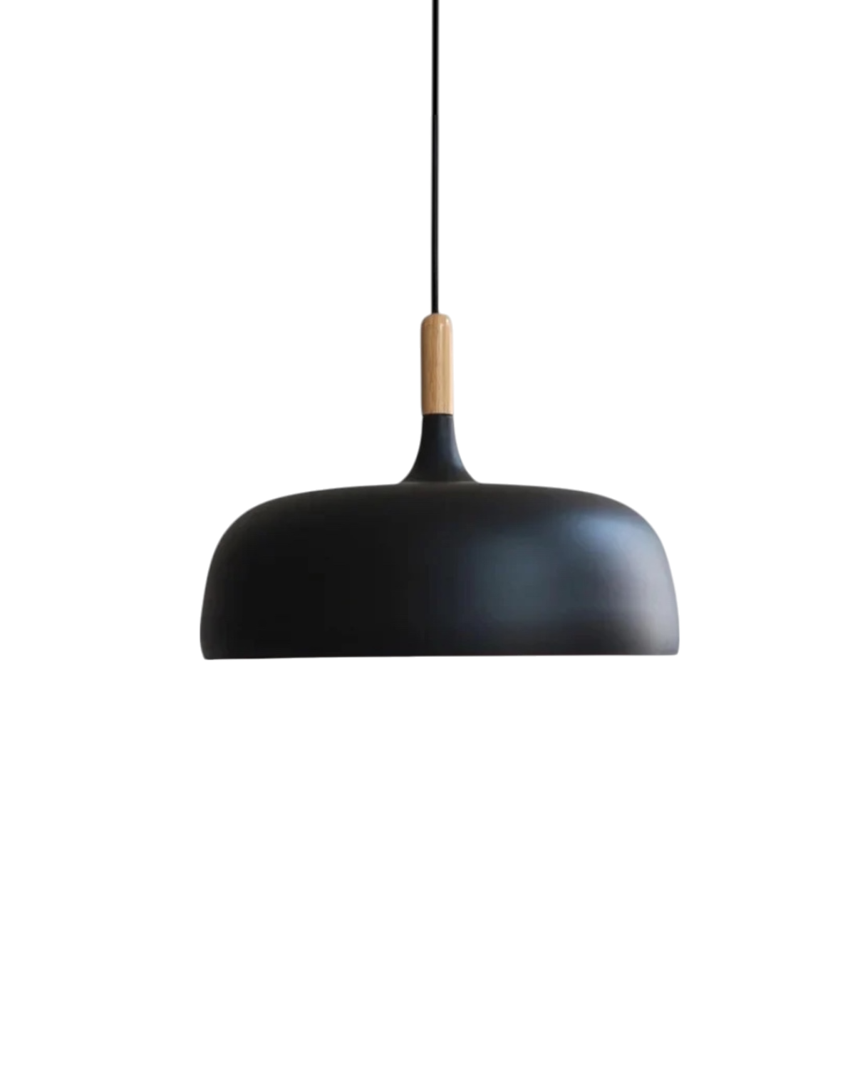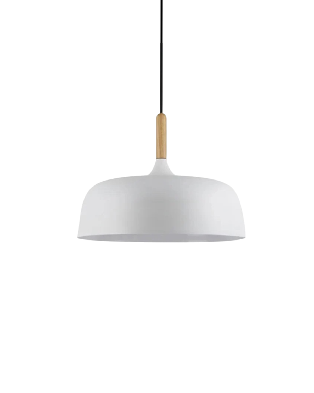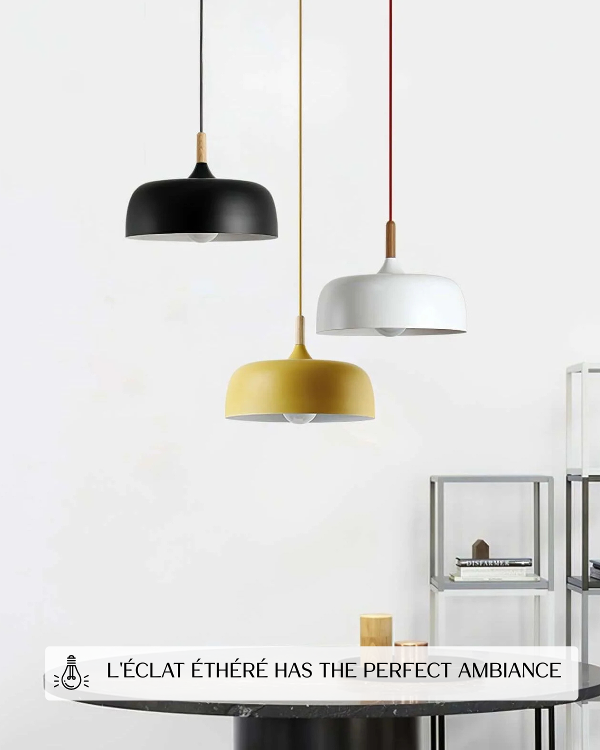 L'Éclat Éthéré è un capolavoro di sobria eleganza, che coniuga il minimalismo moderno con una raffinatezza senza tempo. Questa lampada a sospensione presenta un paralume opaco elegantemente curvo abbinato a un elemento in legno naturale, creando un'armoniosa combinazione di texture che trasuda raffinatezza.