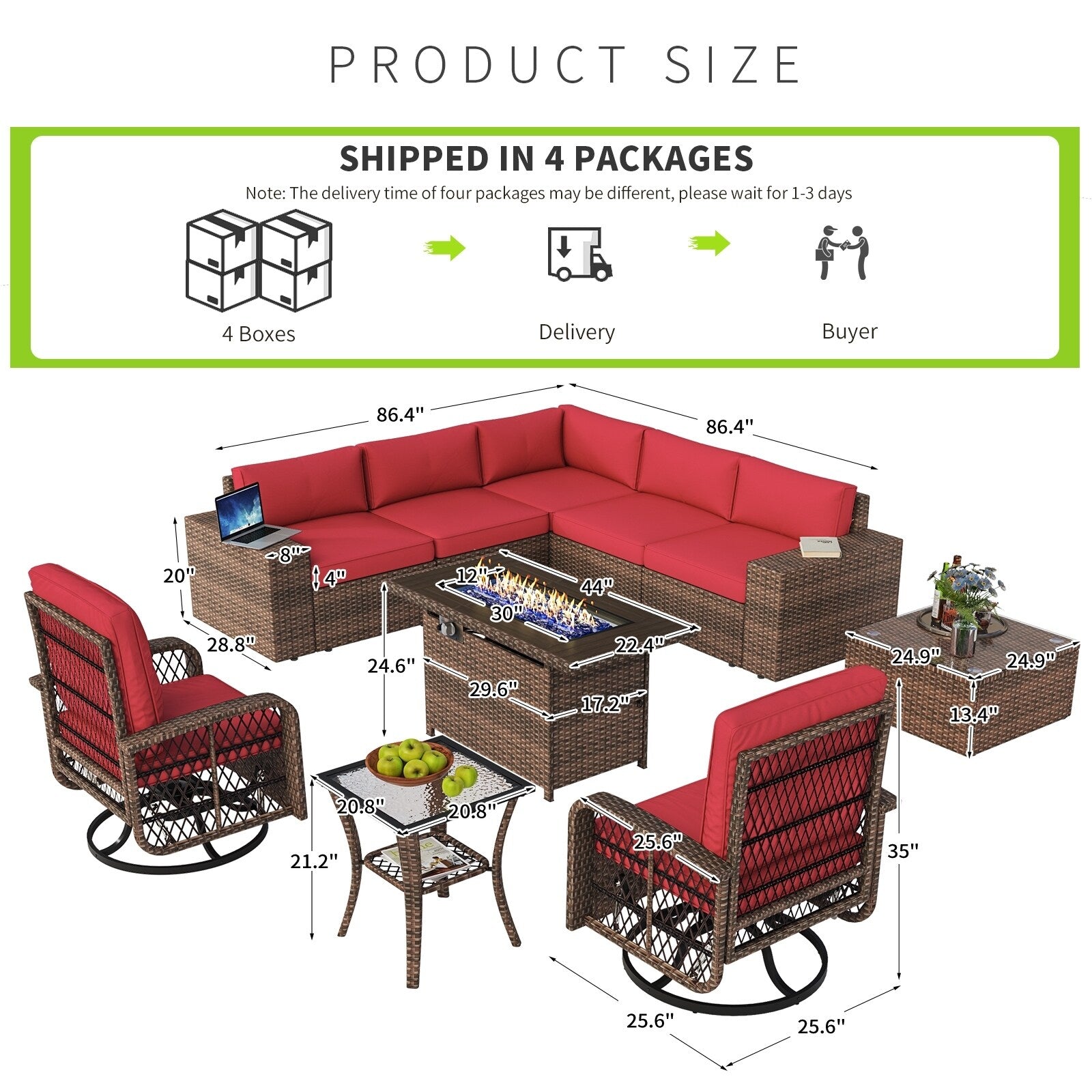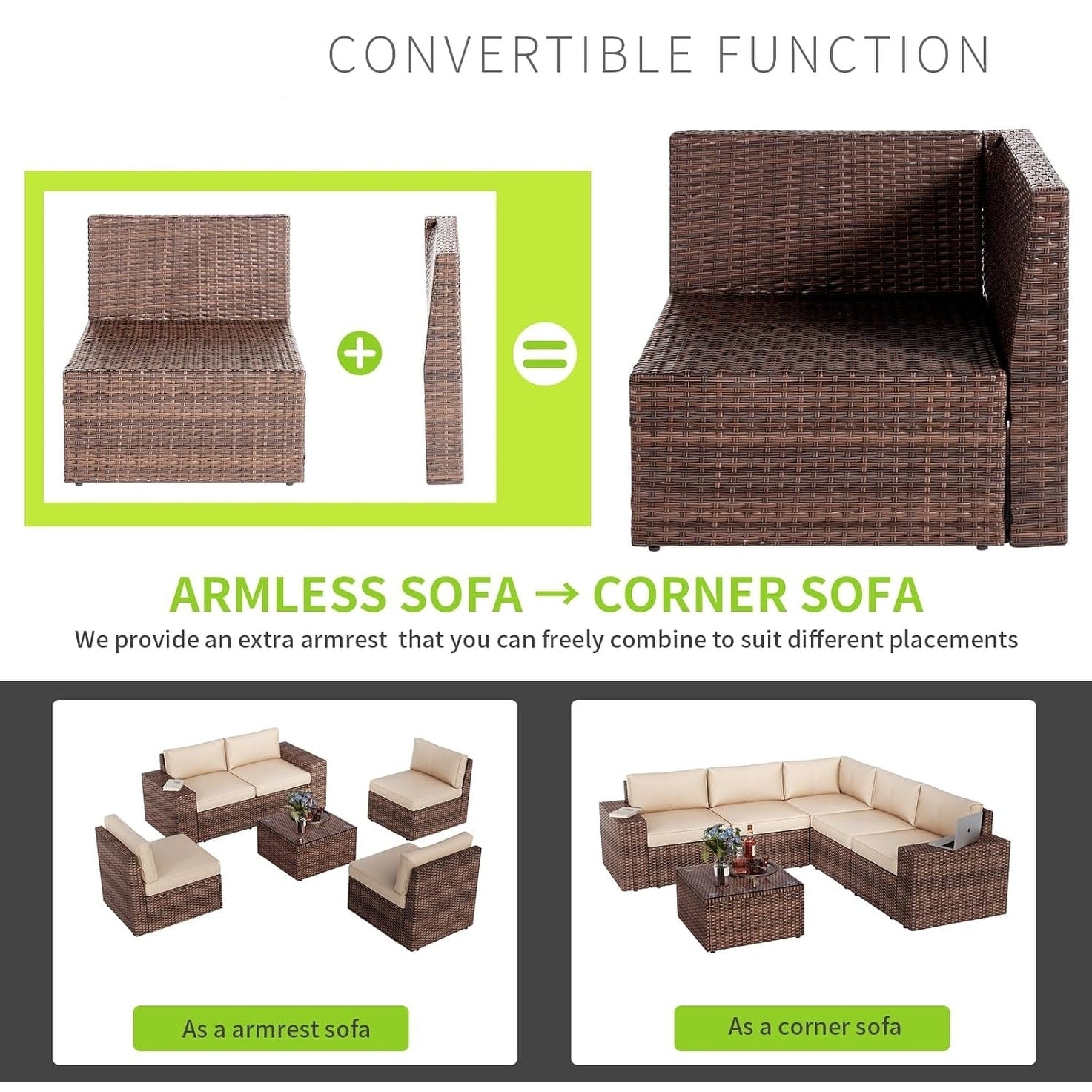 • Set di mobili da giardino trasformabile Il set di mobili da giardino è progettato per garantire grande mobilità e flessibilità. Più in dettaglio, è composto da 1 divano con bracciolo sinistro, 1 divano con bracciolo destro, 2 divani senza braccioli, 1 tavolino da caffè in vetro temperato, 1 tavolino laterale, 2 sedie da giardino in vimini, 1 tavolo con braciere ad accensione elettronica e 1 divano angolare, che consente di adattare la disposizione dei posti a sedere. Il divano angolare è trasformabile in quanto offriamo anche uno schienale aggiuntivo che consente di trasformare il divano angolare in un divano senza braccioli.