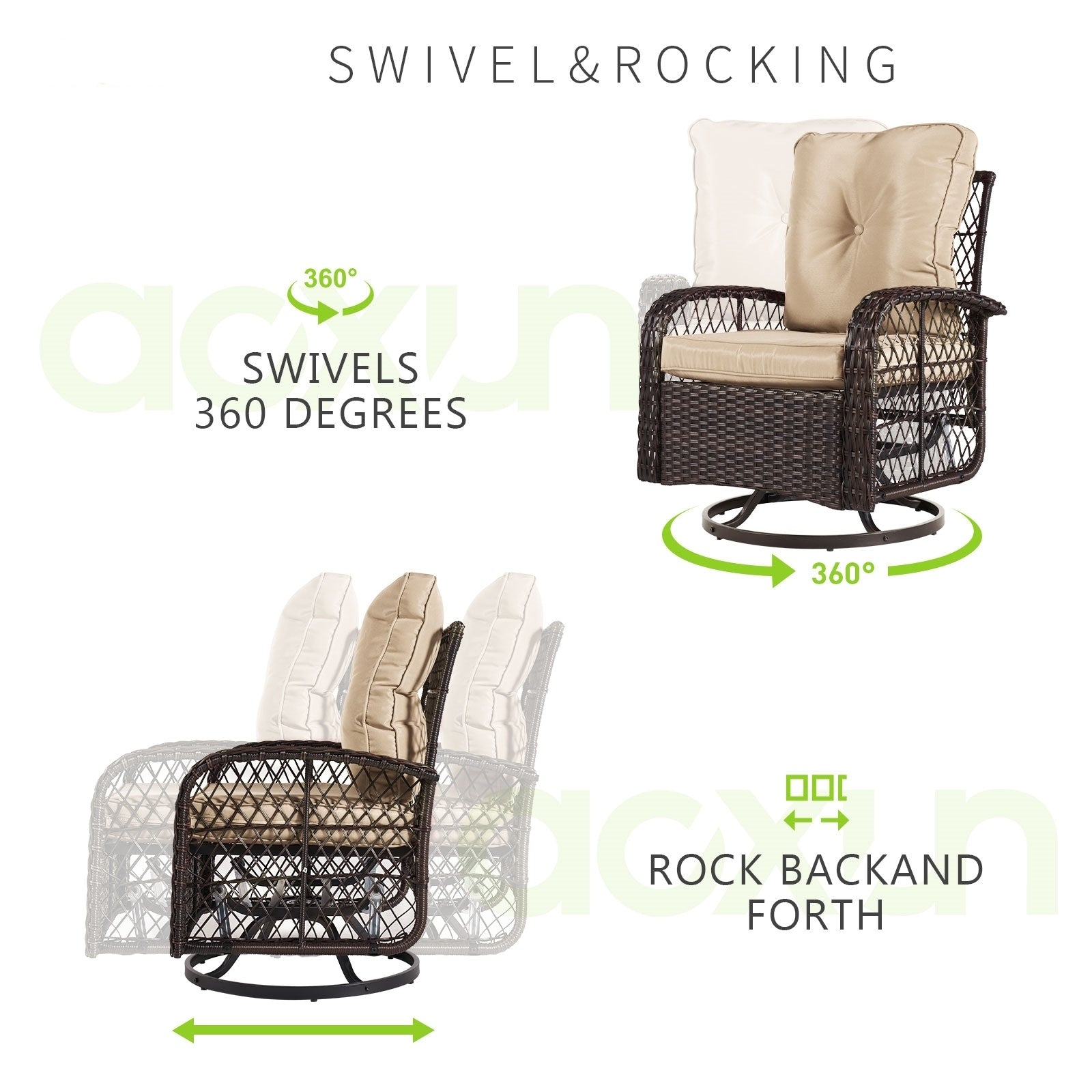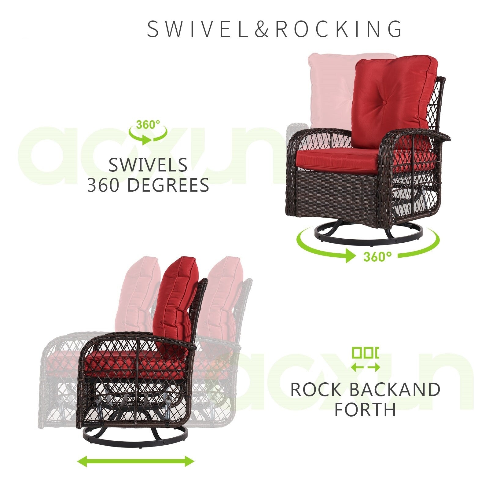 • Sedia a dondolo girevole a 360° e tavolino laterale esclusivo. Le sedie da giardino possono ruotare di 360 gradi, garantendo la massima mobilità. Gli utenti possono facilmente ruotare la sedia per orientarla in qualsiasi direzione senza doverla spostare fisicamente. Il piano del tavolino è realizzato in vetro temperato con superficie a effetto acqua, aggiungendo un tocco di unicità al fascino generale. Il design a doppio strato offre ampio spazio per esporre gli oggetti.