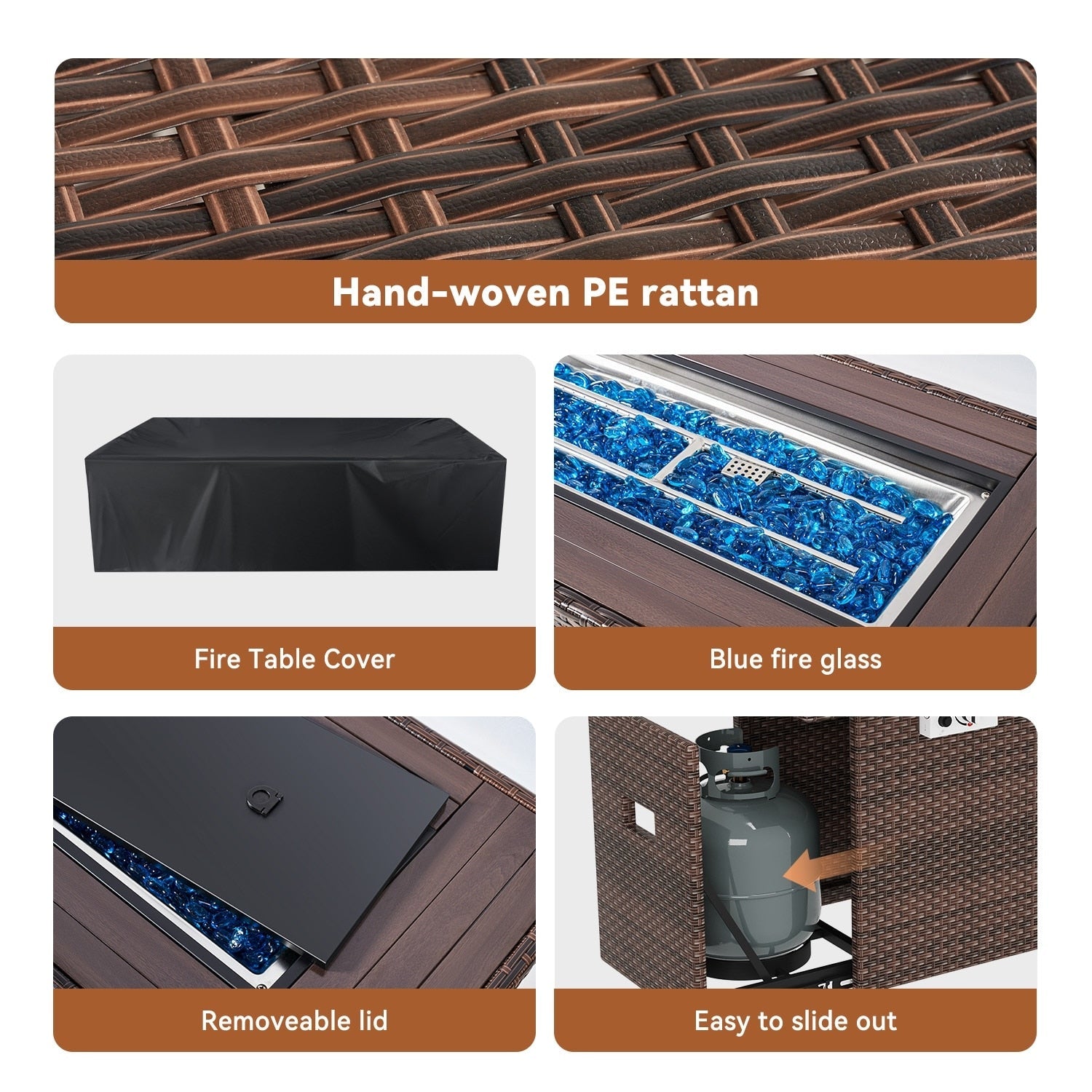 • Tavolo braciere da 44' Il nostro braciere a propano per patio è certificato CSA, affidabile e sicuro per l'uso quotidiano. Sul lato sinistro è presente uno spazio di stoccaggio progettato per riporre vari oggetti. Dotato di accensione elettronica, è facile da accendere e spegnere. Il calore può raggiungere i 60000 BTU. (Nota: il serbatoio del gas più il propano devono pesare meno di 20 libbre e il serbatoio del gas non è incluso).