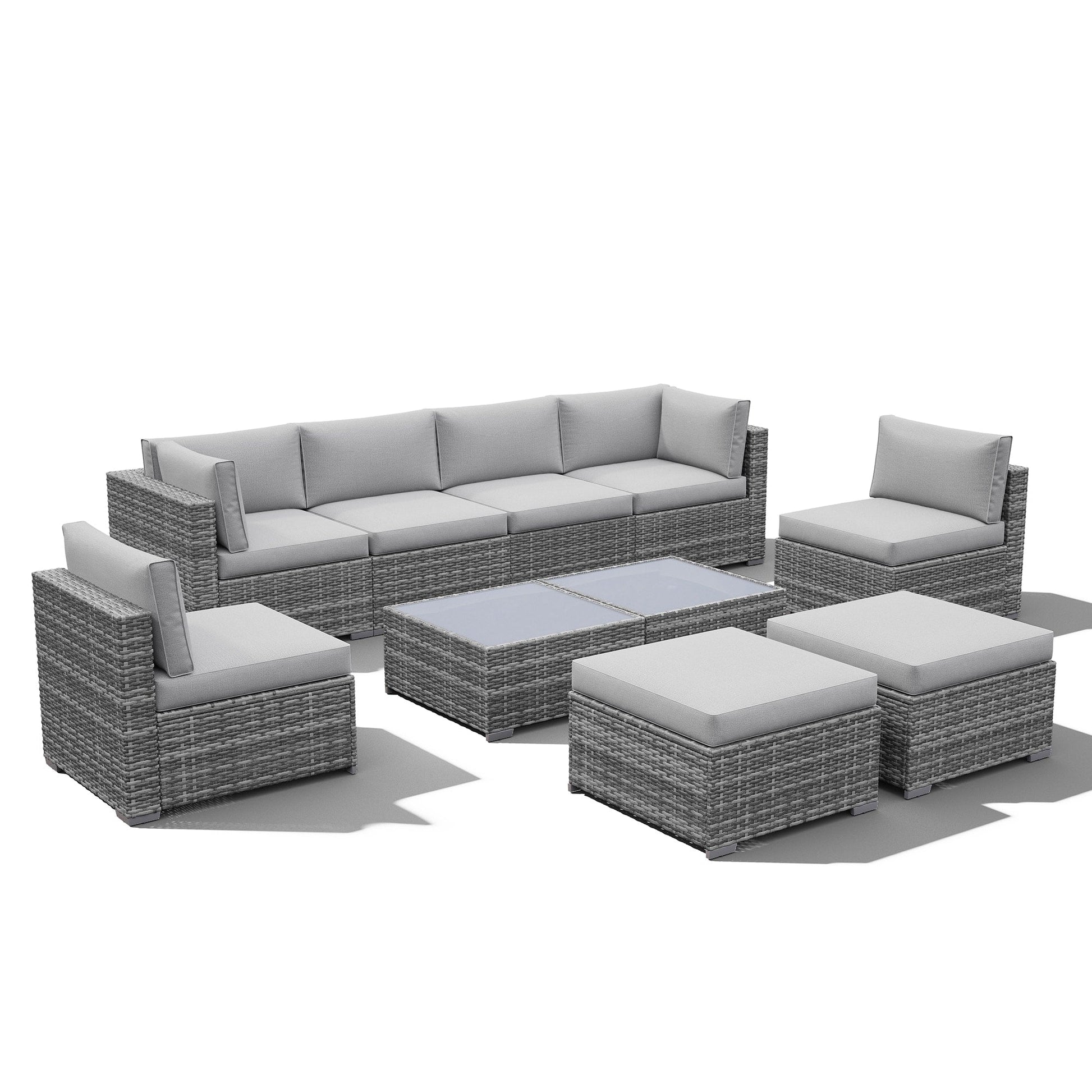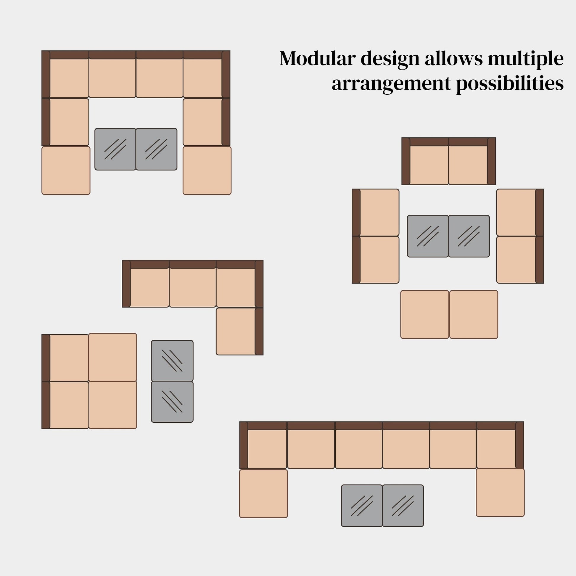 • Include 2 divani angolari, 4 divani senza braccioli, 2 pouf e 2 tavolini laterali