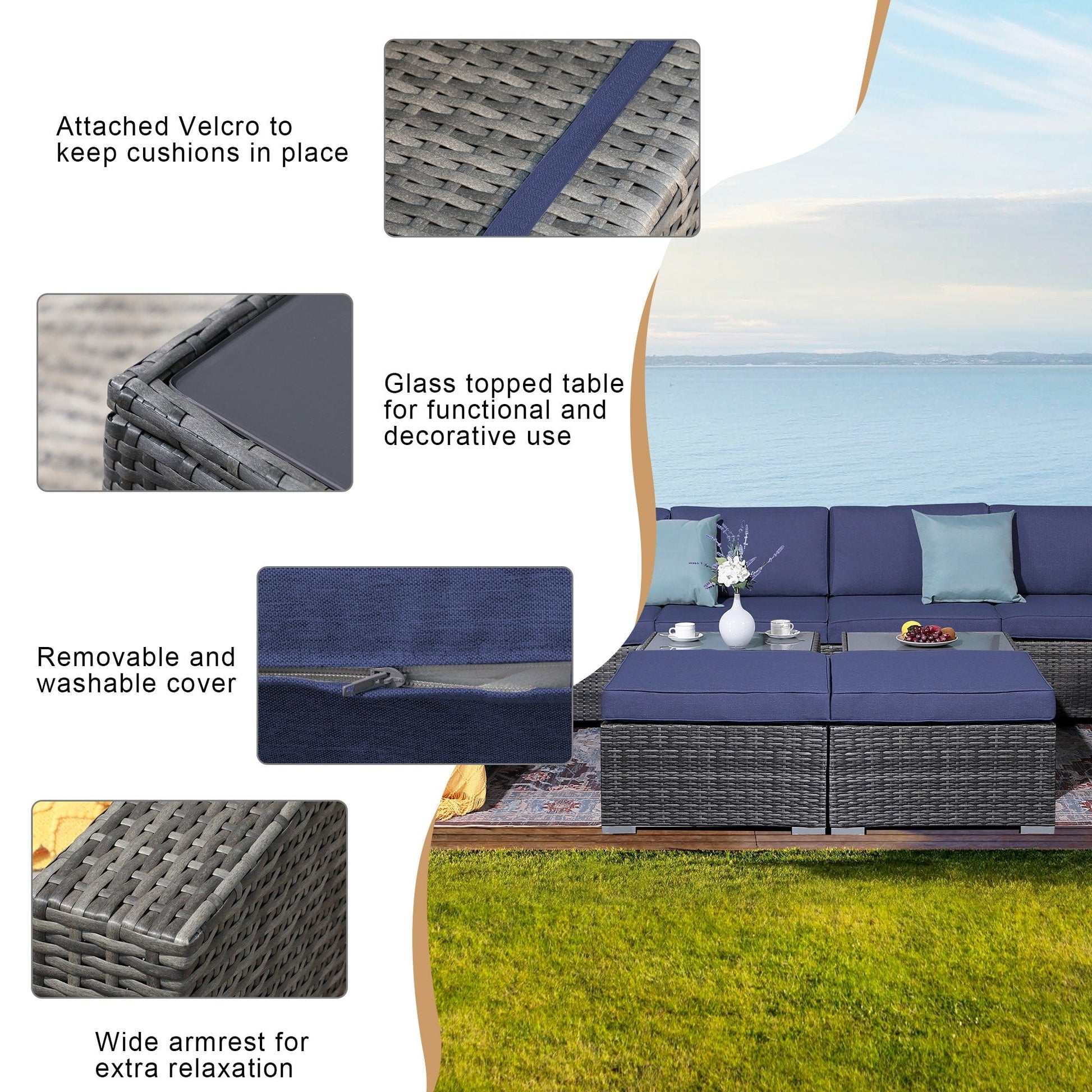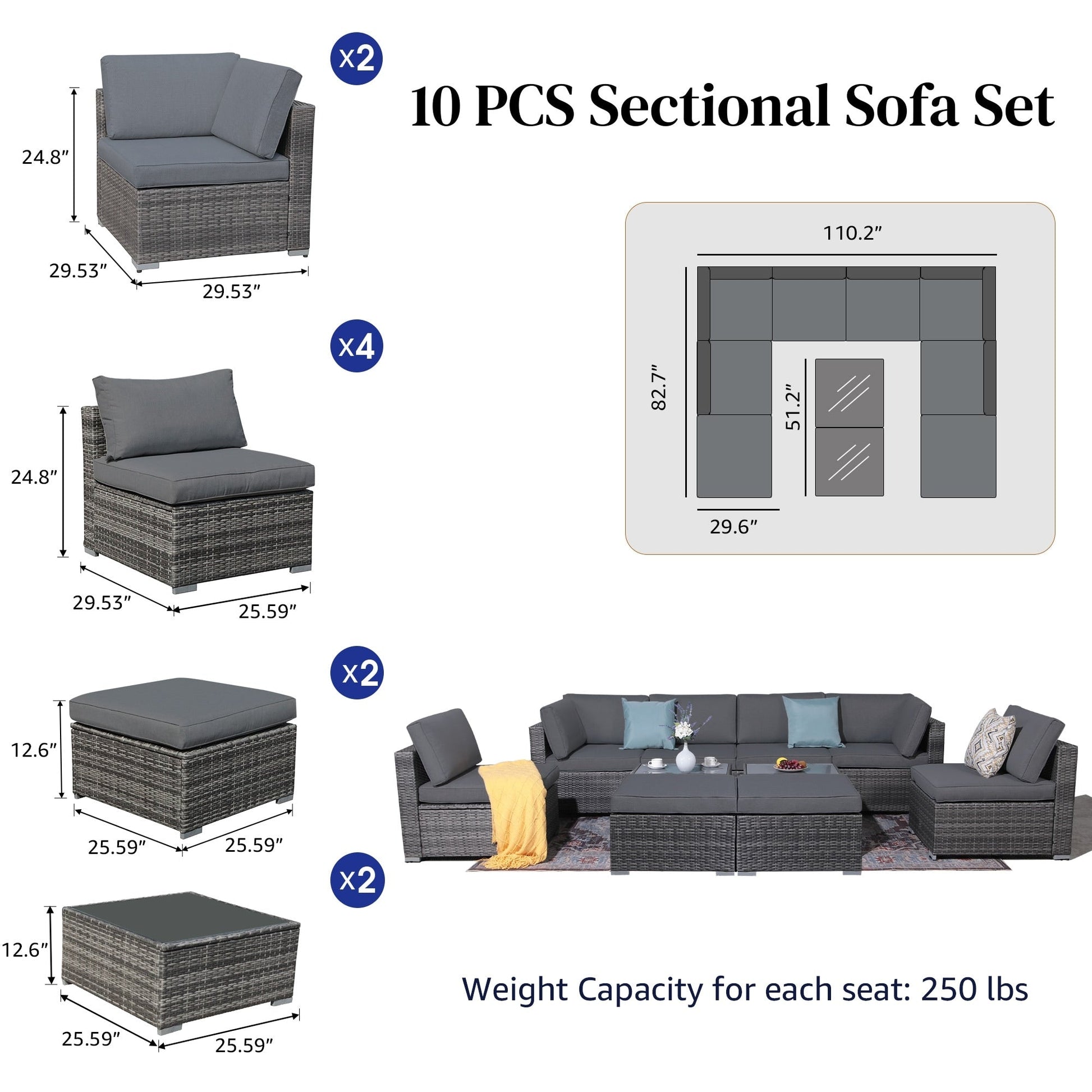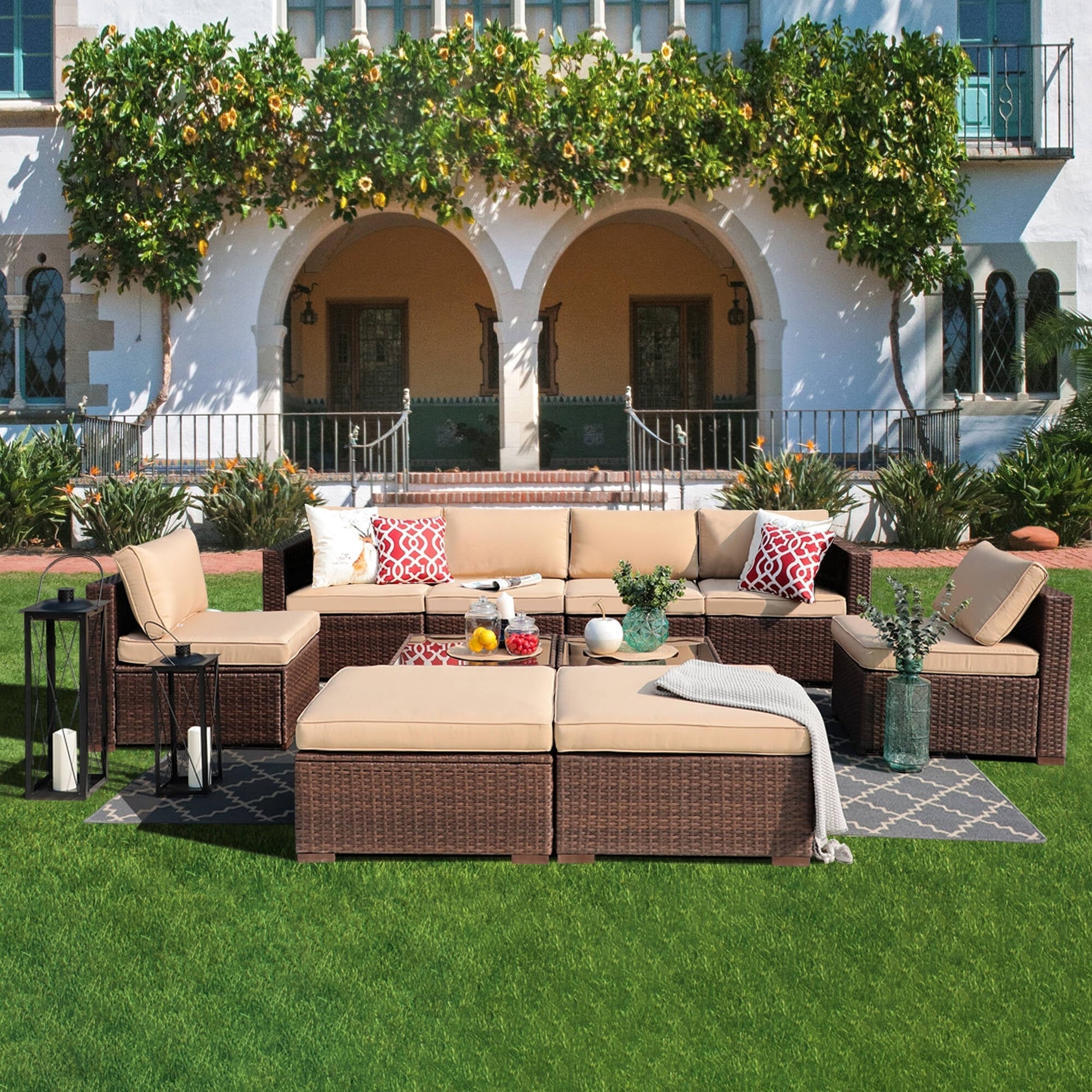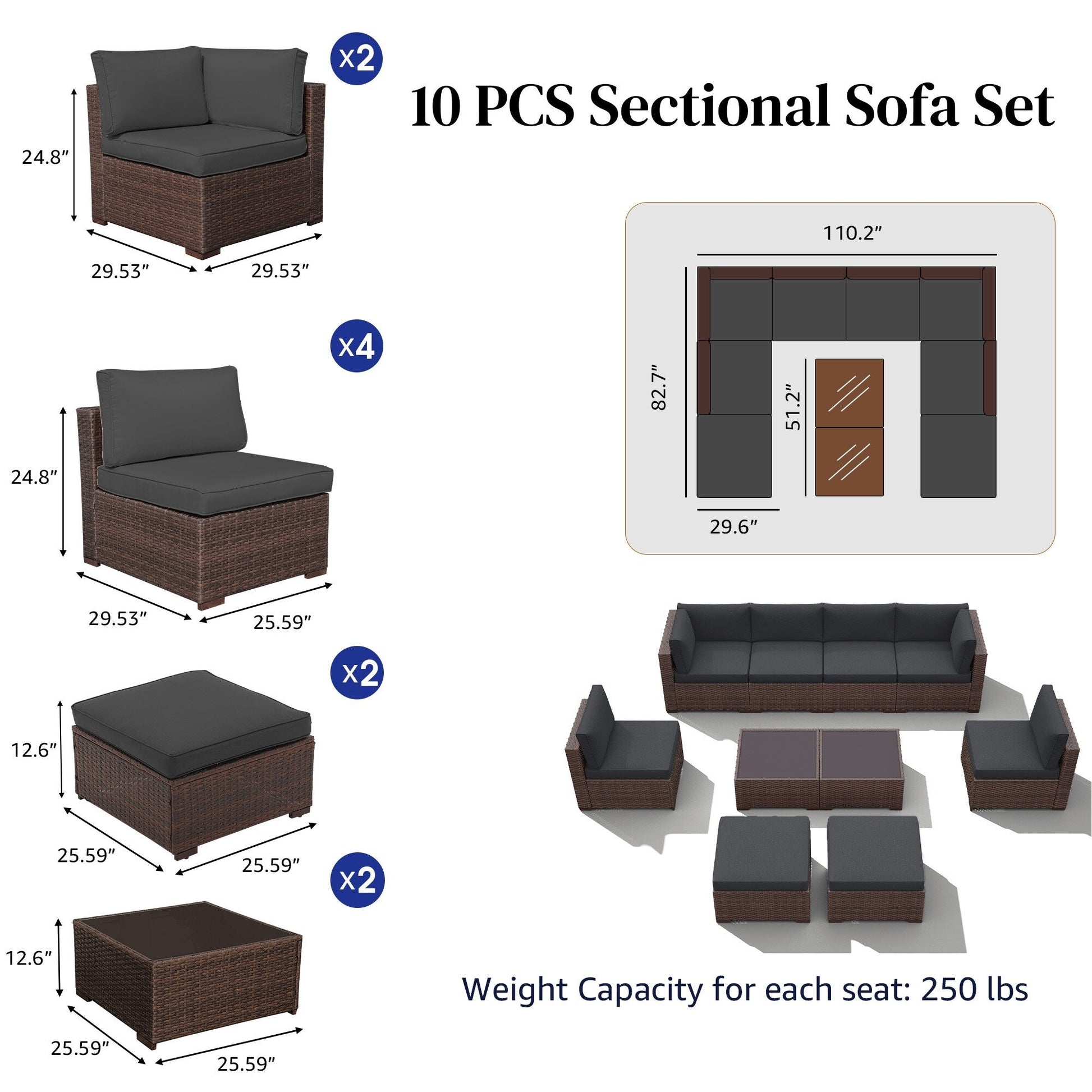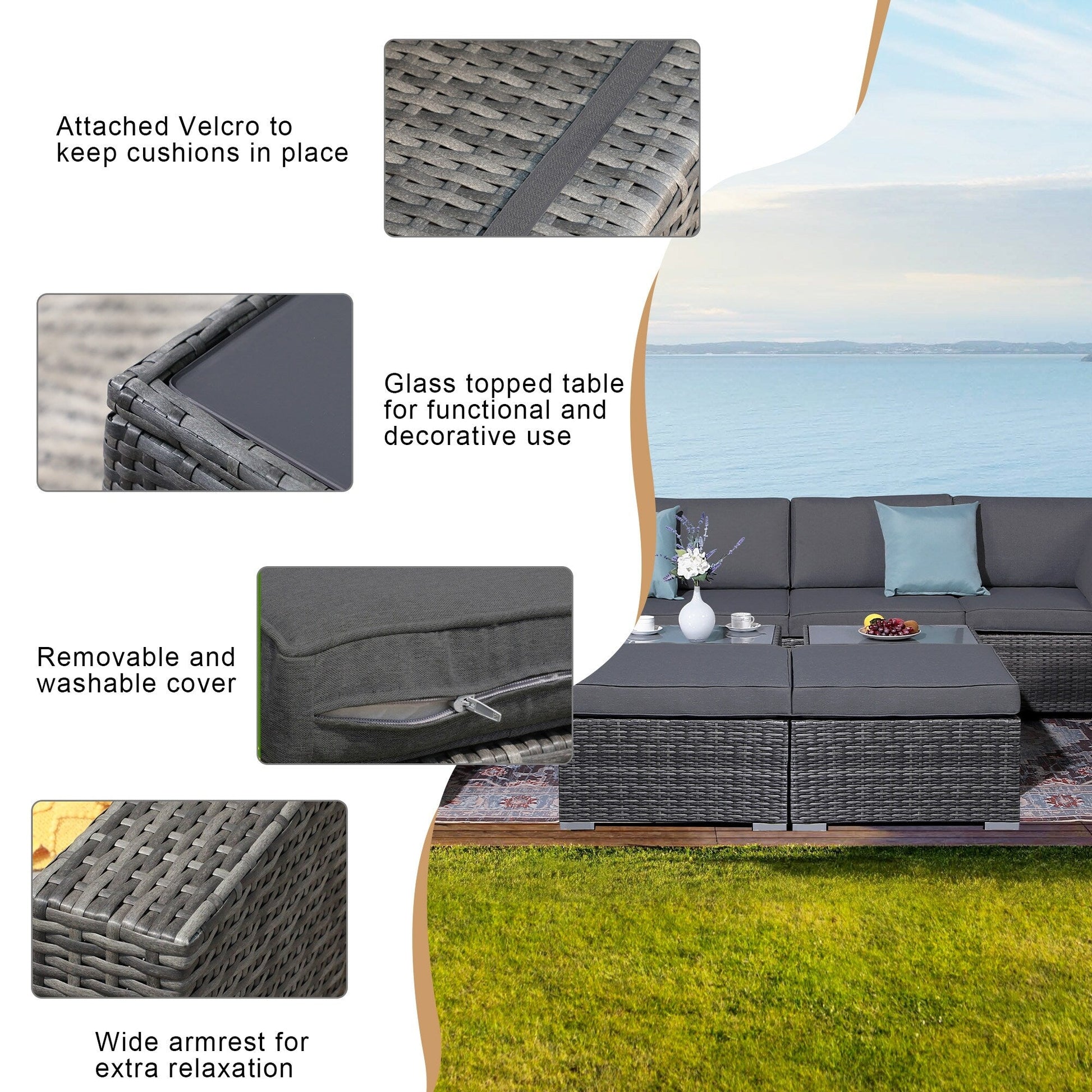 Valorizza il tuo spazio esterno con il nostro set di divani componibili in vimini da 10 pezzi. Realizzato con una robusta struttura in acciaio e vimini resistente, è progettato per resistere agli agenti atmosferici. Immergiti nei cuscini imbottiti in spugna che mantengono la loro forma nel tempo, offrendoti un comfort eccezionale. Il set include due pouf e due tavolini laterali, perfetti per ospitare familiari e amici. Scegli tra diverse combinazioni in base alle tue esigenze e al tuo stile.