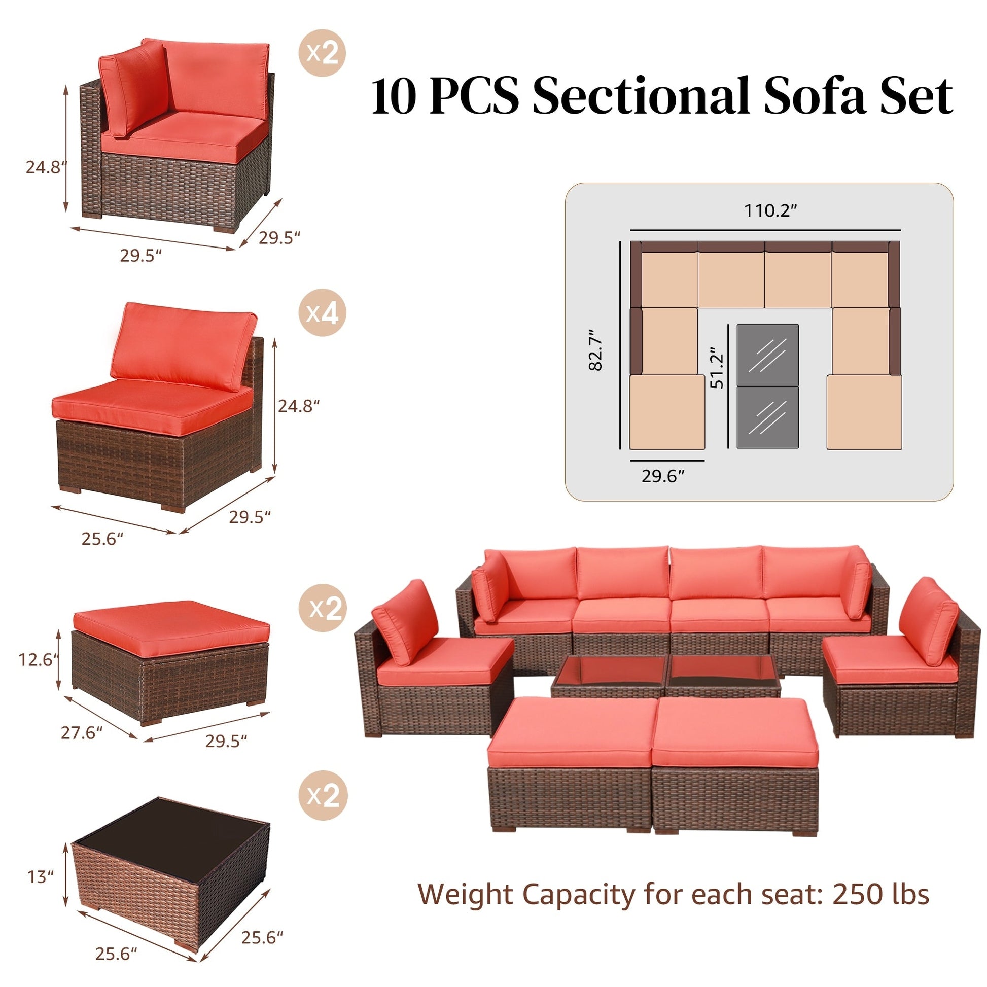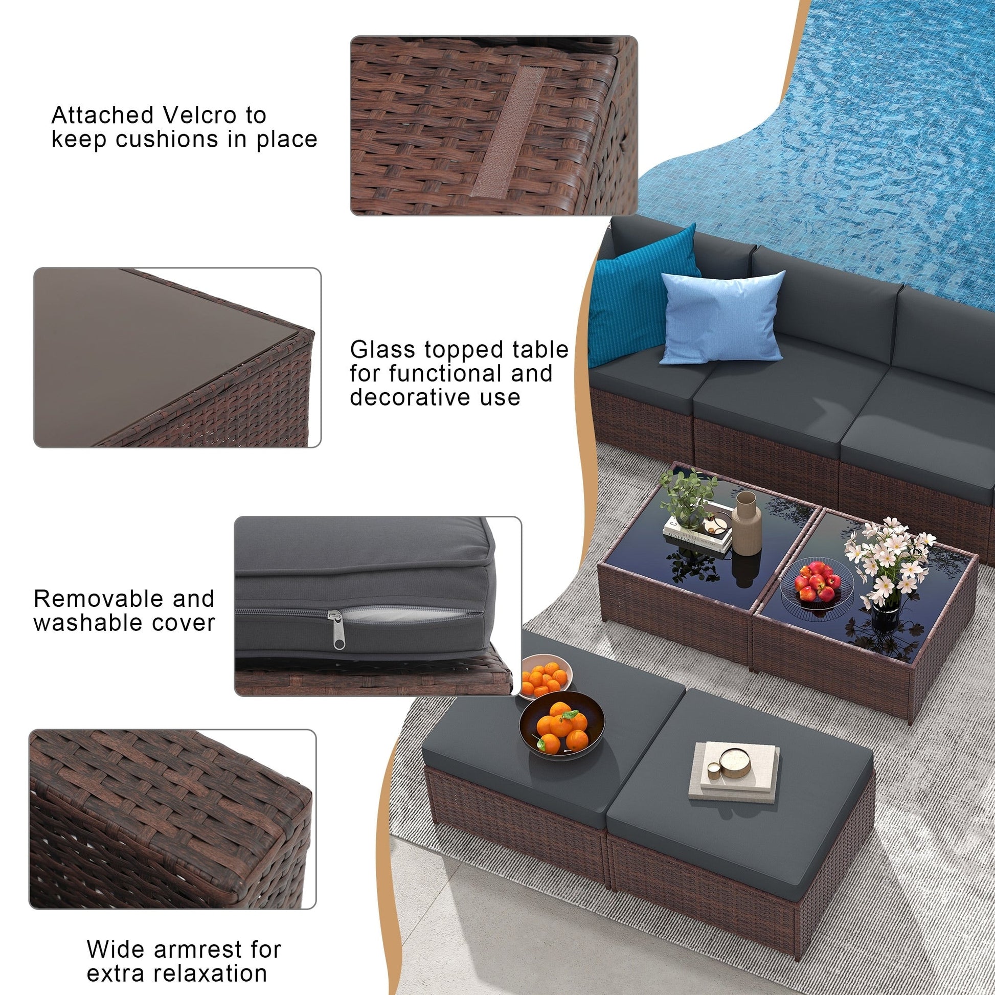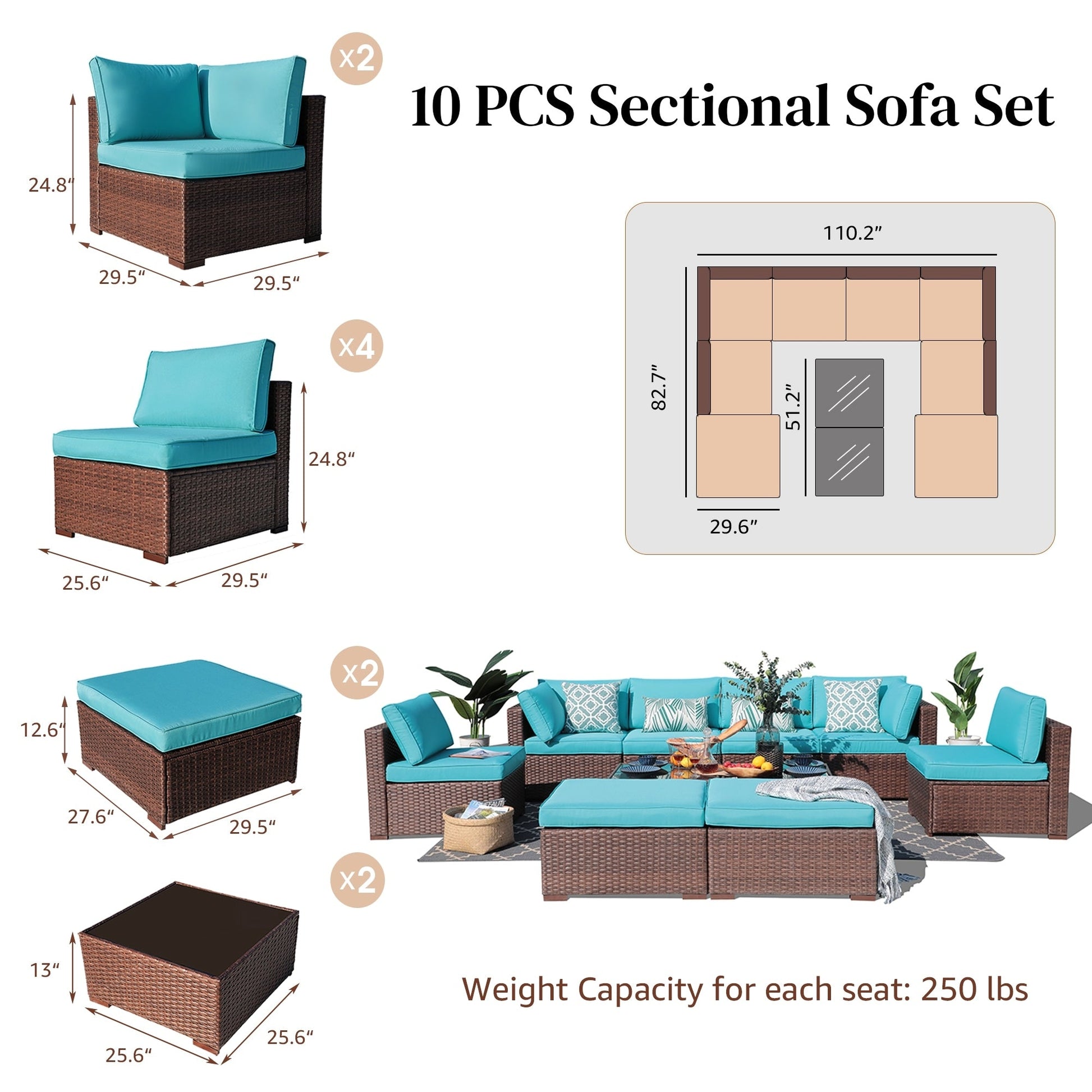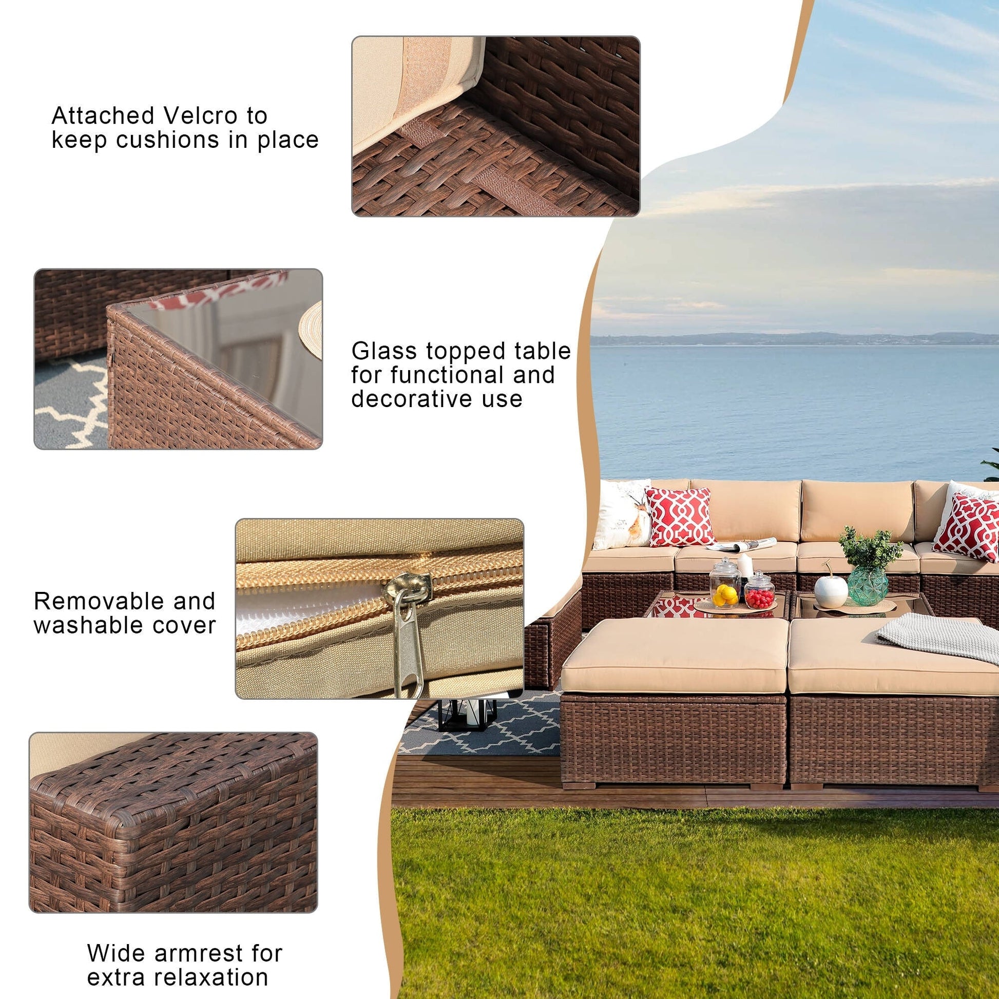 Valorizza il tuo spazio esterno con il nostro set di divani componibili in vimini da 10 pezzi. Realizzato con una robusta struttura in acciaio e vimini resistente, è progettato per resistere agli agenti atmosferici. Immergiti nei cuscini imbottiti in spugna che mantengono la loro forma nel tempo, offrendoti un comfort eccezionale. Il set include due pouf e due tavolini laterali, perfetti per ospitare familiari e amici. Scegli tra diverse combinazioni in base alle tue esigenze e al tuo stile.