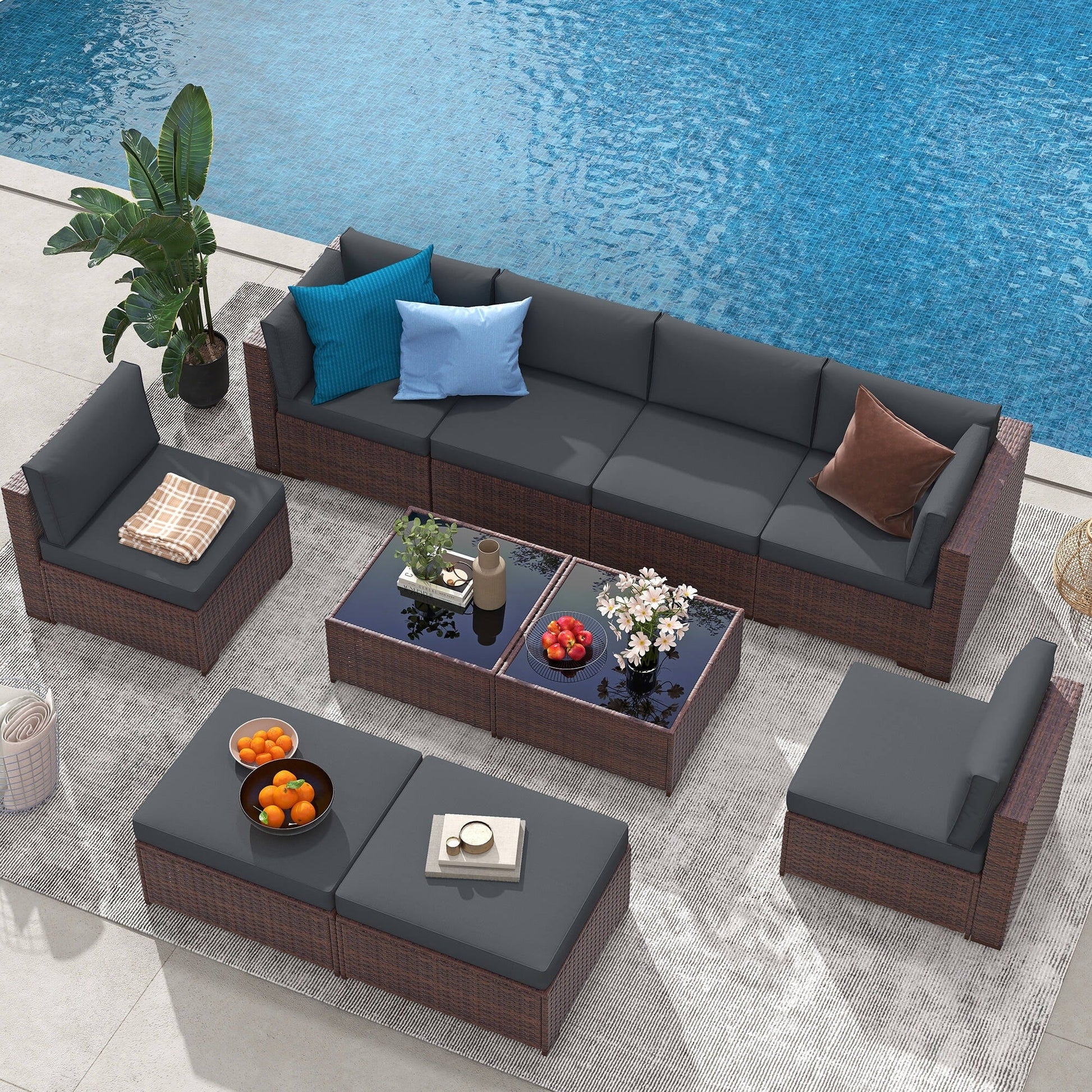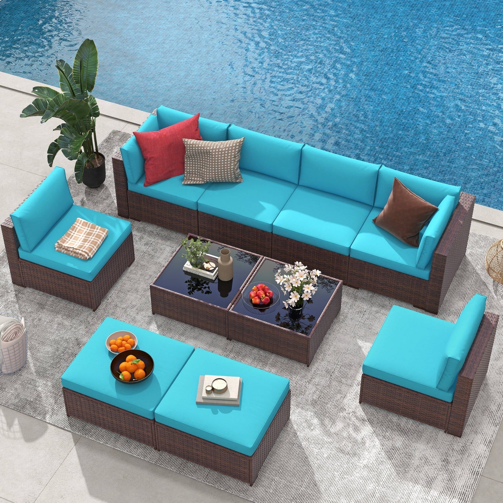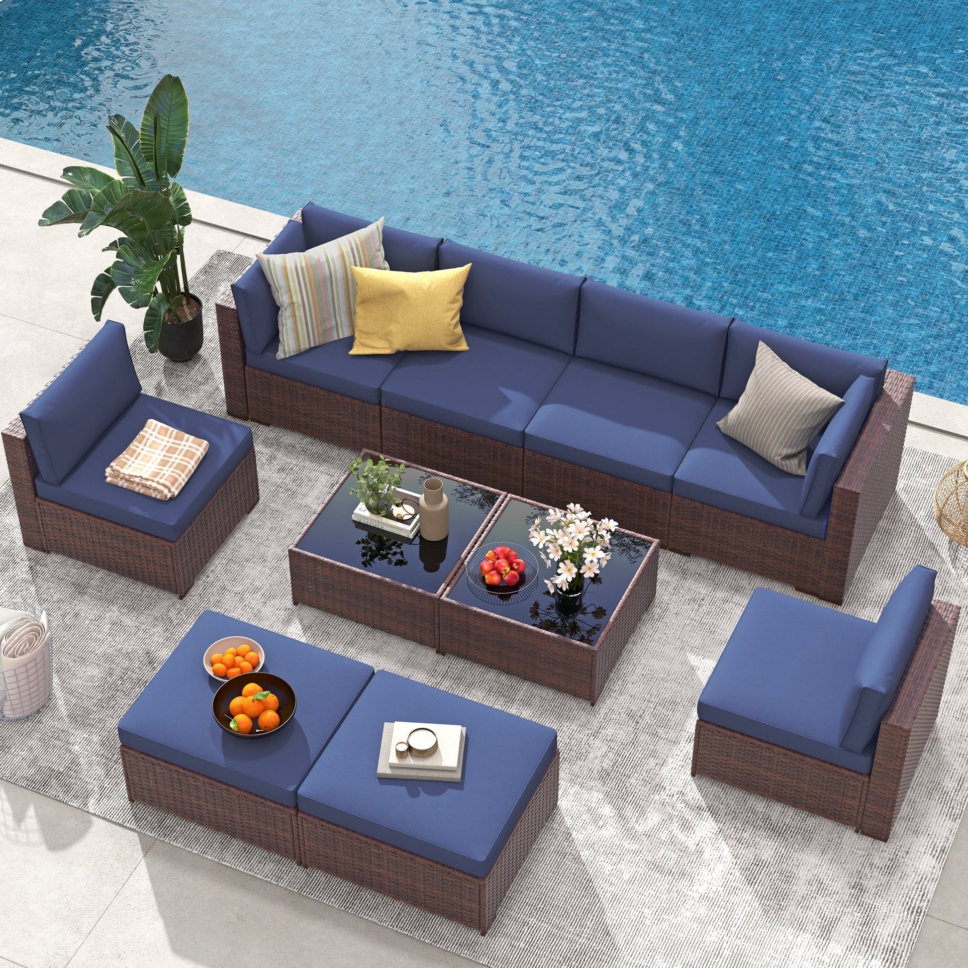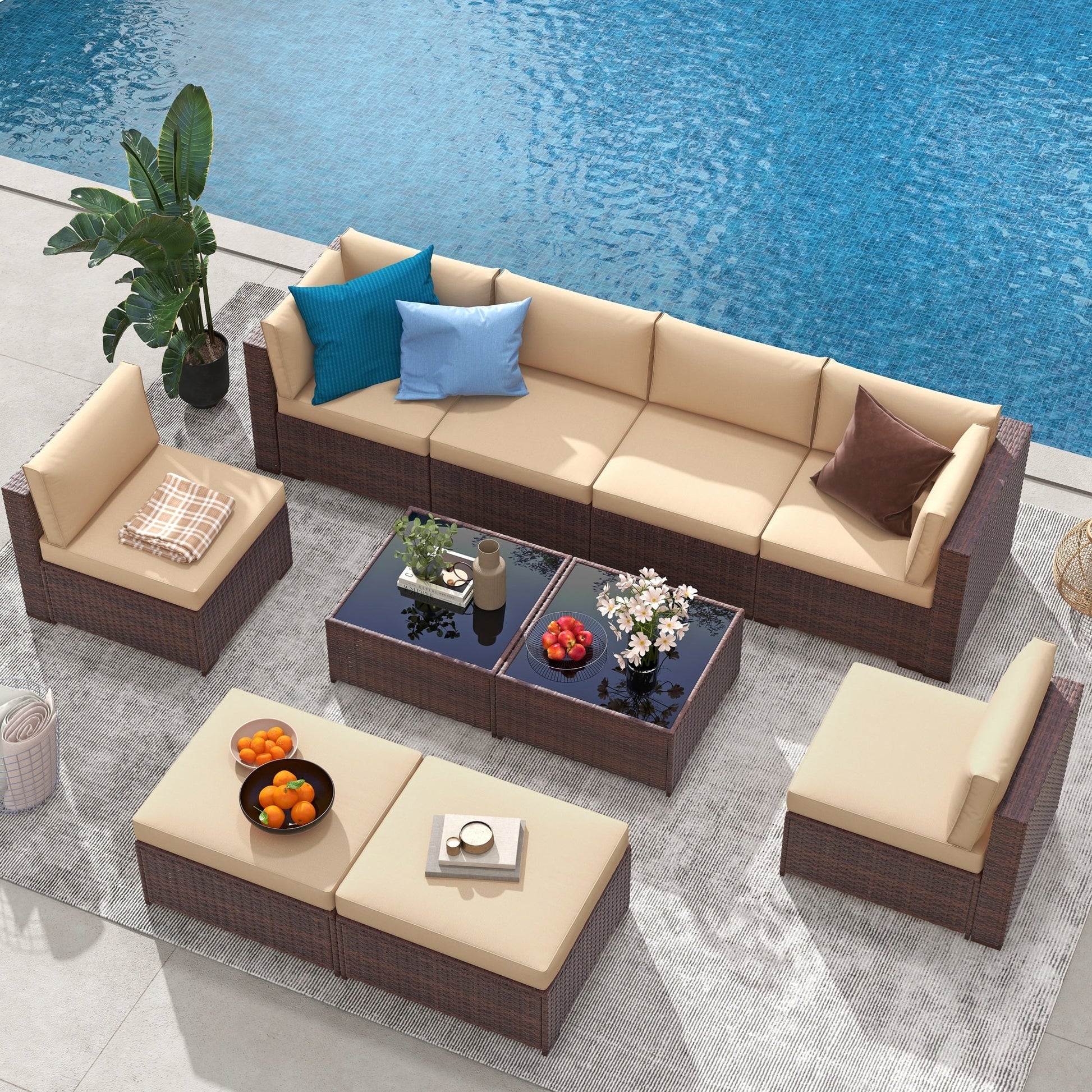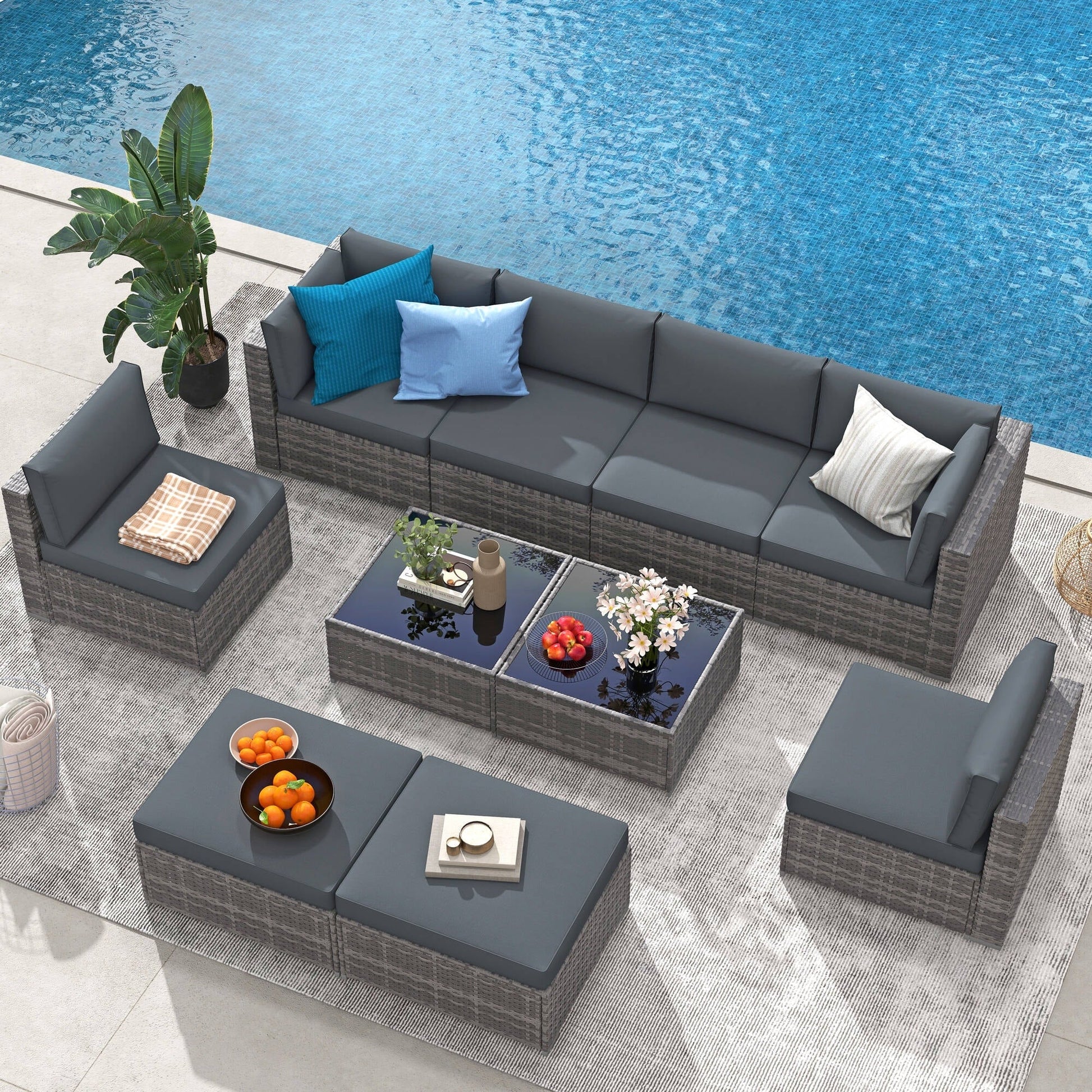 Valorizza il tuo spazio esterno con il nostro set di divani componibili in vimini da 10 pezzi. Realizzato con una robusta struttura in acciaio e vimini resistente, è progettato per resistere agli agenti atmosferici. Immergiti nei cuscini imbottiti in spugna che mantengono la loro forma nel tempo, offrendoti un comfort eccezionale. Il set include due pouf e due tavolini laterali, perfetti per ospitare familiari e amici. Scegli tra diverse combinazioni in base alle tue esigenze e al tuo stile.