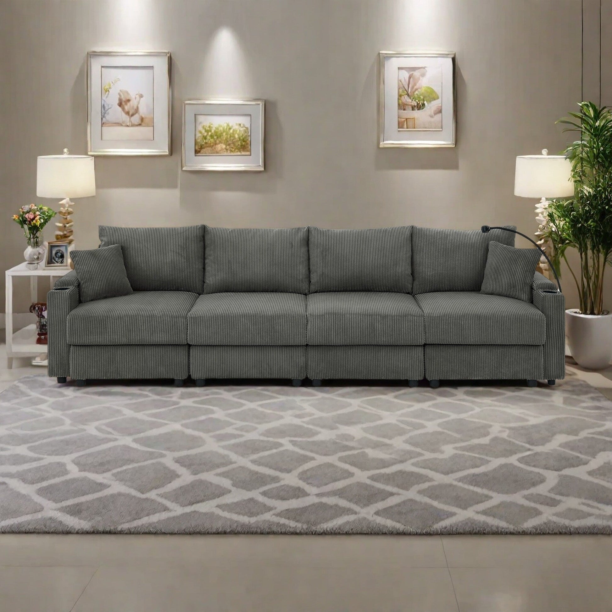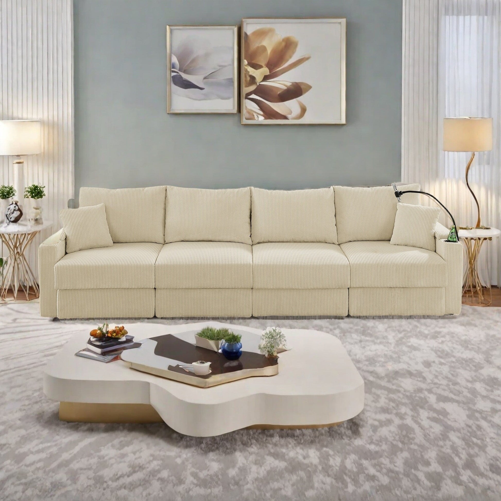 Divano 5 posti in velluto a coste 132 con portabicchieri e portatelefono, cuscini ad alta densità