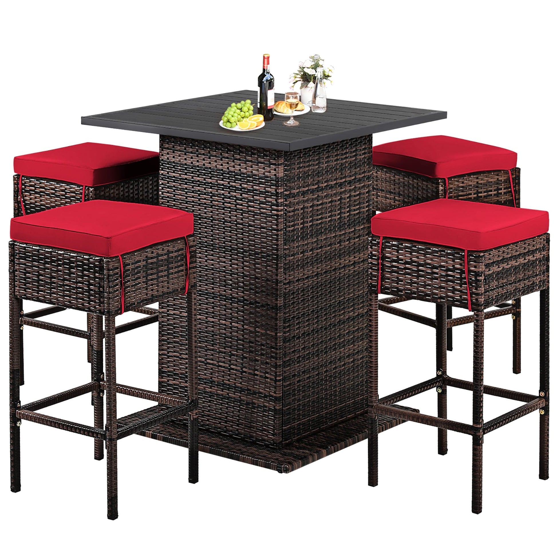 Set da bar per esterni in rattan da 5 pezzi, mobili da bar per patio con cuscini e sgabelli