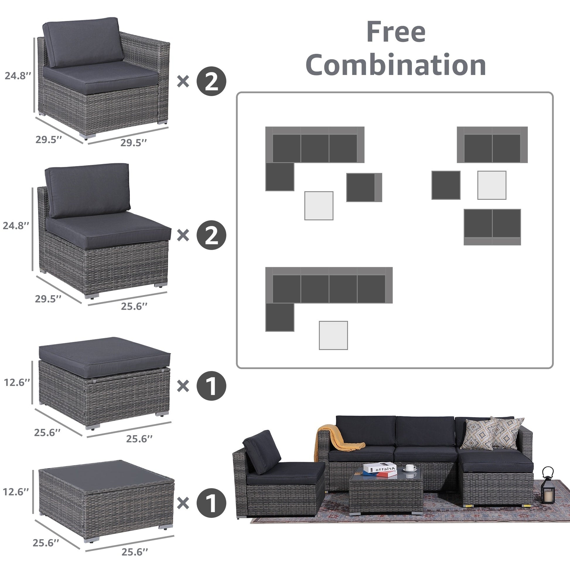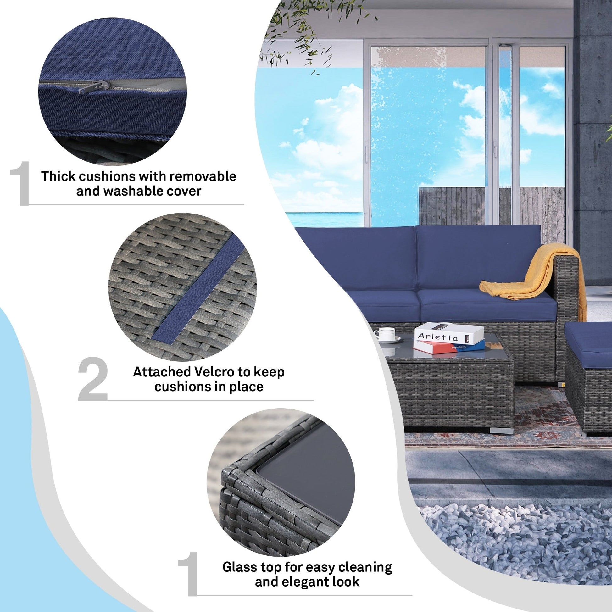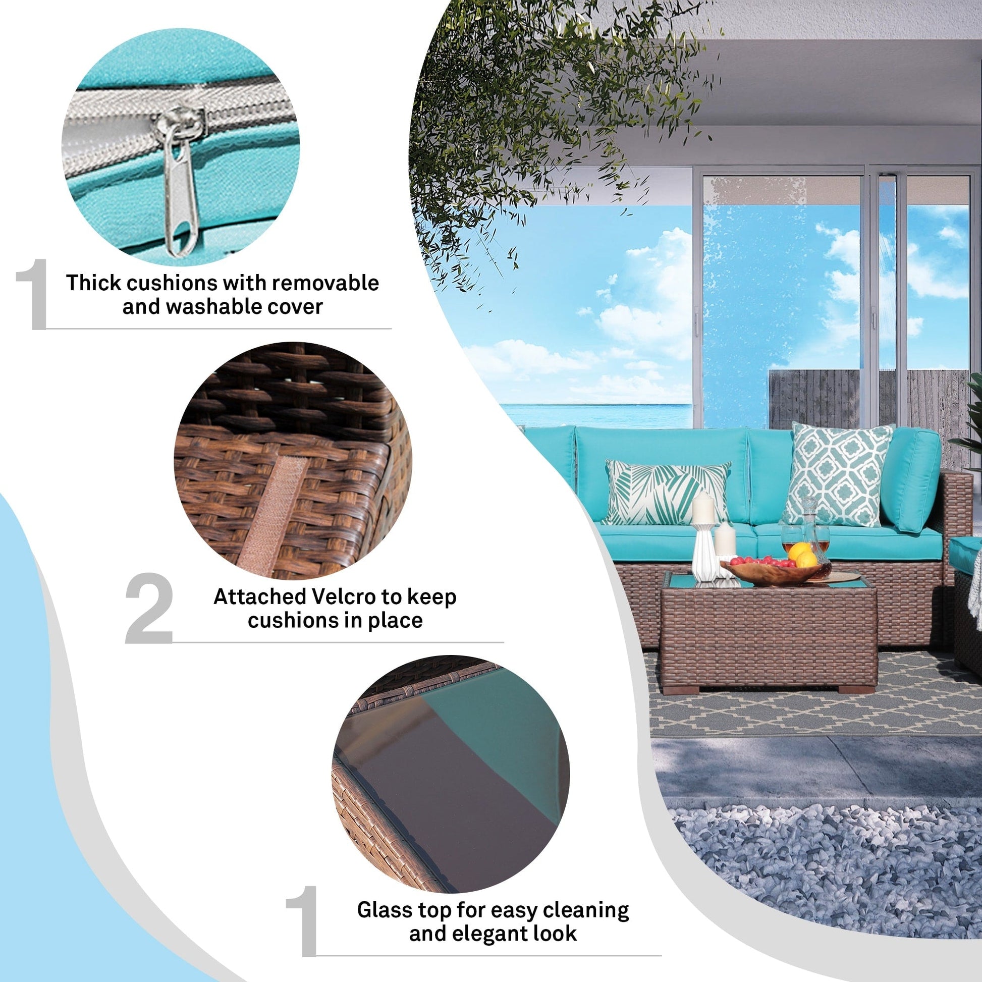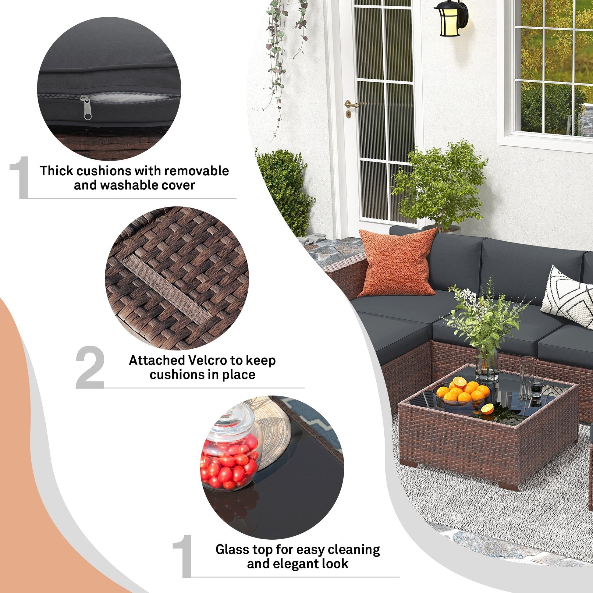 Rilassati con stile con questo set di divani componibili da esterno in vimini da 6 pezzi. Realizzato con una resistente struttura in acciaio e vimini resistente alle intemperie, questo set è progettato per resistere agli agenti atmosferici. I cuscini morbidi e colorati sono realizzati con imbottitura in spugna per un maggiore comfort, e il tavolino da caffè con piano in vetro incluso è perfetto per gustare i tuoi drink e snack preferiti. Con diverse opzioni di seduta, fodere per cuscini rimovibili e lavabili e un facile montaggio, questo set è perfetto per creare versatili soluzioni di seduta all'aperto.