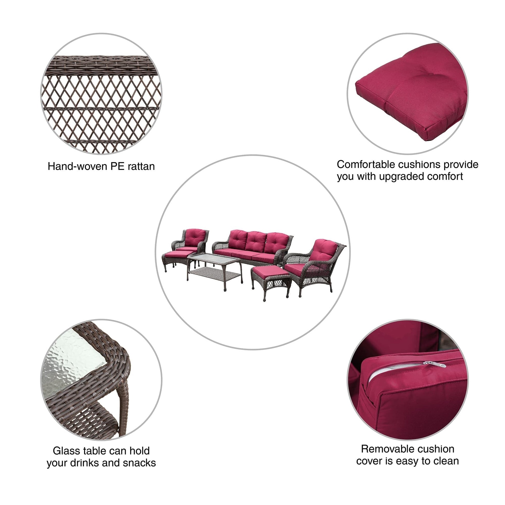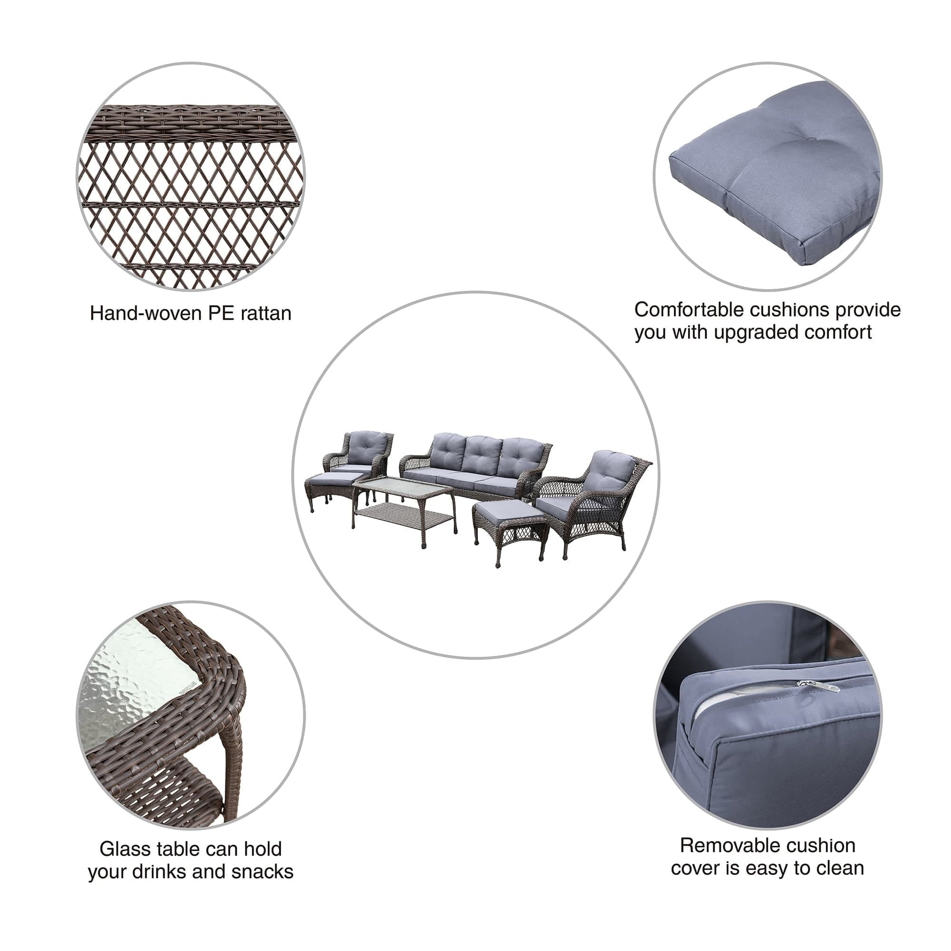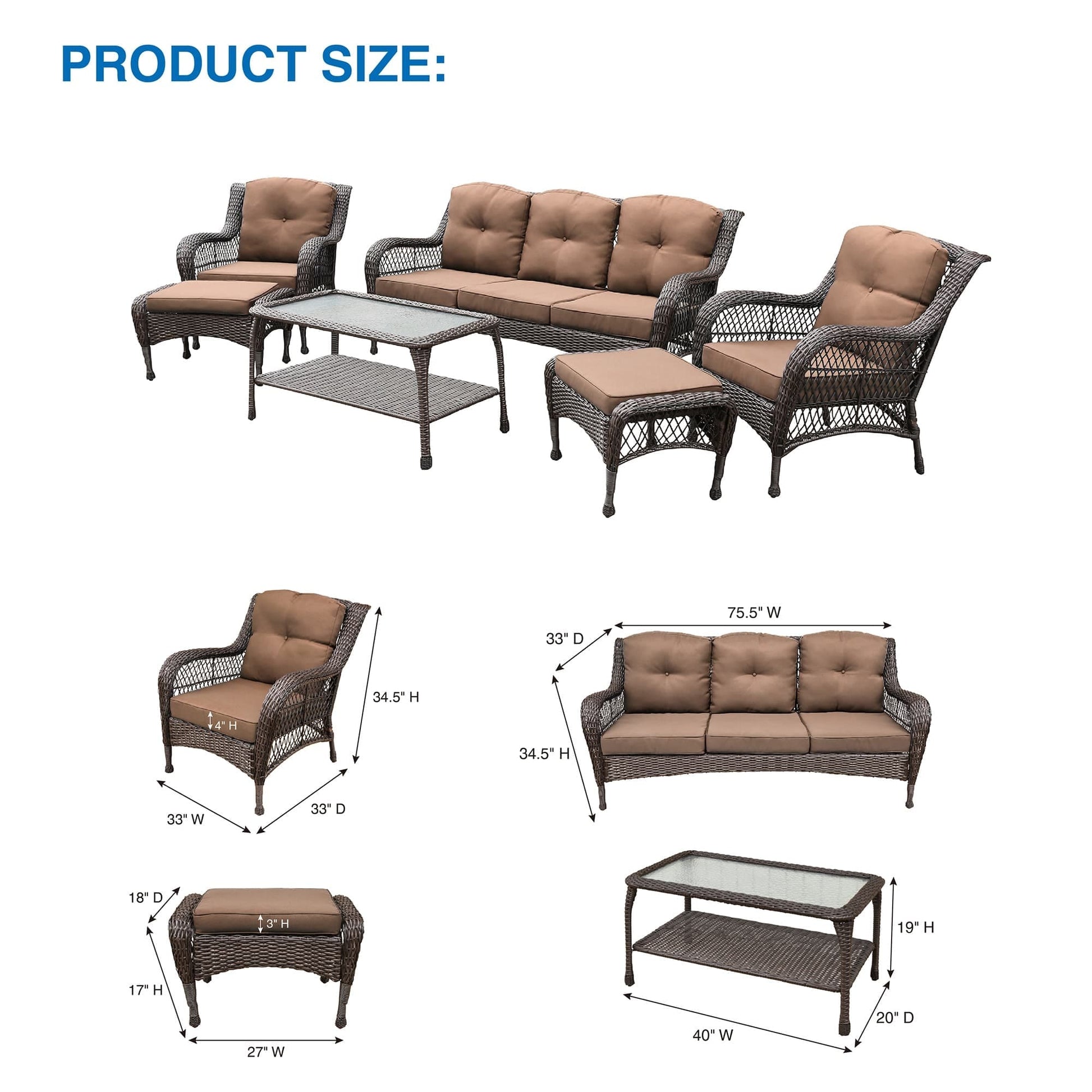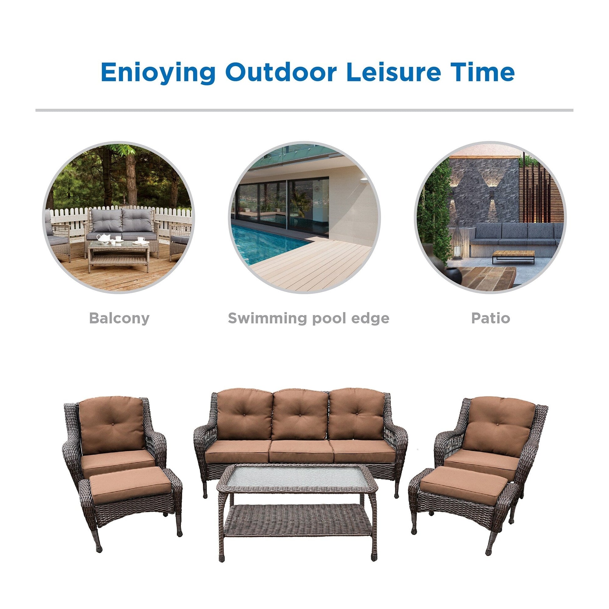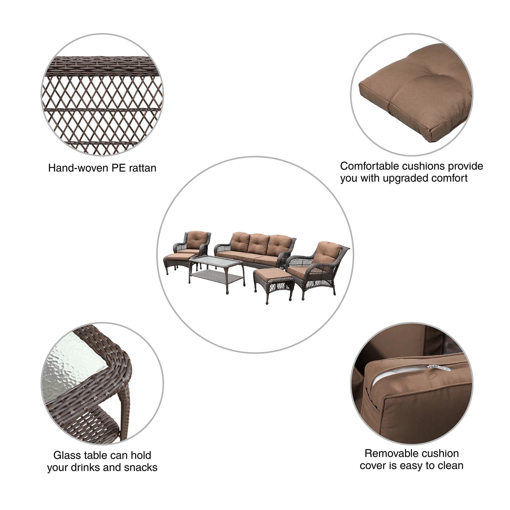 Godetevi l'aria aperta in un comfort lussuoso con il nostro set da sei pezzi in resina e vimini da giardino con cuscini per lo schienale alto, perfetto per ospitare incontri intimi. Questo set comprende un divano, due poltrone, due pouf e un tavolino da caffè con piano in vetro, tutti intrecciati a mano con vimini di resina marrone scuro su robuste strutture in acciaio. I cuscini trapuntati a bottoni offrono il massimo comfort, mentre il design resistente alle intemperie e all'acqua consente di godersi l'aria aperta tutto l'anno. La fabbricazione artigianale di qualità commerciale garantisce la durevolezza, mentre la protezione UV garantisce la tenuta del colore. Godetevi il comfort aggiuntivo dei cuscini di seduta e schienale in spugna spessa e la praticità di un facile montaggio.