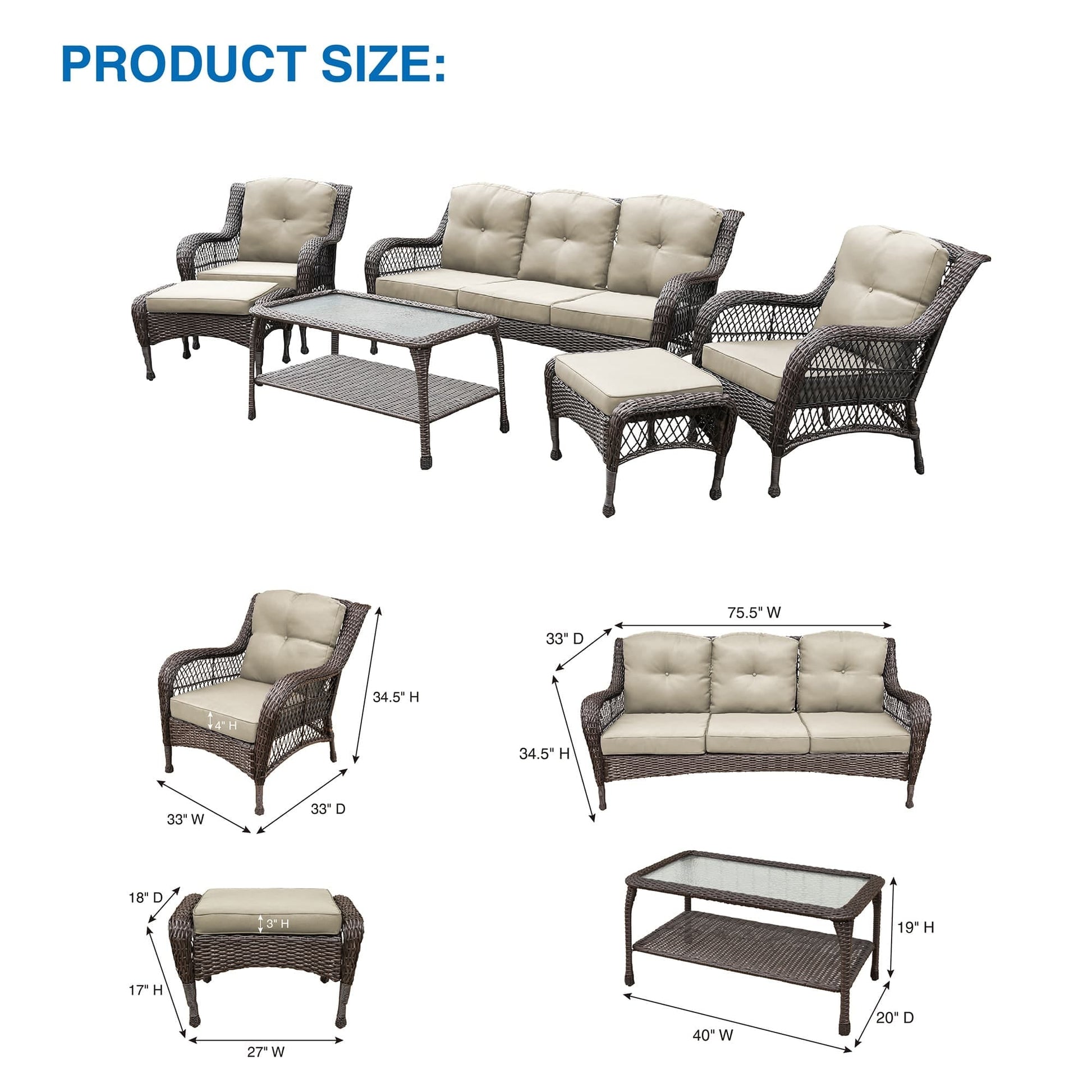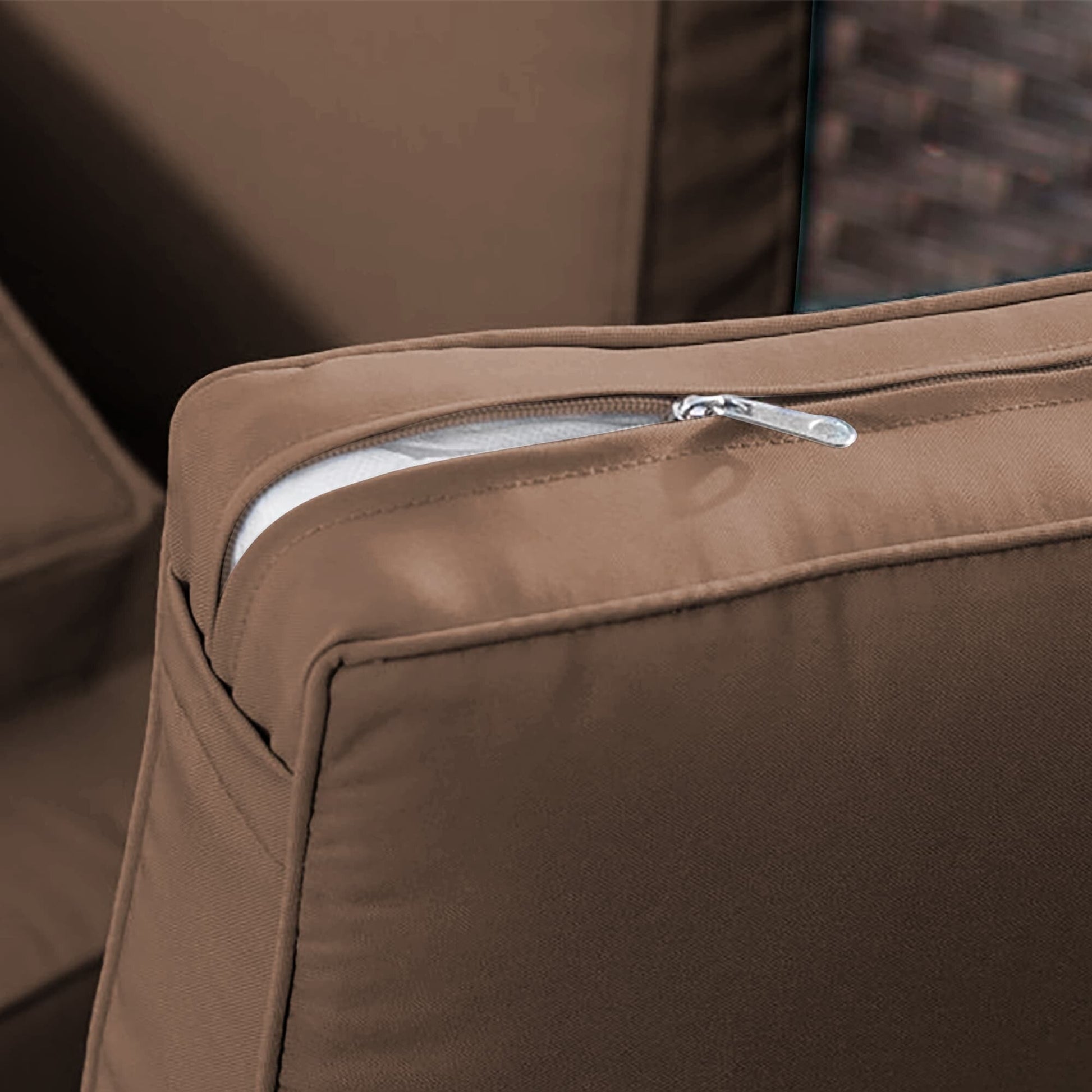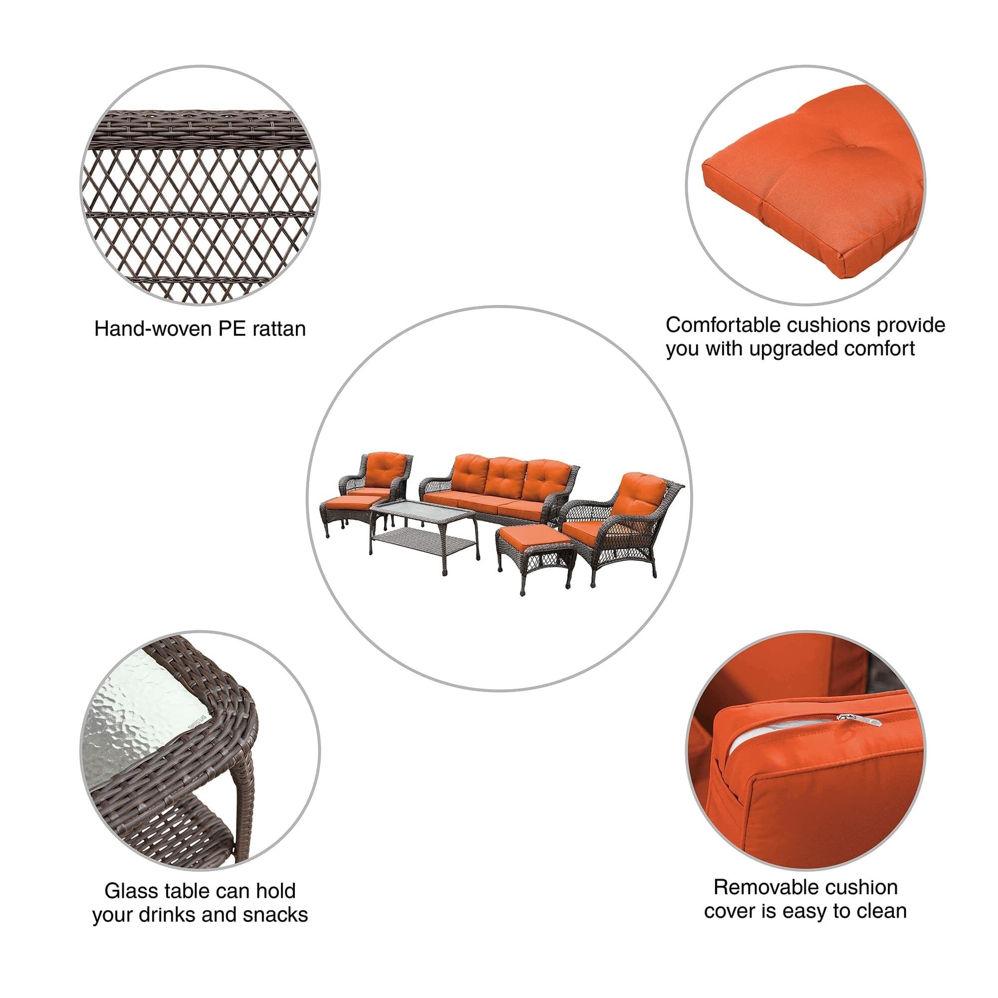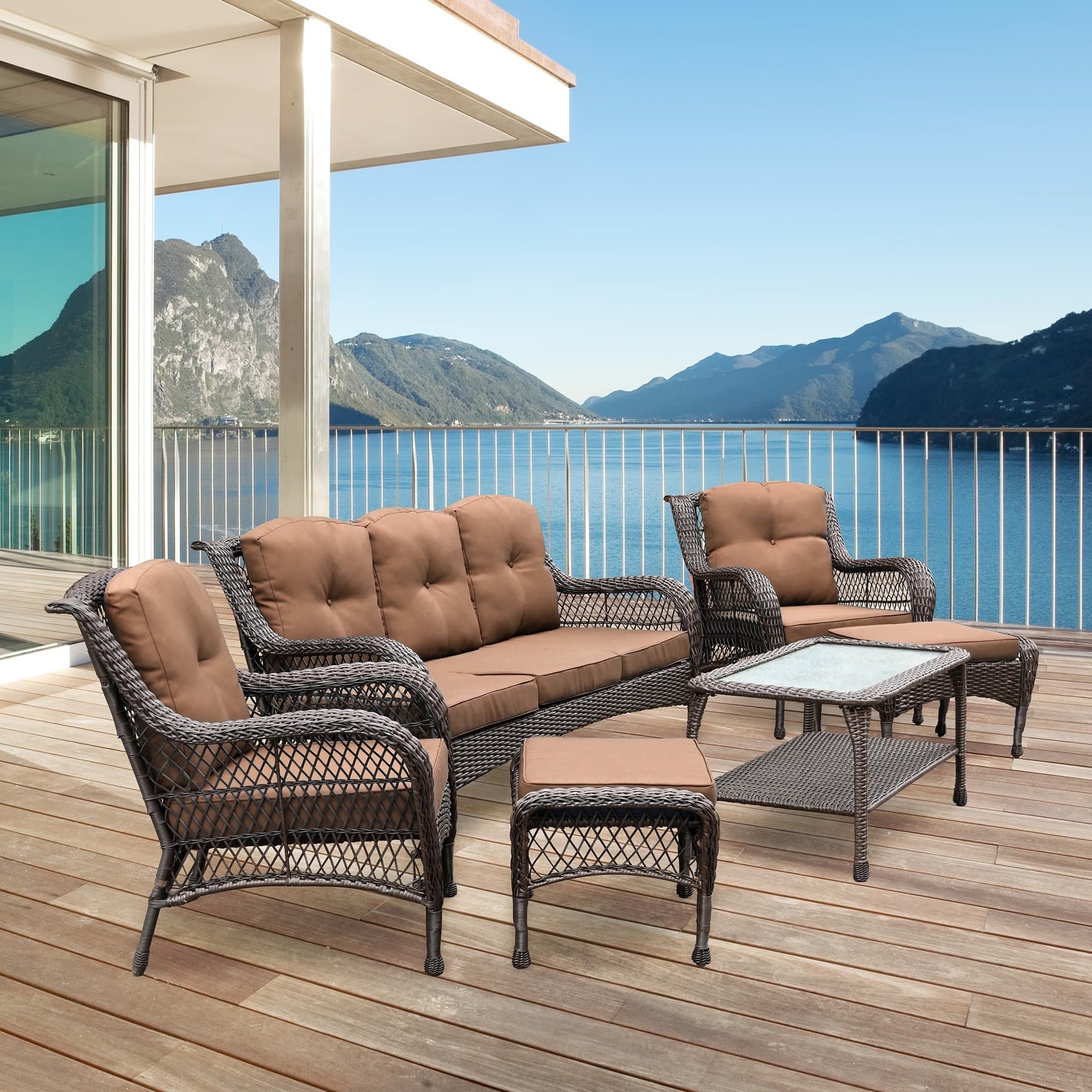 Godetevi l'aria aperta in un comfort lussuoso con il nostro set da sei pezzi in resina e vimini da giardino con cuscini per lo schienale alto, perfetto per ospitare incontri intimi. Questo set comprende un divano, due poltrone, due pouf e un tavolino da caffè con piano in vetro, tutti intrecciati a mano con vimini di resina marrone scuro su robuste strutture in acciaio. I cuscini trapuntati a bottoni offrono il massimo comfort, mentre il design resistente alle intemperie e all'acqua consente di godersi l'aria aperta tutto l'anno. La fabbricazione artigianale di qualità commerciale garantisce la durevolezza, mentre la protezione UV garantisce la tenuta del colore. Godetevi il comfort aggiuntivo dei cuscini di seduta e schienale in spugna spessa e la praticità di un facile montaggio.