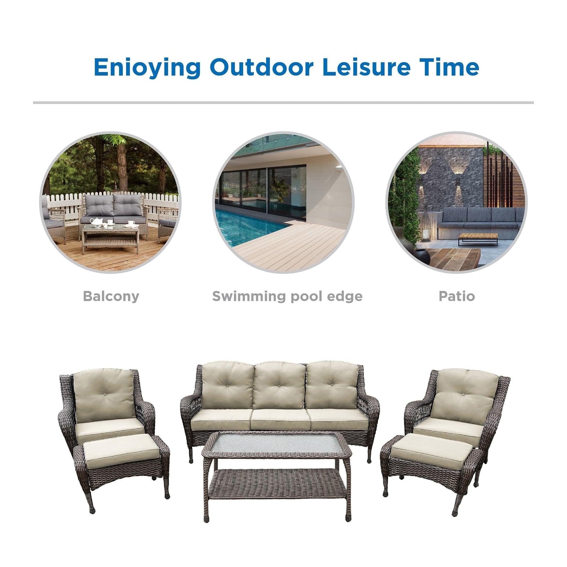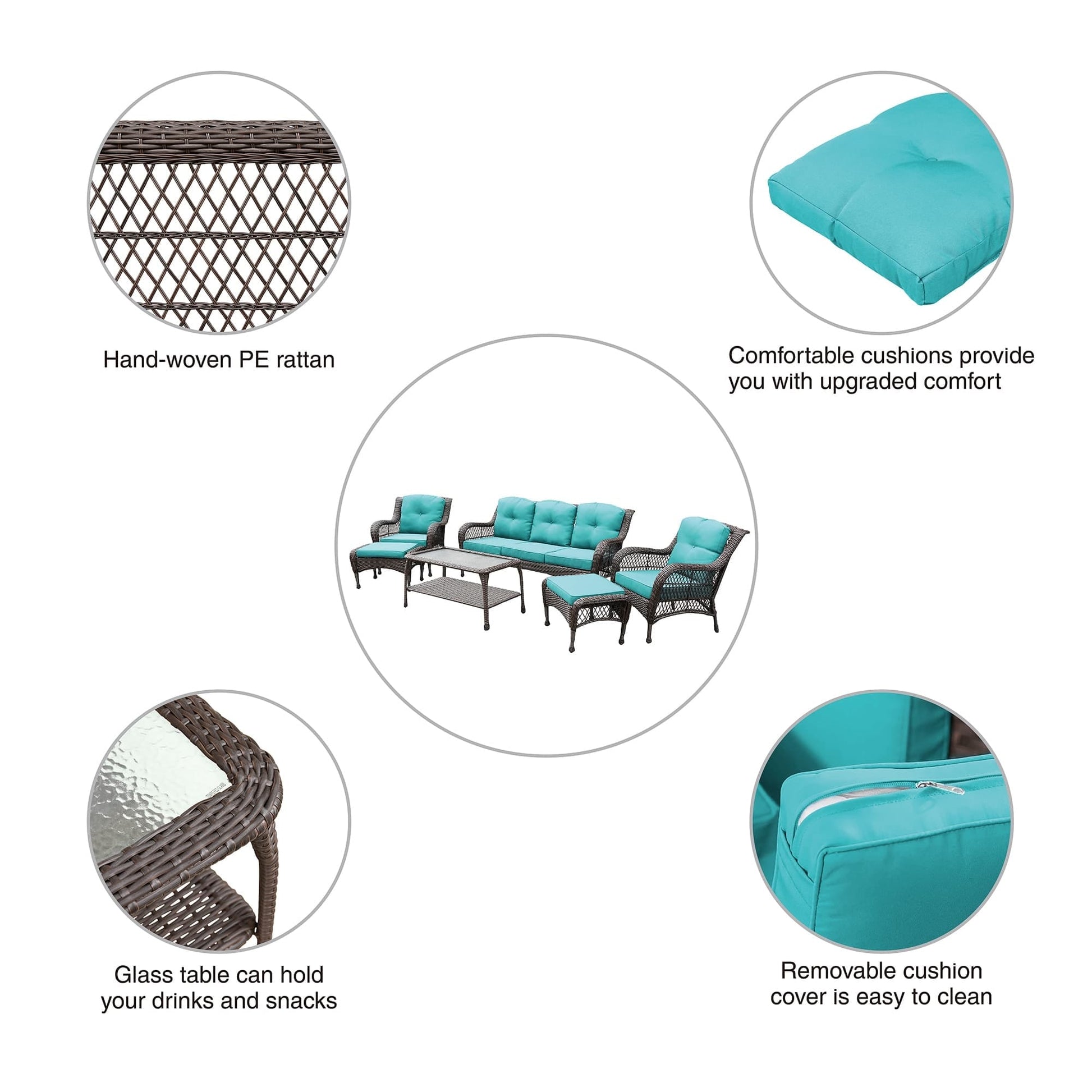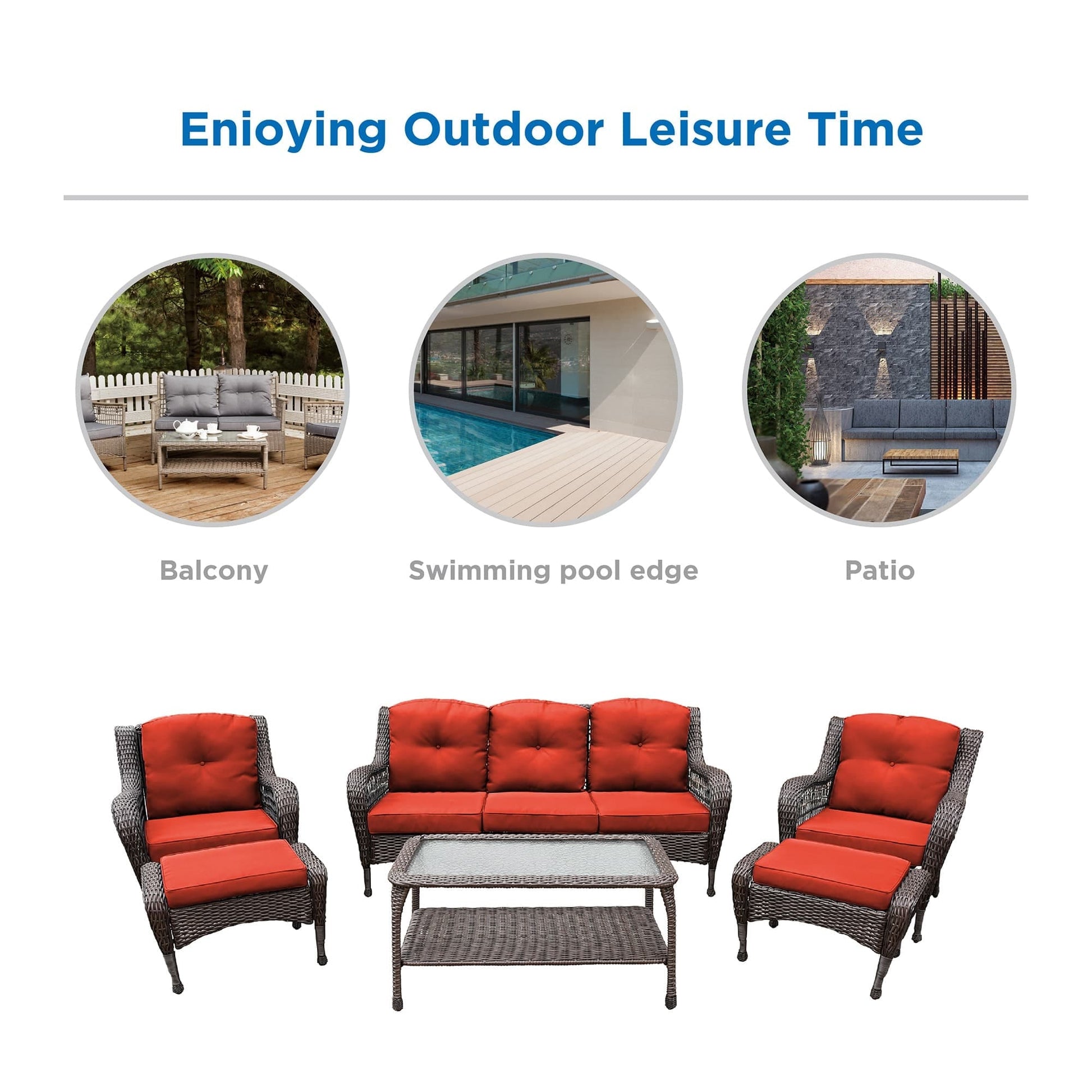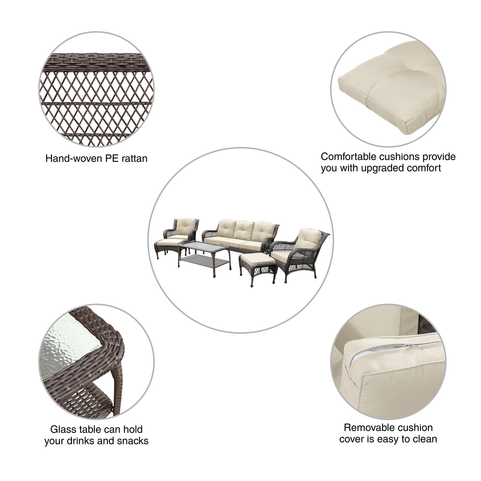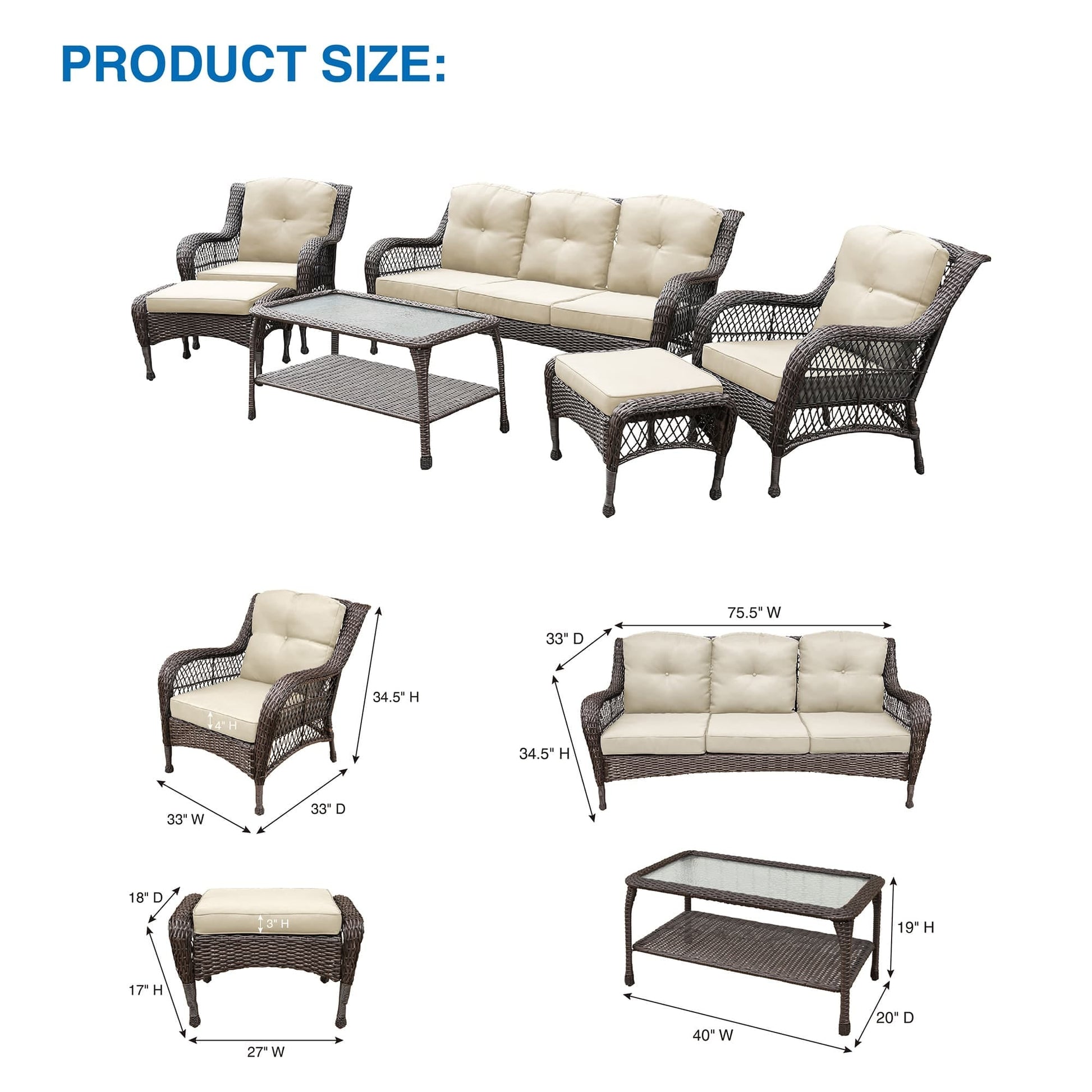 Godetevi l'aria aperta in un comfort lussuoso con il nostro set da sei pezzi in resina e vimini da giardino con cuscini per lo schienale alto, perfetto per ospitare incontri intimi. Questo set comprende un divano, due poltrone, due pouf e un tavolino da caffè con piano in vetro, tutti intrecciati a mano con vimini di resina marrone scuro su robuste strutture in acciaio. I cuscini trapuntati a bottoni offrono il massimo comfort, mentre il design resistente alle intemperie e all'acqua consente di godersi l'aria aperta tutto l'anno. La fabbricazione artigianale di qualità commerciale garantisce la durevolezza, mentre la protezione UV garantisce la tenuta del colore. Godetevi il comfort aggiuntivo dei cuscini di seduta e schienale in spugna spessa e la praticità di un facile montaggio.