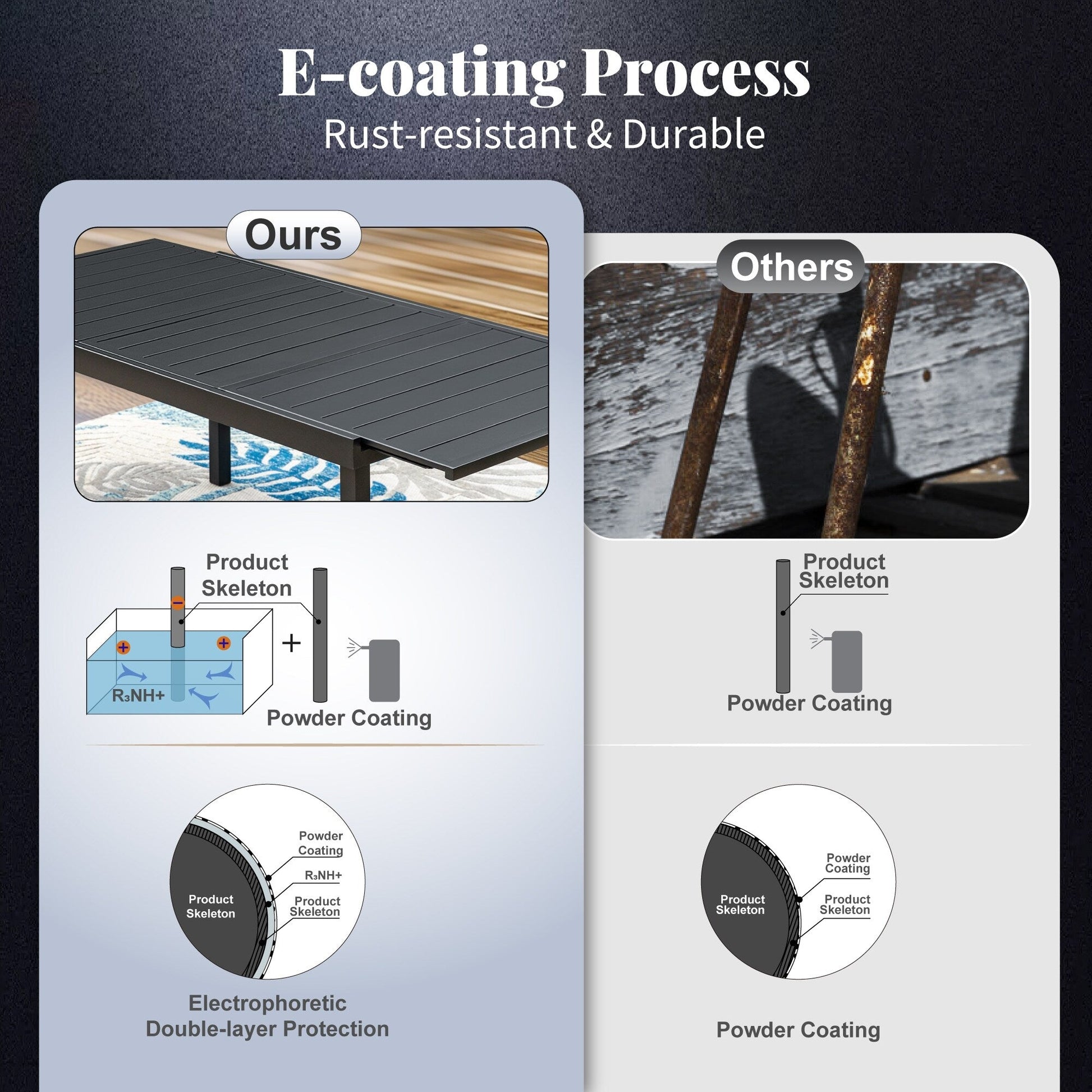 • Materiali resistenti alle intemperie : tavoli e sedie sono realizzati in ferro di alta qualità, trattato con e-coating e verniciatura a polvere, che garantisce protezione antiruggine e lunga durata per l'uso esterno. Si consiglia di evitare l'esposizione diretta alla pioggia e di utilizzare coperture quando i mobili non sono in uso.