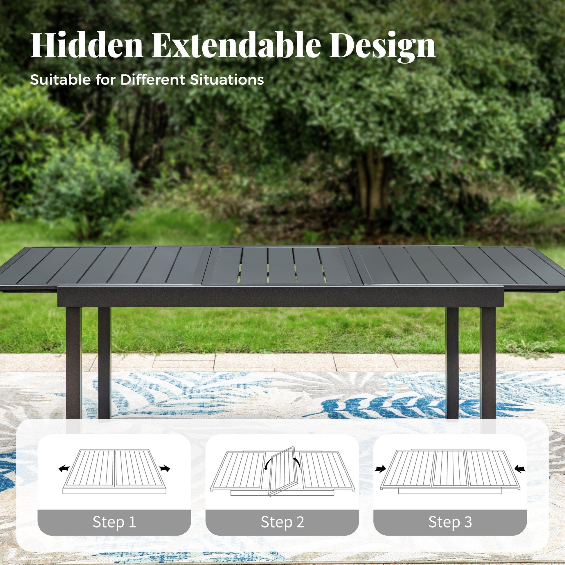 • Tavolo da pranzo allungabile : ogni set include un tavolo da pranzo in metallo con design allungabile, che può ospitare da 6 a 8 persone. Il tavolo è realizzato con una finitura resistente alla ruggine e alle intemperie, con un piano spesso in doghe o acciaio. La struttura in metallo è trattata con vernice e verniciatura a polvere per una maggiore durata. Sono inclusi tappetini antiscivolo per garantire stabilità su terreni irregolari e proteggere i pavimenti dai graffi.