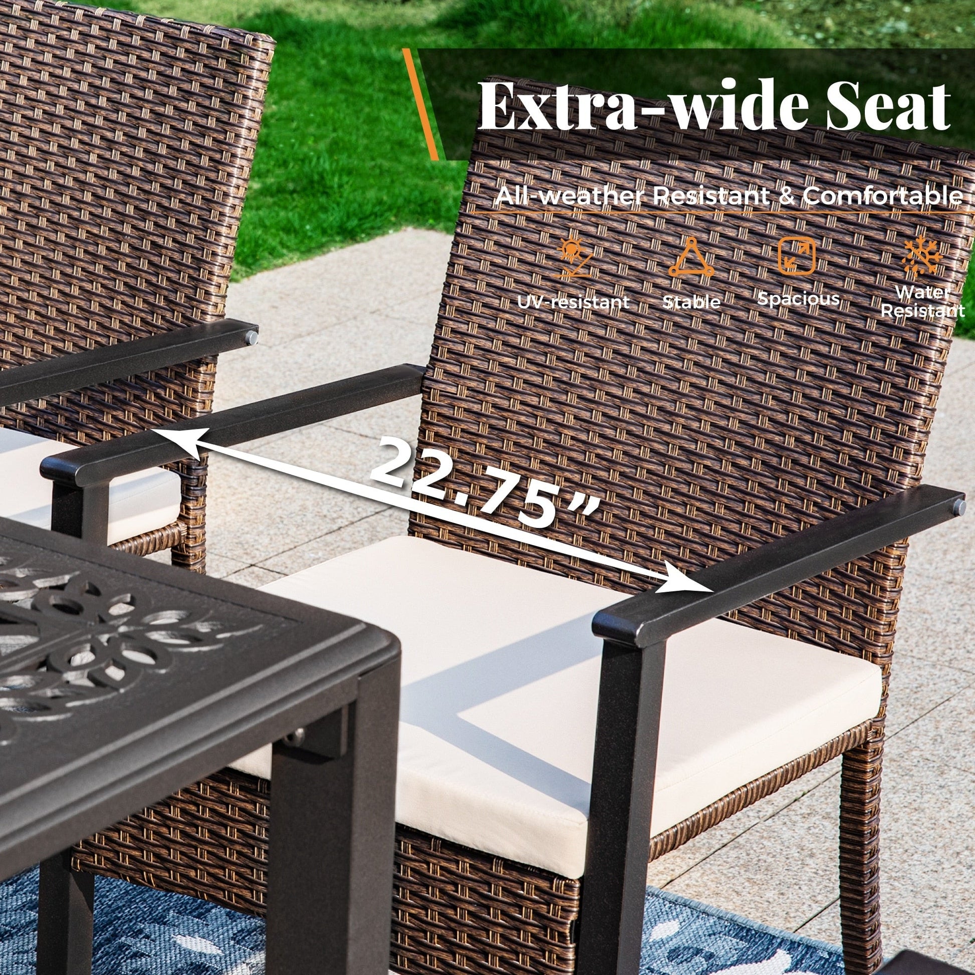 • Sedia con braccioli in metallo (blu navy e beige): queste sedie sono realizzate in vimini intrecciato e resistente alle intemperie, con bordi a doppio rivestimento per maggiore resistenza e durata. I cuscini spessi 50 cm offrono un comfort duraturo. Grazie alle gambe in tubolare metallico quadrato, le sedie offrono resistenza e stabilità superiori, e una capacità di carico di 136 kg garantisce prestazioni durature.