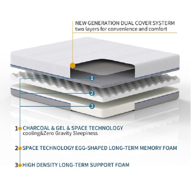 Lo strato superiore del materasso è in memory foam Charcoal & Gel Space Technology. La schiuma traspirante perforata aiuta a ridurre il calore. I piccoli fori allontanano l'aria calda e il calore corporeo, donandoti freschezza e sonnolenza in assenza di gravità. La base in schiuma resistente previene l'affondamento e il cedimento e sostiene tutto il corpo. Questo materasso offre tre strati di schiuma premium certificata CertiPUR-US per una combinazione di supporto, traspirabilità e comfort.