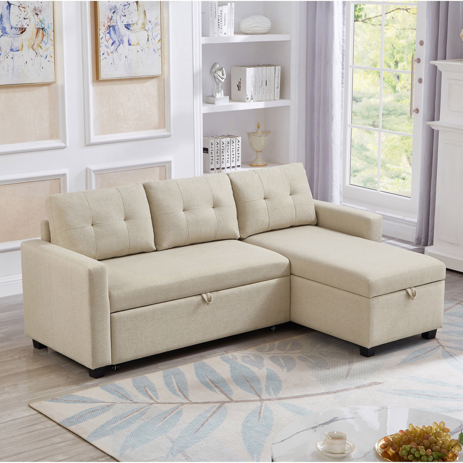 Divano letto imbottito trasformabile a 3 posti da 81,5'' con letto estraibile, chaise longue contenitore reversibile e cuscini per lo schienale