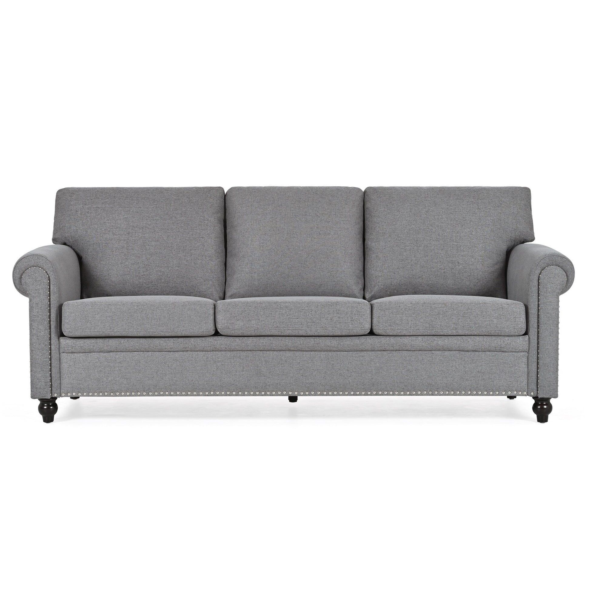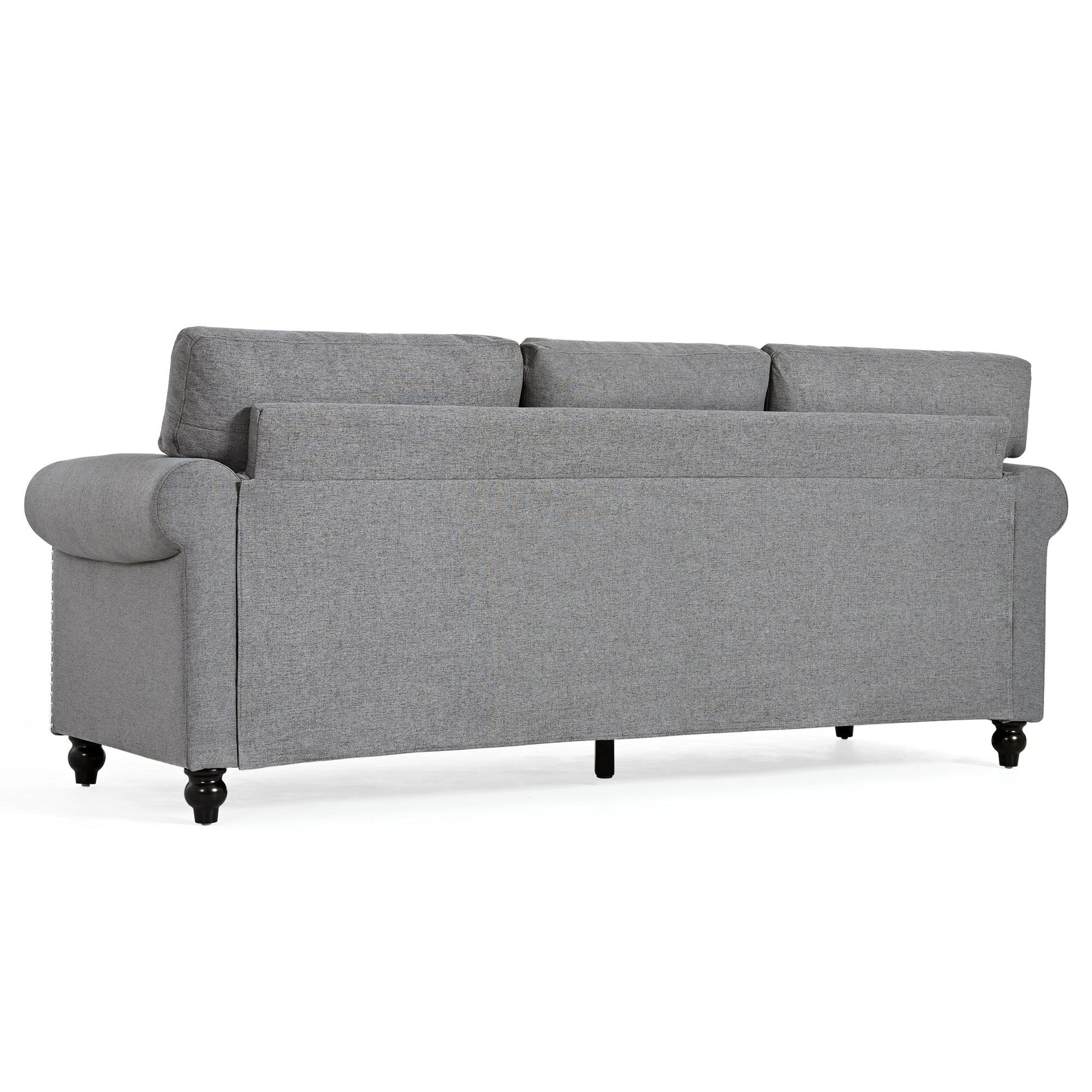83.86 Divano imbottito a 3 posti con borchie e piedini in betulla per soggiorno