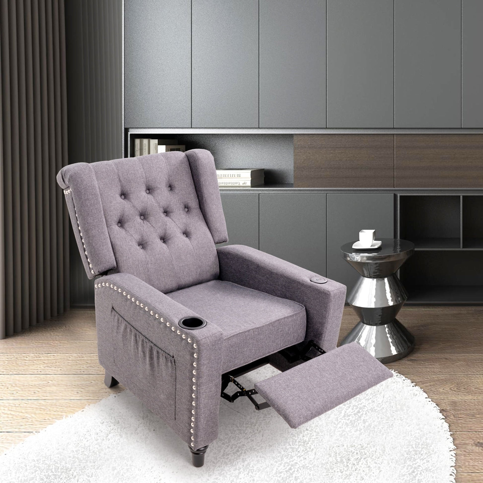 Questa poltrona reclinabile con schienale imbottito si adatta a qualsiasi stanza della casa; la forma e l'altezza dello schienale catturano l'attenzione, mentre i braccioli e la seduta imbottita garantiscono il massimo comfort; la resistente struttura in legno e le 4 gambe in legno massello consentono a questa poltrona reclinabile di offrire un'elevata capacità di carico. Basta spingere indietro per sdraiarsi facilmente, lo schienale può essere reclinato da 90 a 160 gradi per leggere, fare un pisolino o guardare la TV, e il poggiapiedi fuoriesce per offrire ai piedi una posizione comoda. Basta premere il poggiapiedi verso il basso con i piedi e la poltrona tornerà alla sua forma originale. Non c'è dubbio che sia un fantastico regalo di Natale per la tua famiglia.