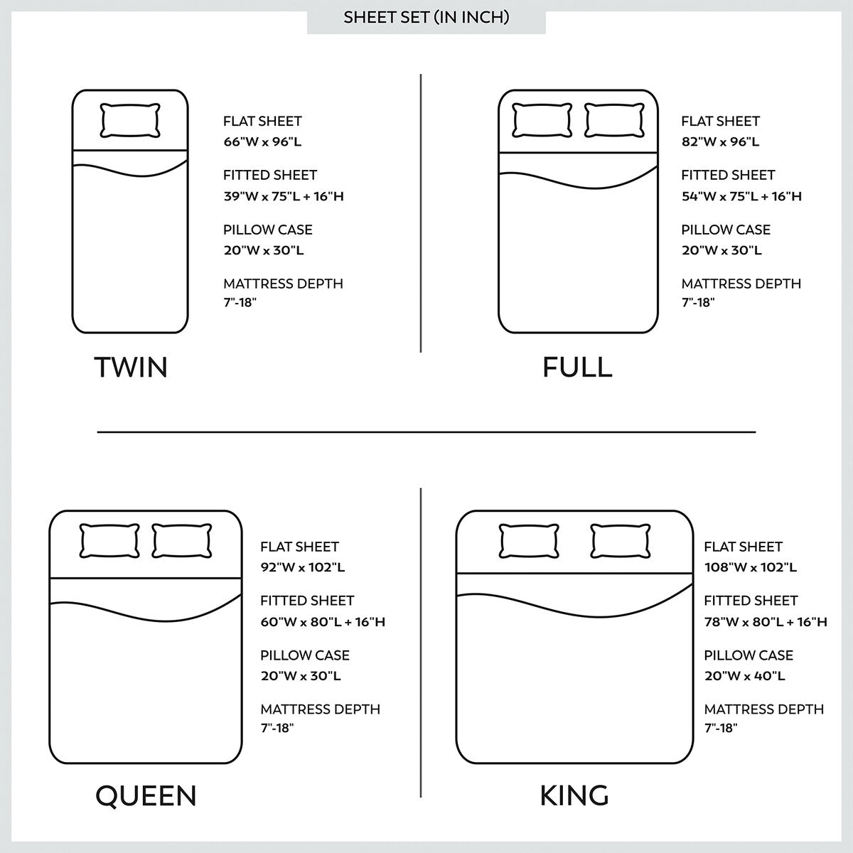 1 lenzuolo con angoli: 78 pollici di larghezza x 80 pollici di lunghezza