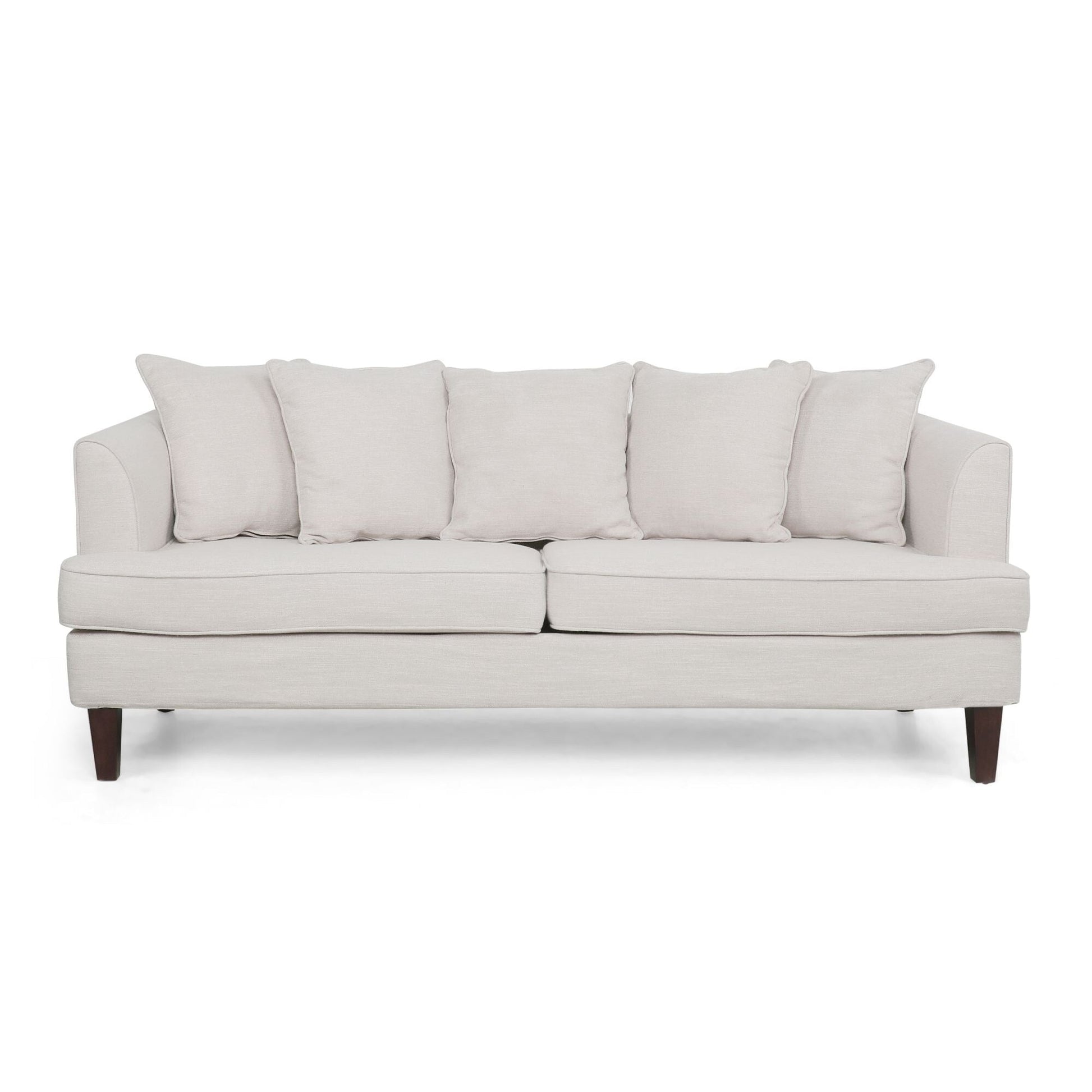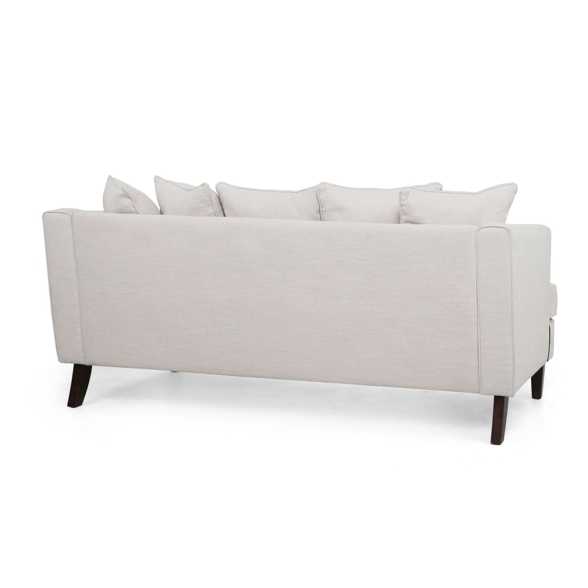 Divano a due posti beige imbottito con cuscini e gambe in legno