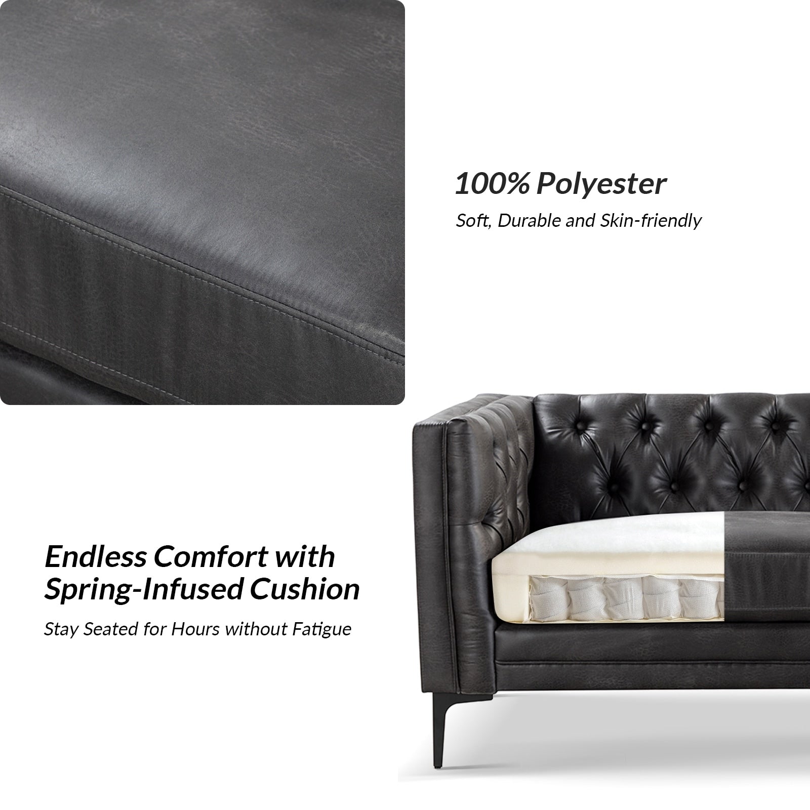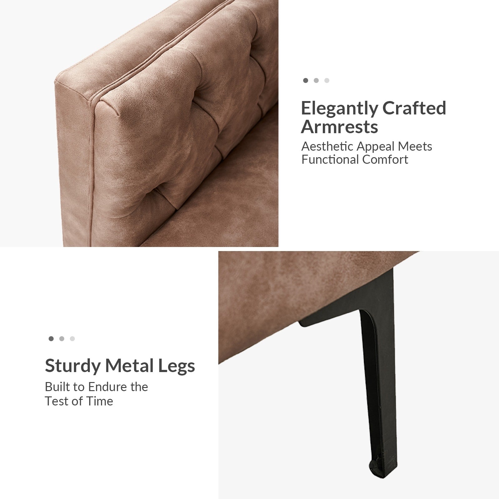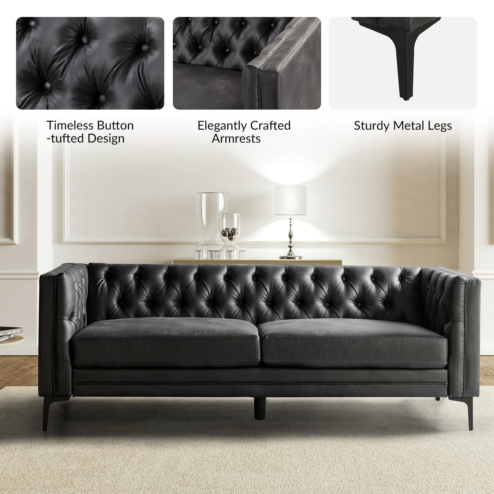 Questo divano in stile classico e di transizione è realizzato in tessuto traspirante e morbido, ed è resistente. Elegante e casual, questo divano si adatta a qualsiasi stile d'interni. Le gambe in metallo hanno un aspetto moderno, mentre la trapuntatura a bottoni sullo schienale aggiunge un tocco di texture. Il divano è realizzato in legno massello, similpelle e pannelli in tessuto 100% poliestere. Questo comodo divano moderno con trapuntatura a bottoni e morbidi braccioli quadrati si distingue in un soggiorno, uno studio, una zona relax, una casa o un piccolo appartamento.