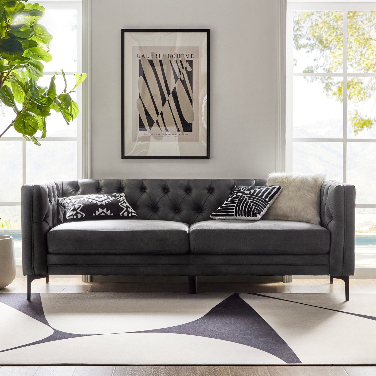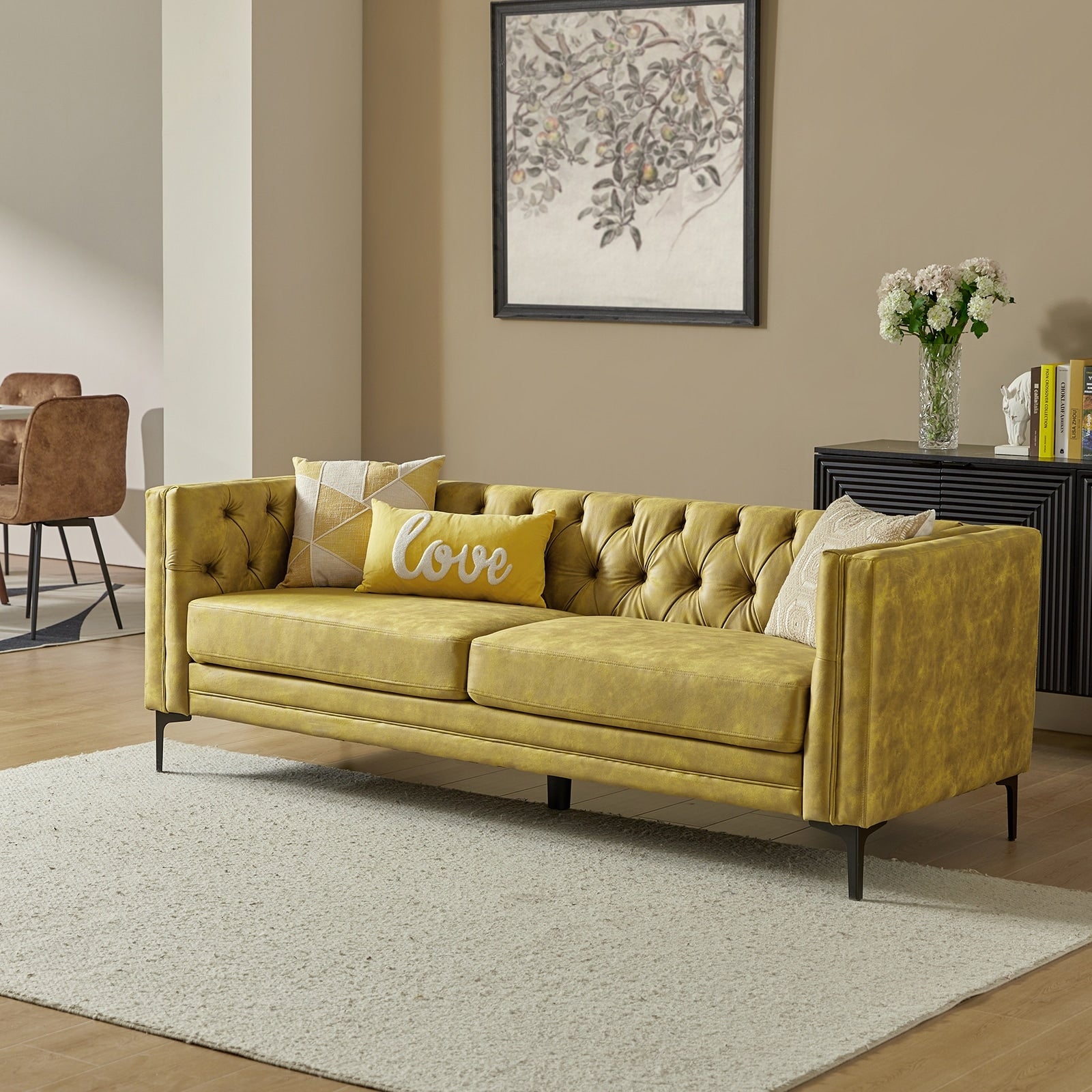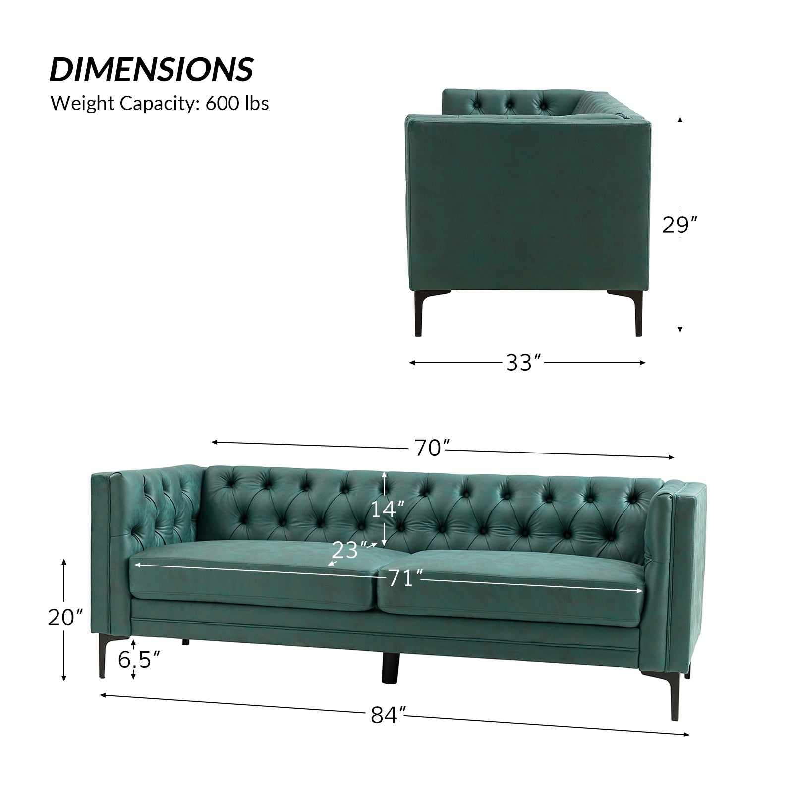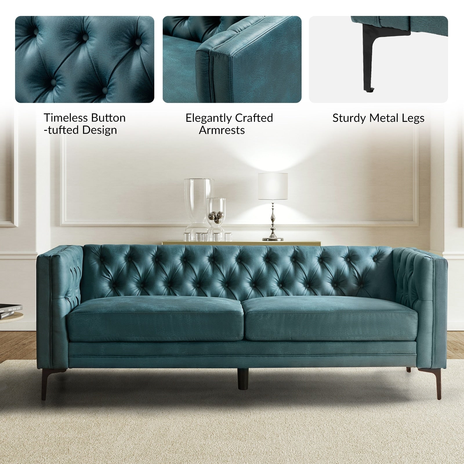 Questo divano in stile classico e di transizione è realizzato in tessuto traspirante e morbido, ed è resistente. Elegante e casual, questo divano si adatta a qualsiasi stile d'interni. Le gambe in metallo hanno un aspetto moderno, mentre la trapuntatura a bottoni sullo schienale aggiunge un tocco di texture. Il divano è realizzato in legno massello, similpelle e pannelli in tessuto 100% poliestere. Questo comodo divano moderno con trapuntatura a bottoni e morbidi braccioli quadrati si distingue in un soggiorno, uno studio, una zona relax, una casa o un piccolo appartamento.