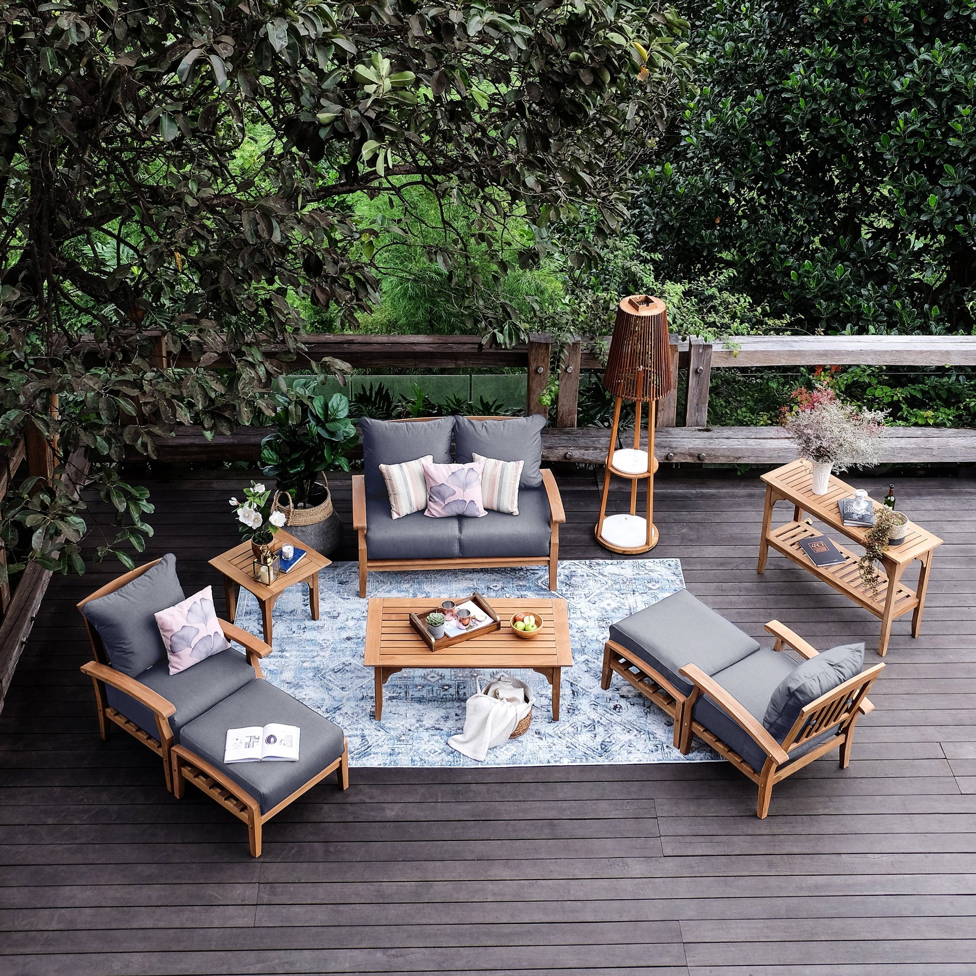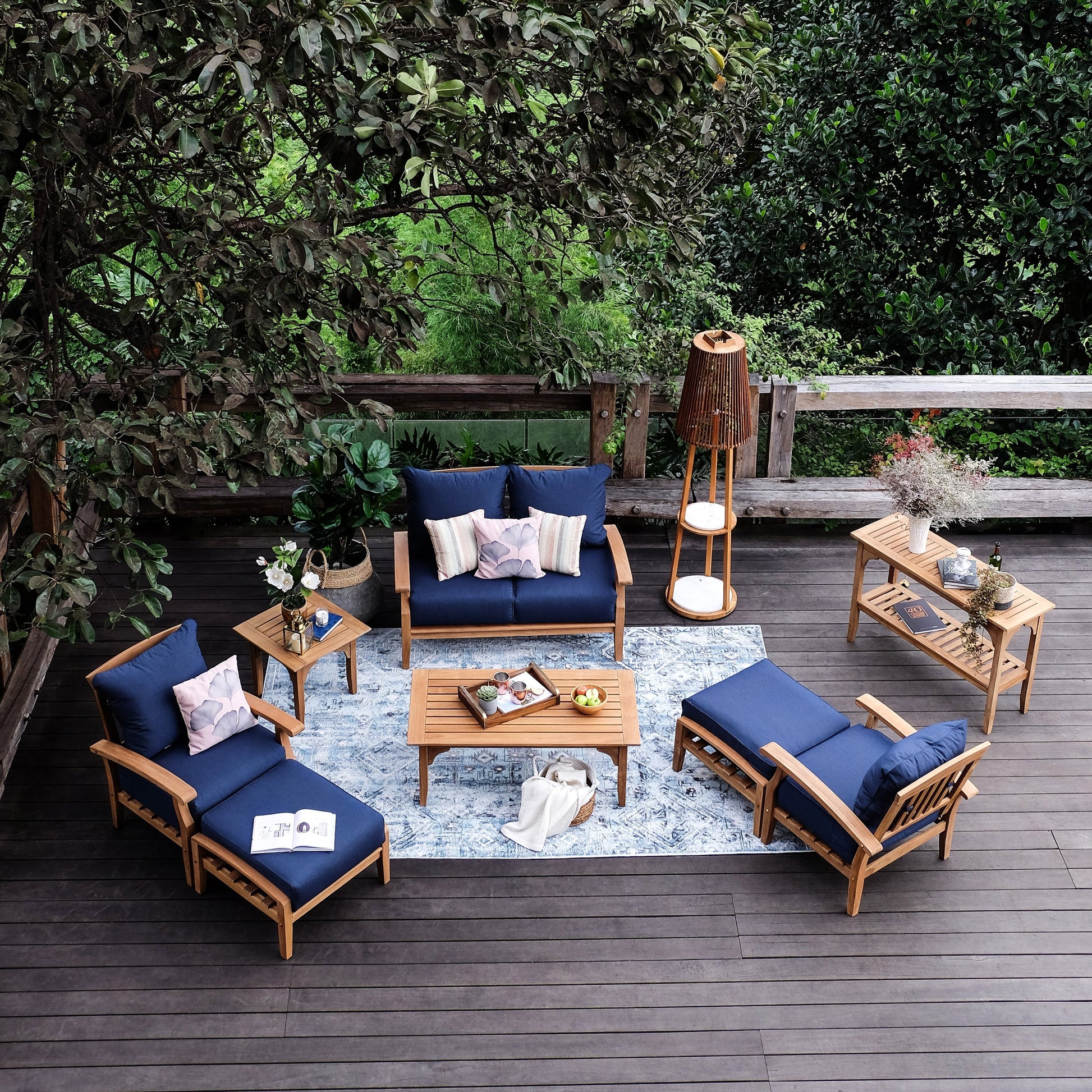 Trasforma il tuo spazio esterno questa primavera ed estate con il set da conversazione Cambridge Casual Leon in teak da 7 pezzi. Realizzato in legno massello di teak, questo set da conversazione in teak resistente alle intemperie è progettato per offrire stile e durata, perfetto per rilassarsi o intrattenere. Il set da conversazione include due poltrone, due pouf, un divano a due posti, un tavolino da caffè e un tavolino laterale, per ospitare comodamente da 4 a 6 persone. I cuscini spessi 18 cm, disponibili in beige, blu navy o grigio, sono sfoderabili per una facile pulizia. Grazie alla struttura con incastri a mortasa e tenone, questo set da conversazione in legno è progettato per resistere alle intemperie, rendendolo il divano da patio in teak perfetto per la tua oasi all'aperto. Inoltre, grazie al facile montaggio, potrai goderti il ​​tuo nuovo set in pochissimo tempo!