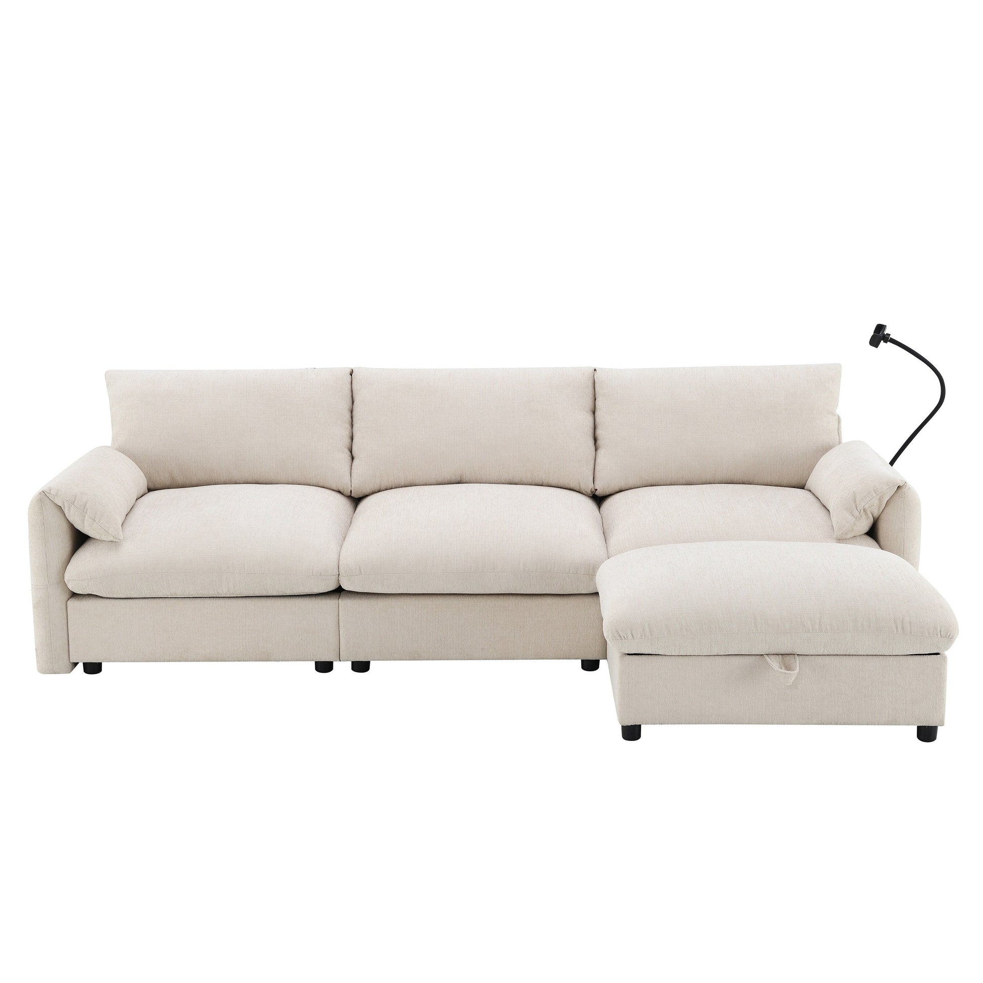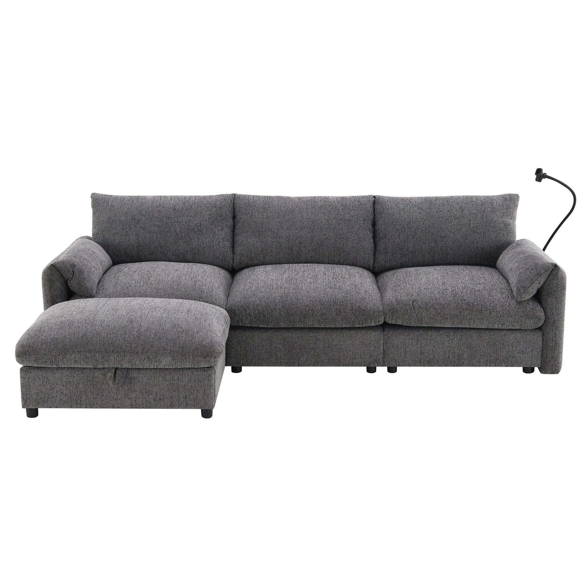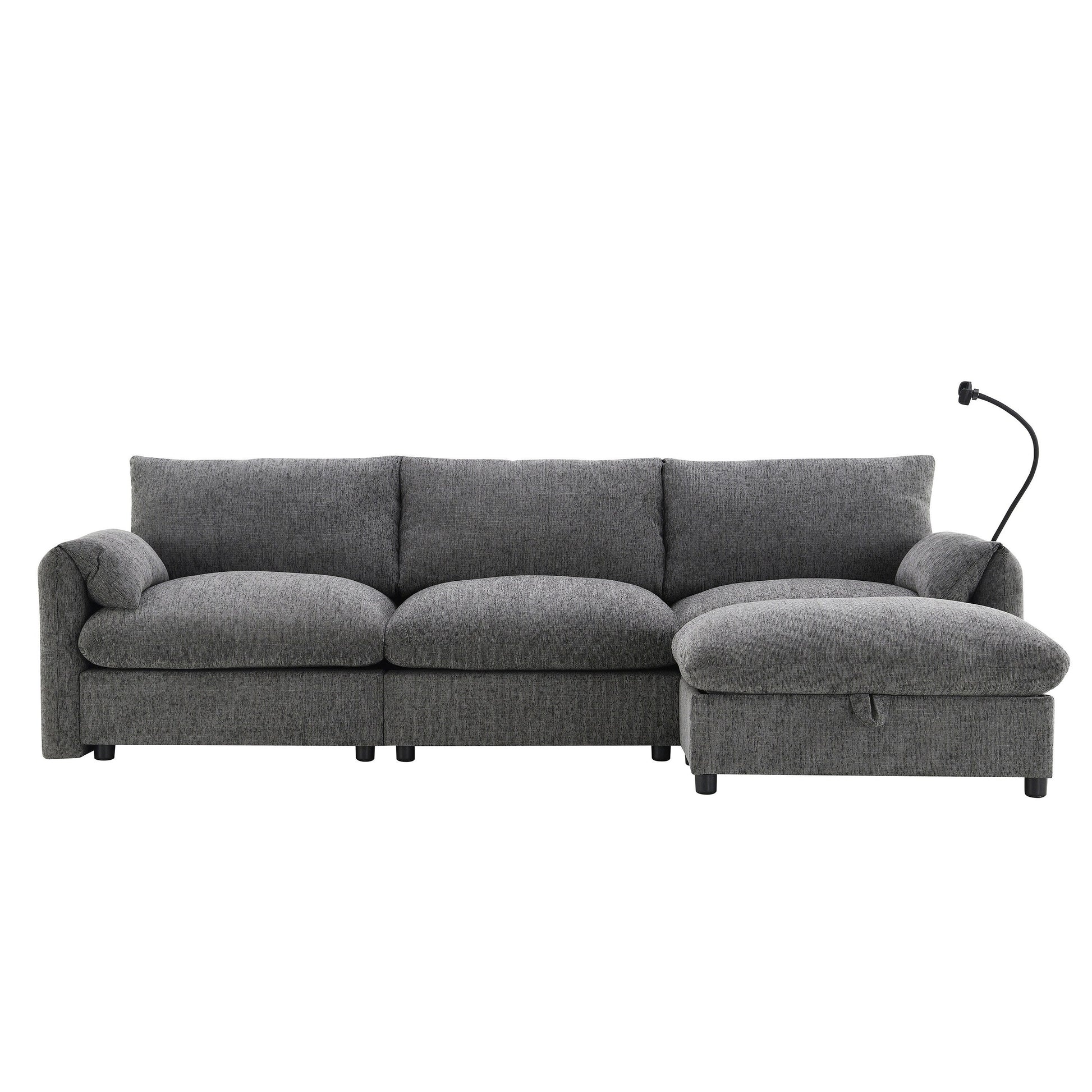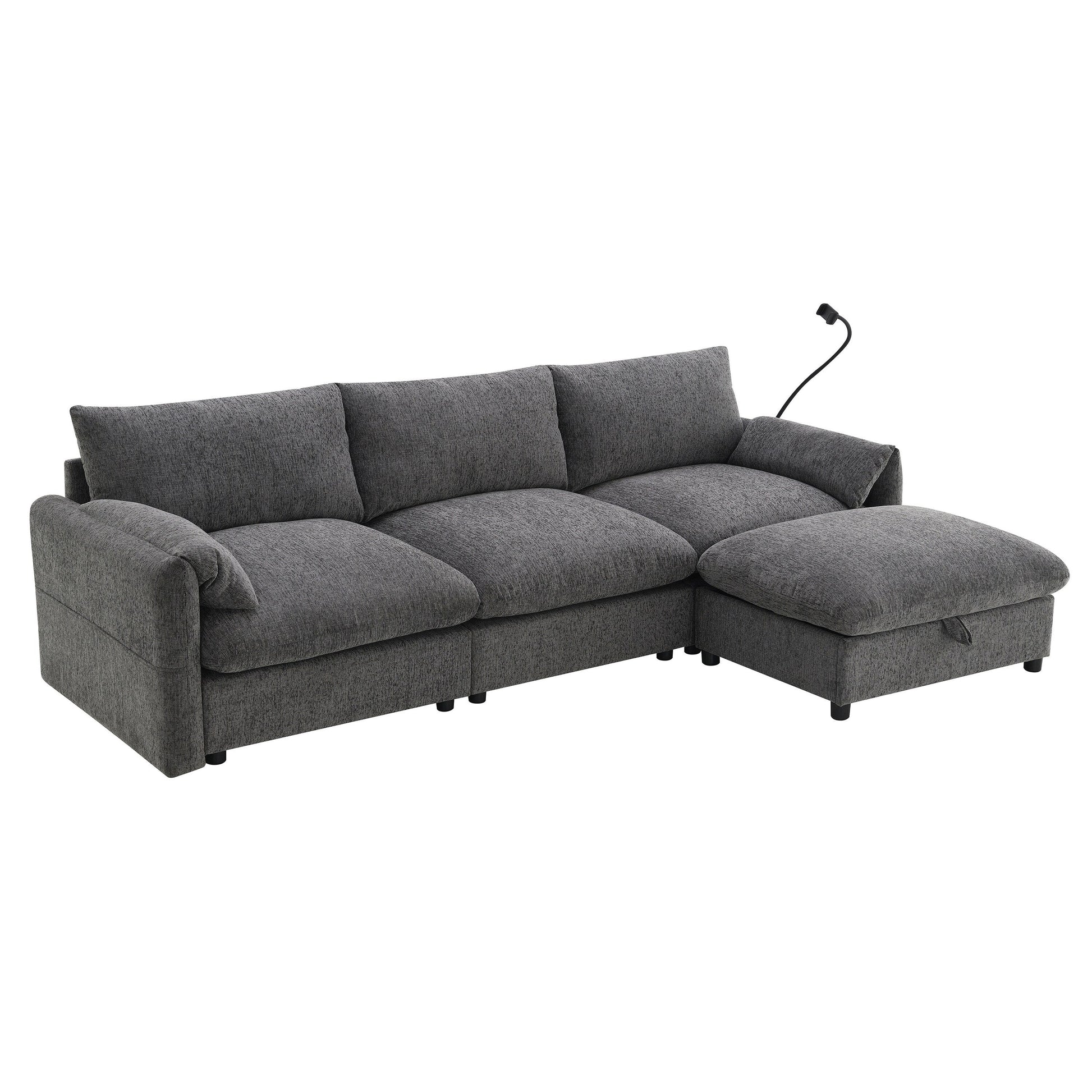 Divano componibile in ciniglia con pouf contenitore e tasche, porta telefono regolabile, seduta ampia, set divano a L con caricabatterie USB