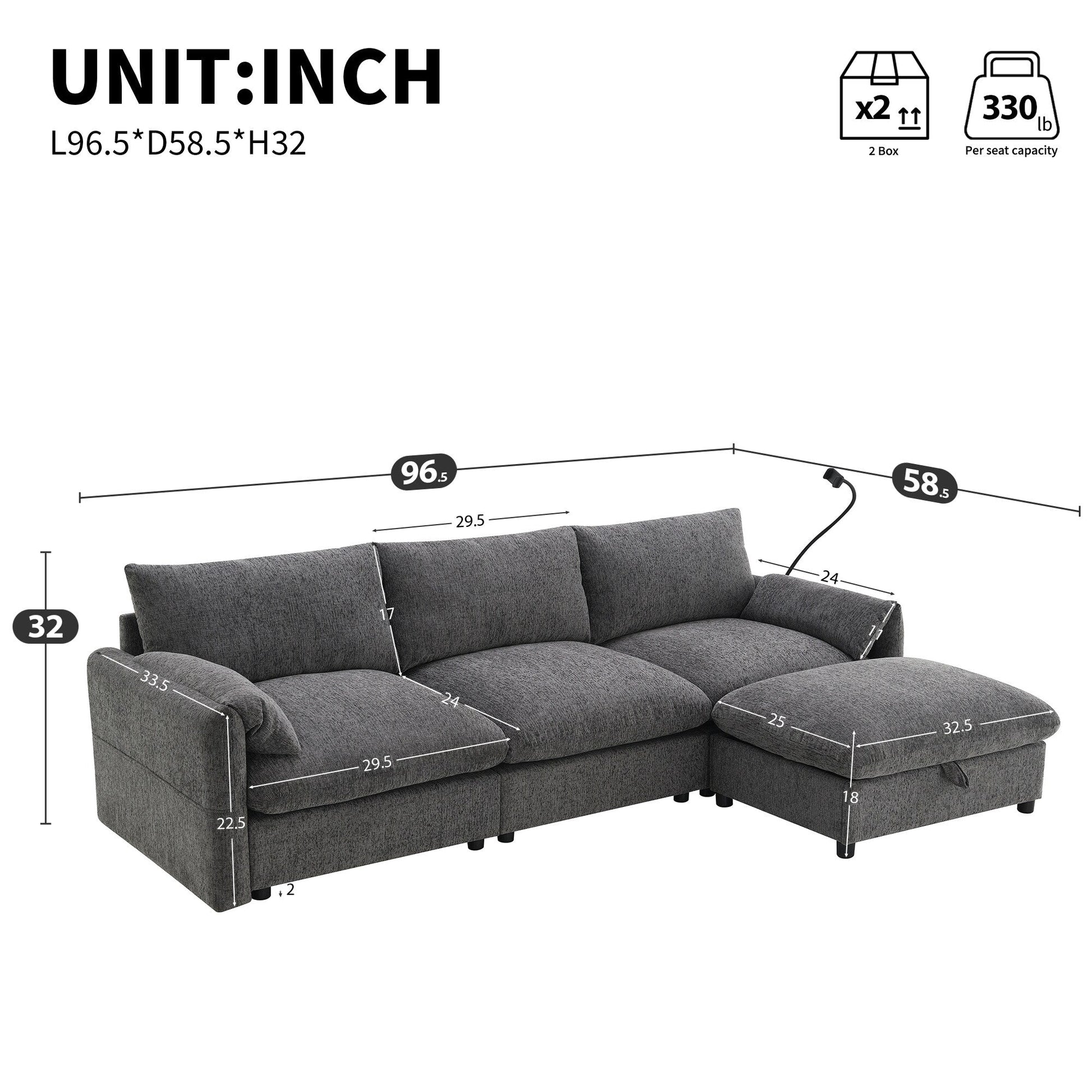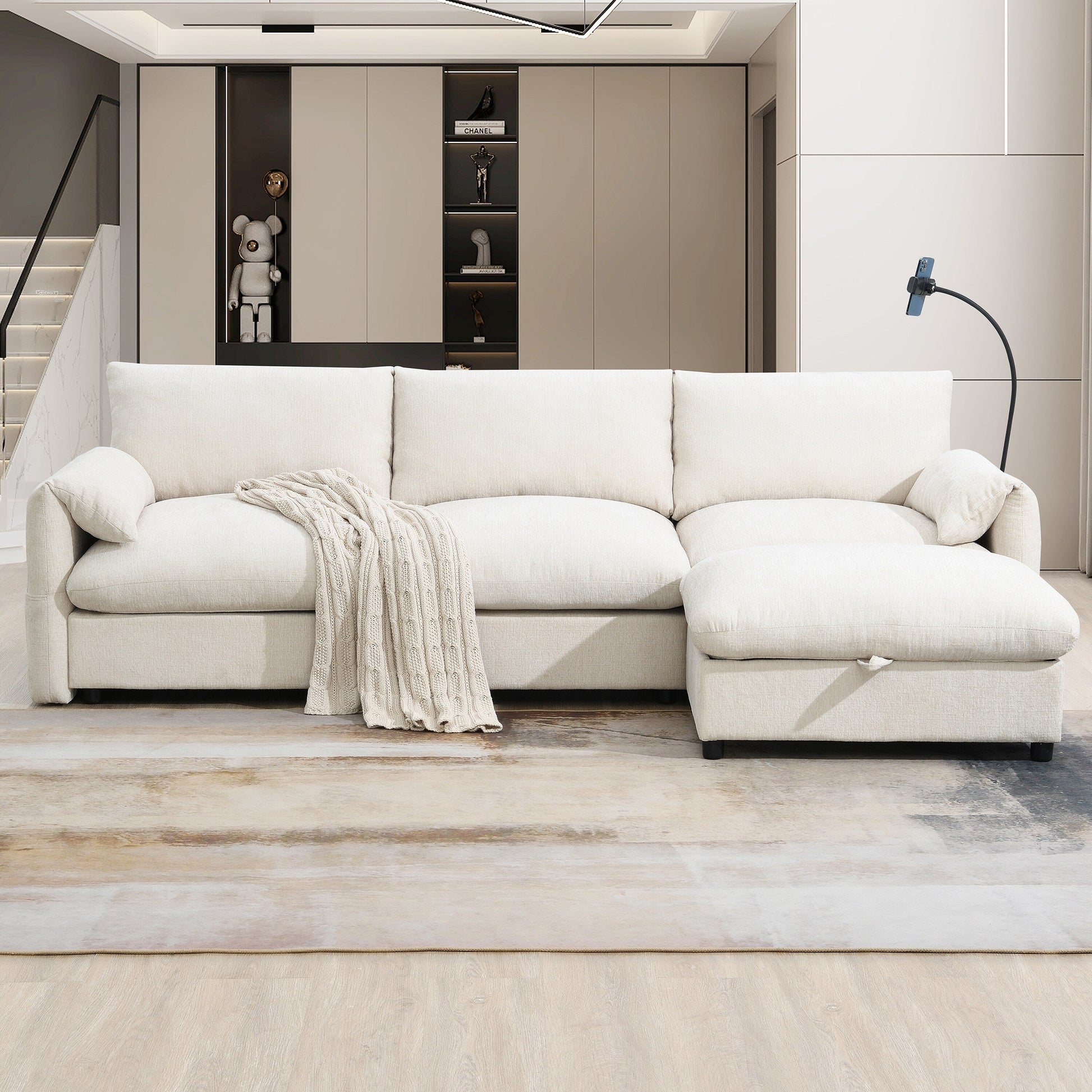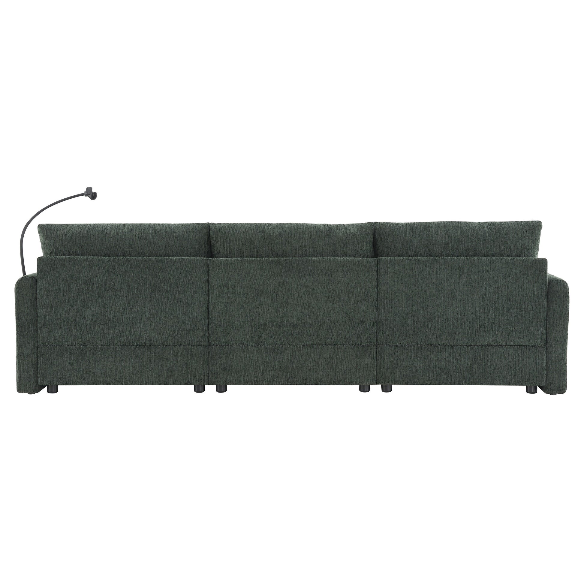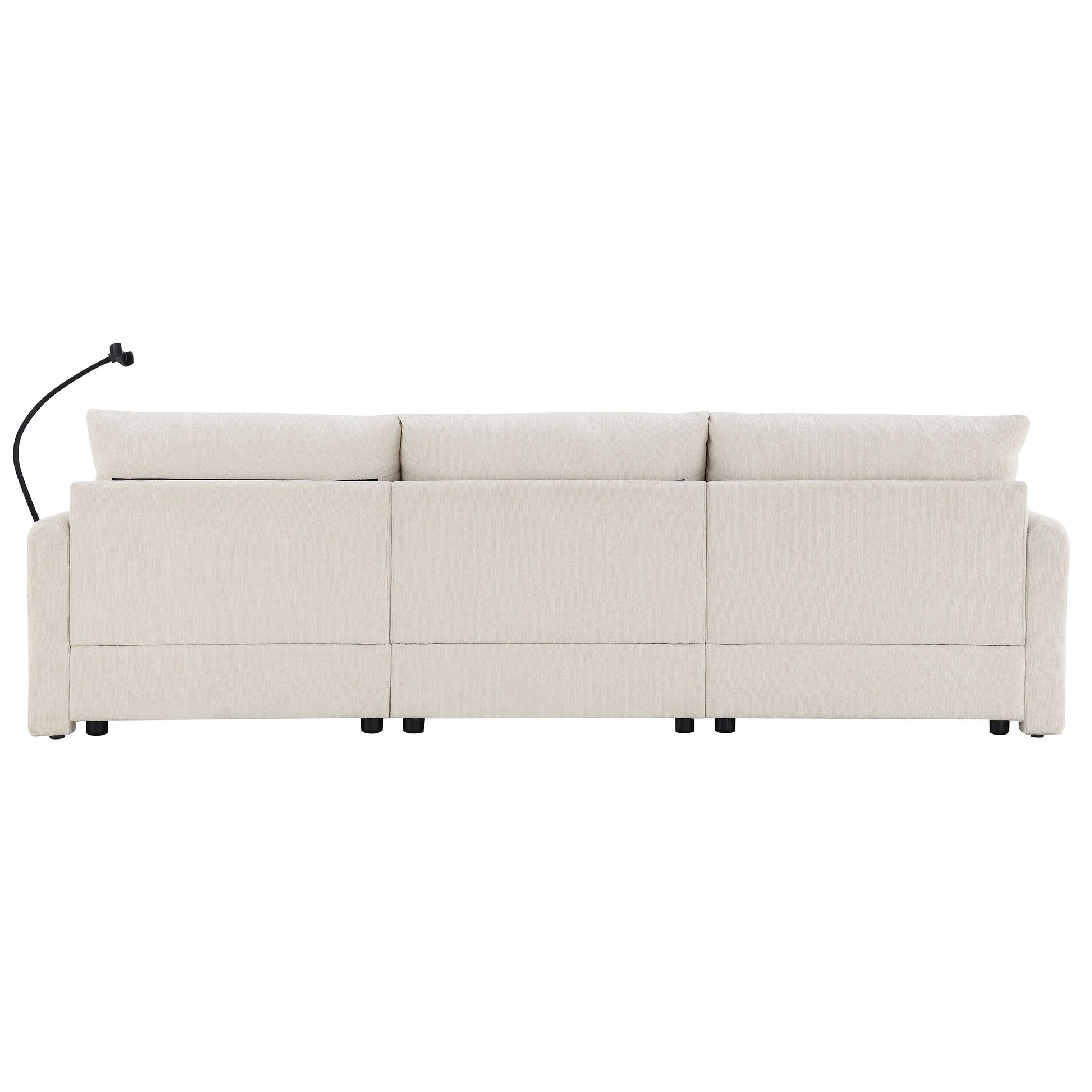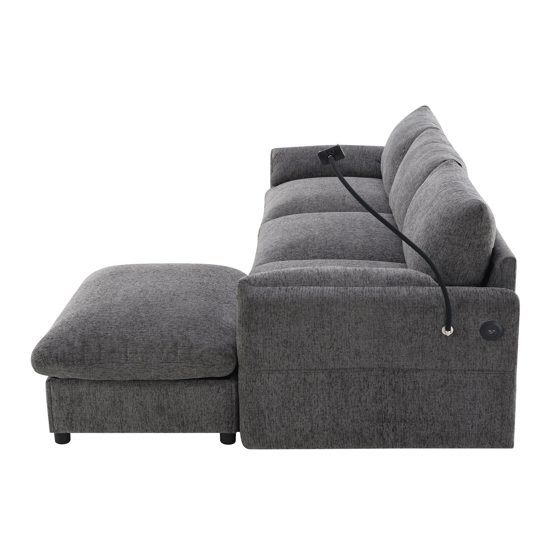 Divano componibile in ciniglia con pouf contenitore e tasche, porta telefono regolabile, seduta ampia, set divano a L con caricabatterie USB