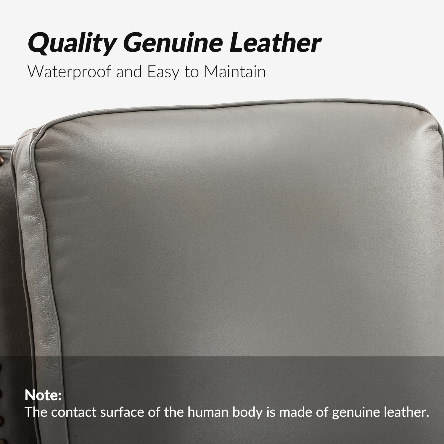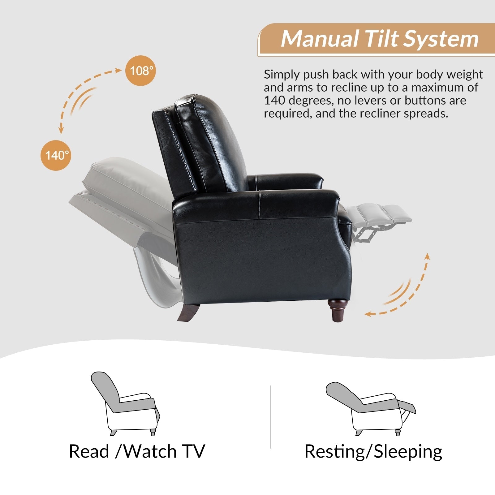 Immergiti nel lusso e nel relax con la poltrona reclinabile Victorino Comfy Cigar in vera pelle con finiture a borchie. Rivestita in vera pelle e schiuma con una robusta struttura in legno, questa poltrona trasuda raffinatezza e comfort. Lo stile moderno di metà secolo è perfetto per qualsiasi soggiorno, mentre le finiture a borchie aggiungono un tocco estroso. Basta spingere indietro per reclinare la poltrona, senza bisogno di leve o pulsanti. Goditi lunghe sedute, la visione della TV o una rilassante reclinazione grazie al comodo supporto di seduta e schienale. Il montaggio è rapido e comodo e la spedizione è puntuale. Perfetta per il soggiorno, la sala multimediale o la camera da letto principale.
