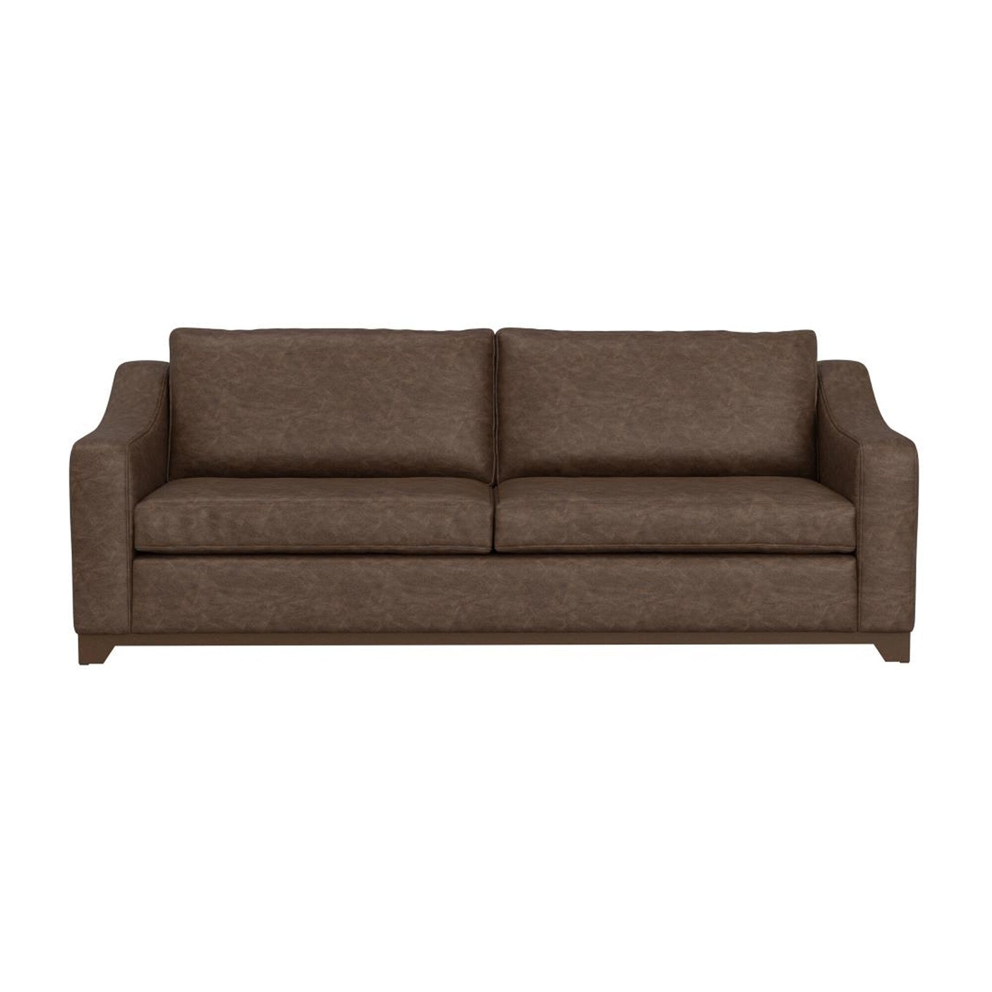 Divano Umey, 2 cuscini decorativi, moderno in similpelle marrone scuro, legno massello