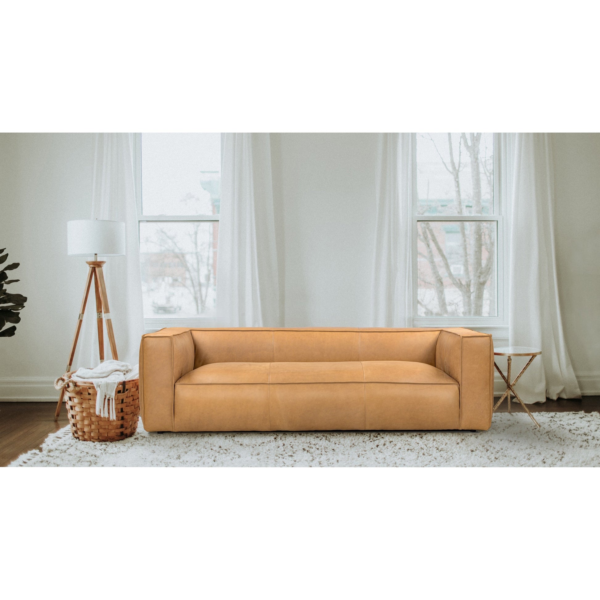Questo divano, che unisce un design elegante a una struttura durevole, non solo elegante ma anche comoda, è rivestito in una calda pelle color caramello e ha un profilo basso che trasuda una qualità minimalista con un'aura rustica e moderna, perfetta per la tua casa o il tuo ufficio.