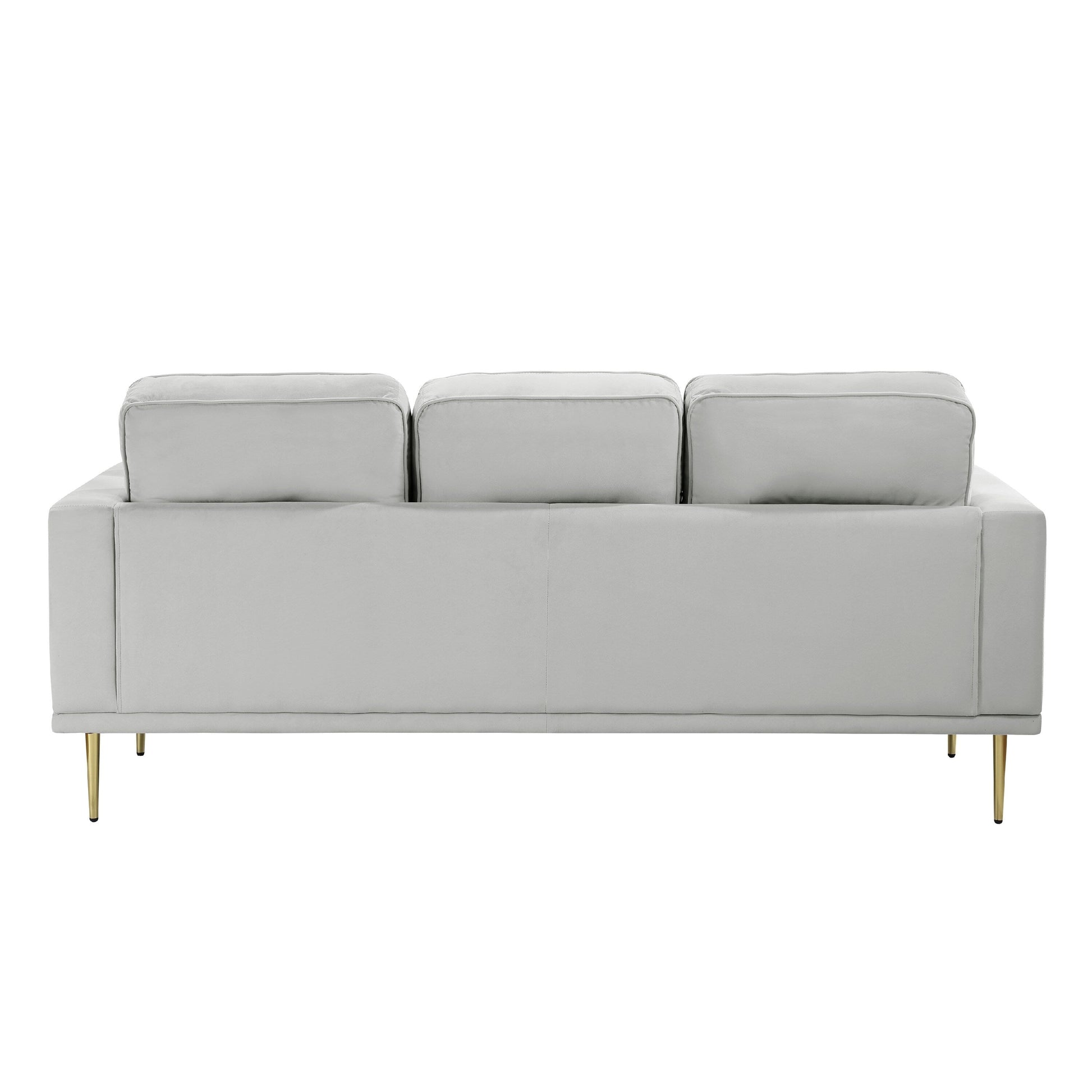 Dona eleganza e carattere al tuo spazio con questo straordinario divano, progettato per affascinare e offrire comfort. Realizzato con una struttura in legno massello e compensato, presenta un lussuoso rivestimento in velluto grigio e gambe in metallo dorato per una finitura raffinata. I cuscini reversibili e sfoderabili garantiscono una lunga durata. Esplora la nostra collezione Voxo per ulteriori opzioni.