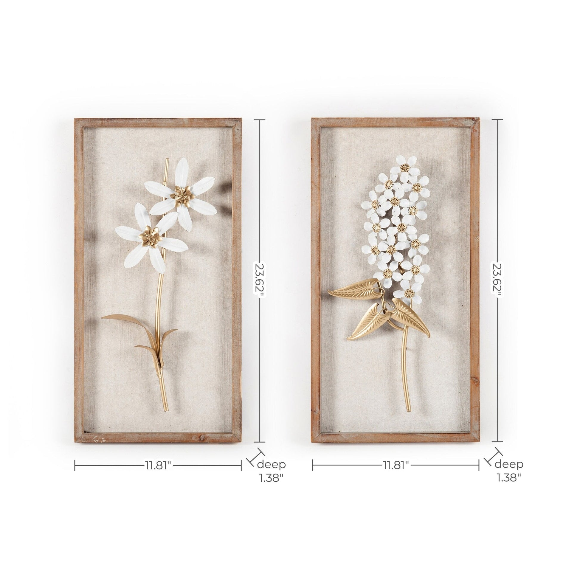 Decorazione da parete con bouquet di fiori in metallo bianco e oro e cornice in legno (set da 2)