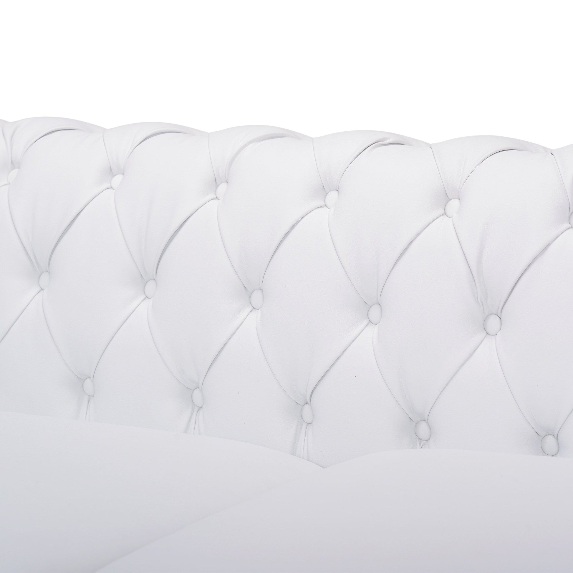 Divano Chesterfield bianco a 3 posti con 83 bottoni, imbottito, trapuntato, borchie e gambe in legno per soggiorno