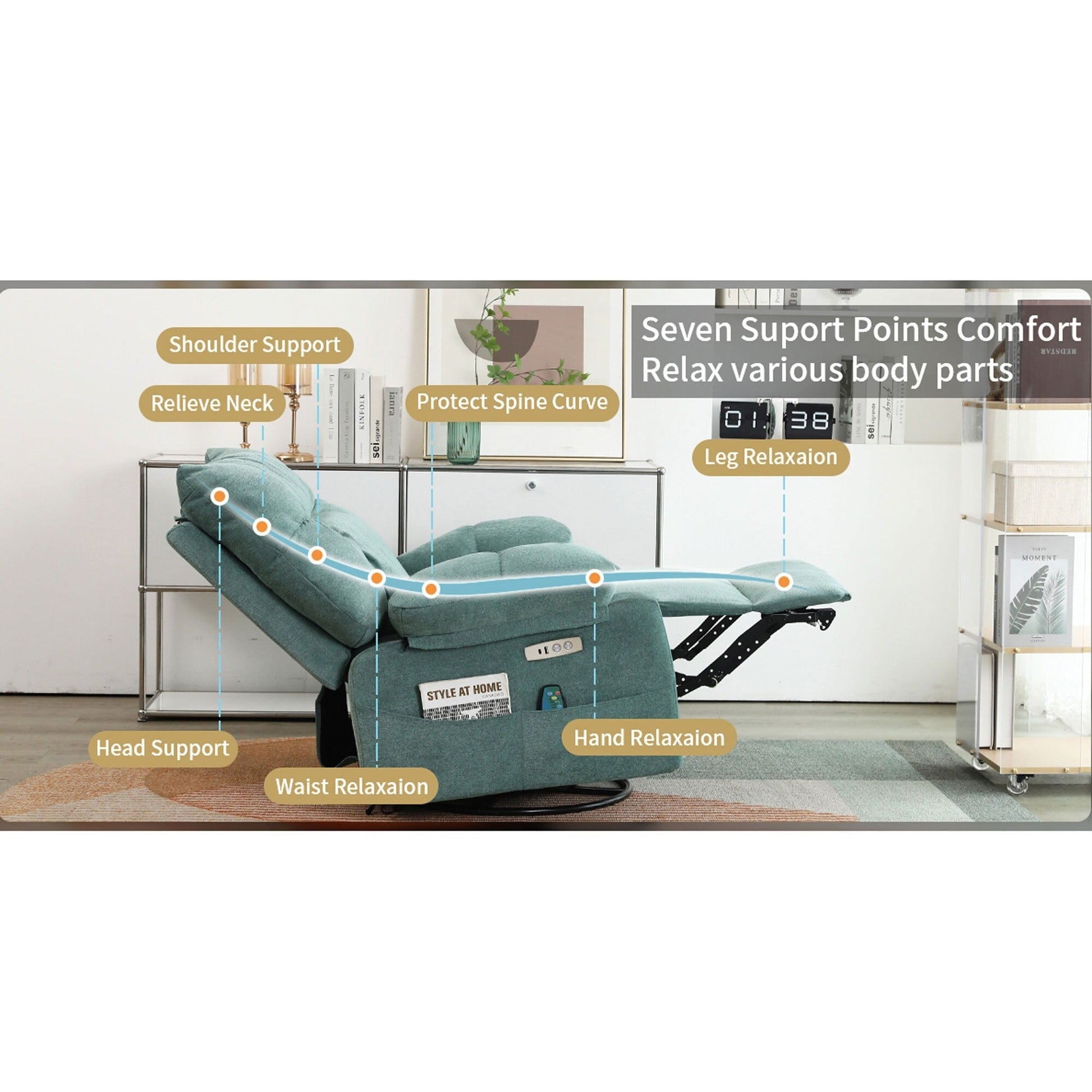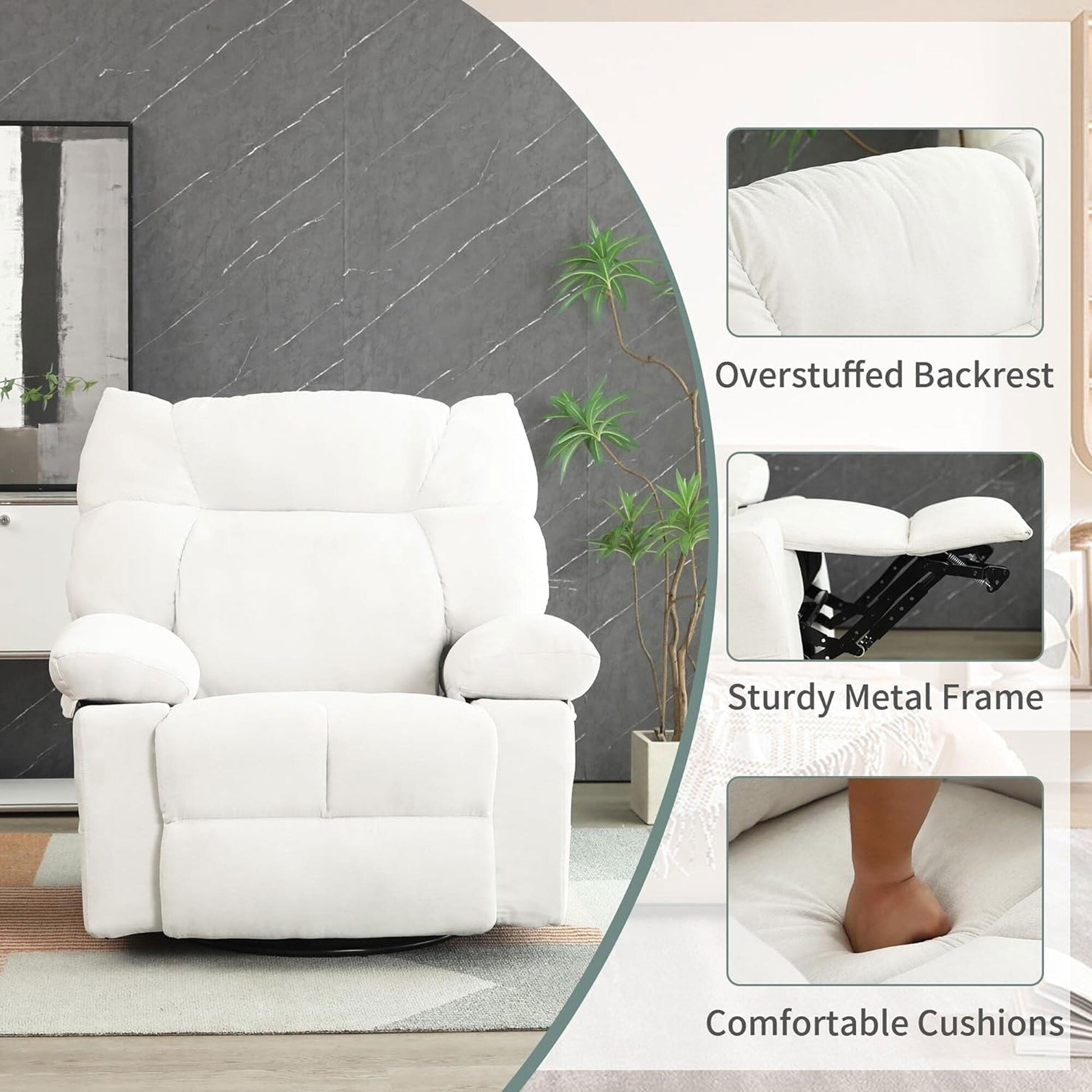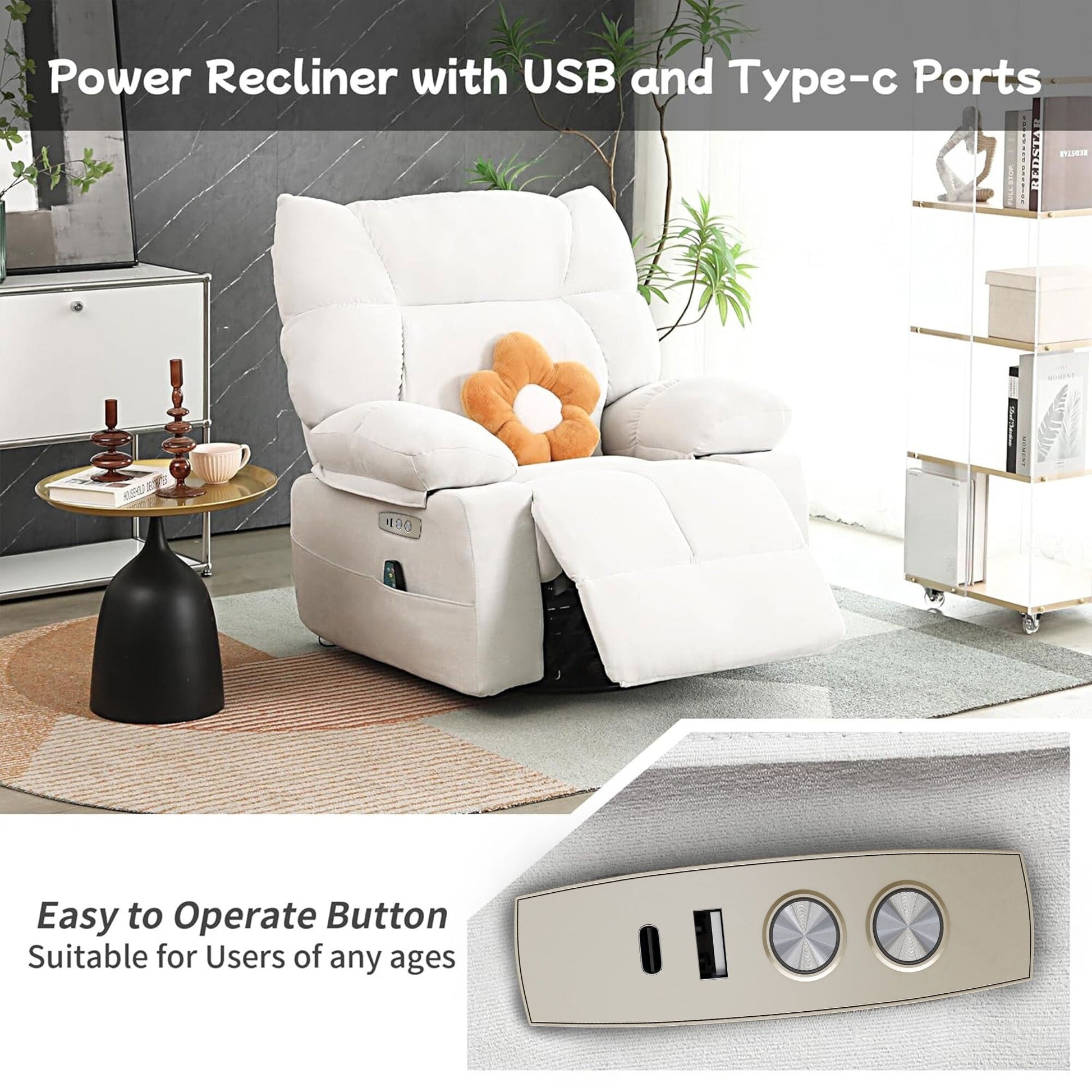 • 【Pratiche porte USB e USB-C】 La nostra poltrona reclinabile girevole a dondolo è dotata di porte USB e USB-C, che ti consentono di mantenere i tuoi dispositivi carichi mentre ti godi il tempo libero. Allo stesso tempo, l'ampia tasca laterale è comoda per riporre riviste, telecomandi o altri oggetti essenziali.
