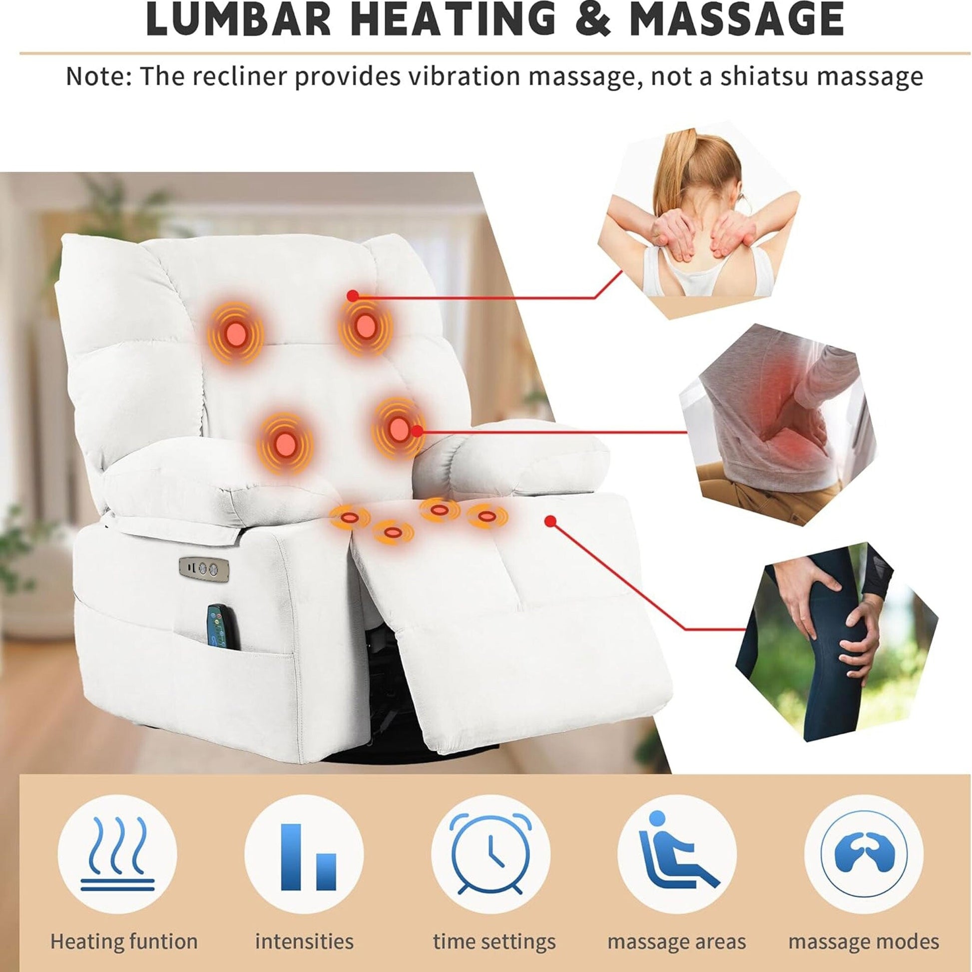 • 【Massaggio migliorato e funzione di riscaldamento】Questa poltrona reclinabile è appositamente progettata con 8 punti di massaggio vibranti (schiena/vita/cosce/gambe) e funzione di riscaldamento lombare, mirati ad alleviare il dolore, favorire la circolazione sanguigna ed eliminare affaticamento e stress. Utilizza il telecomando per selezionare diverse modalità e intensità, comodo e pratico.