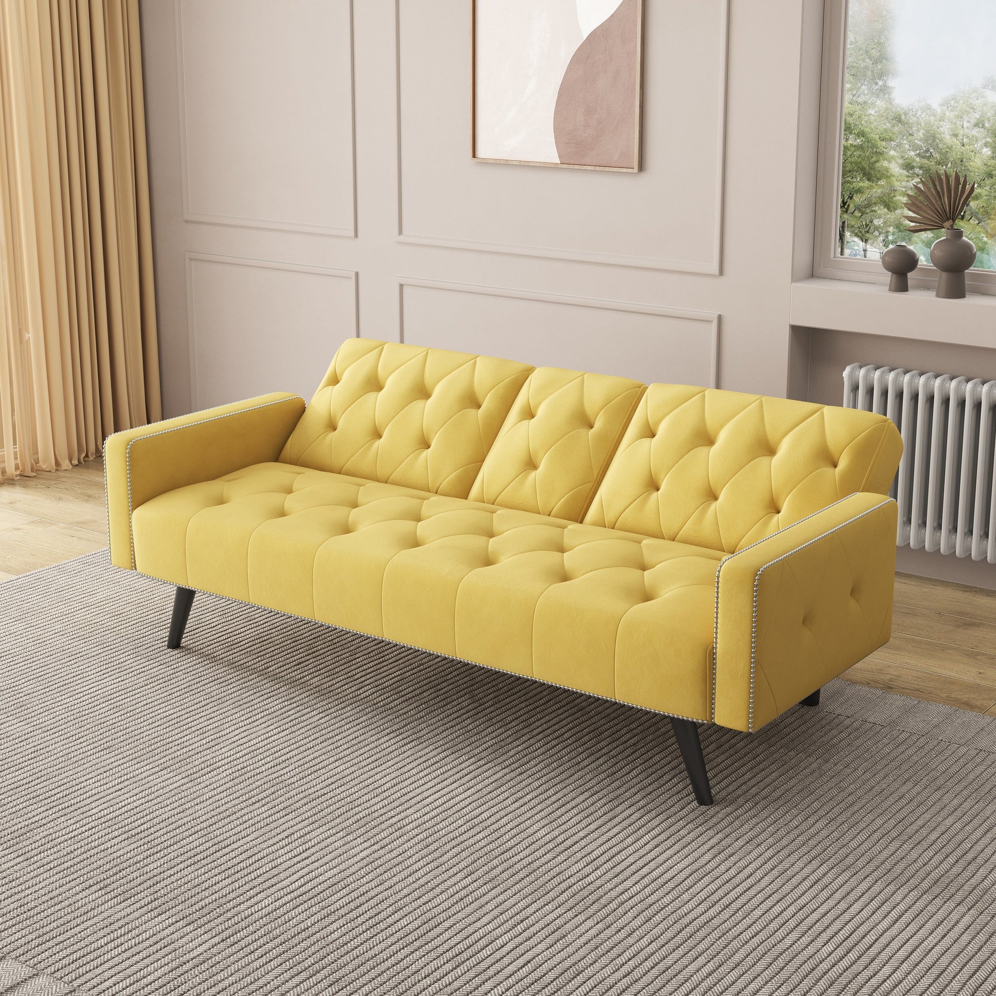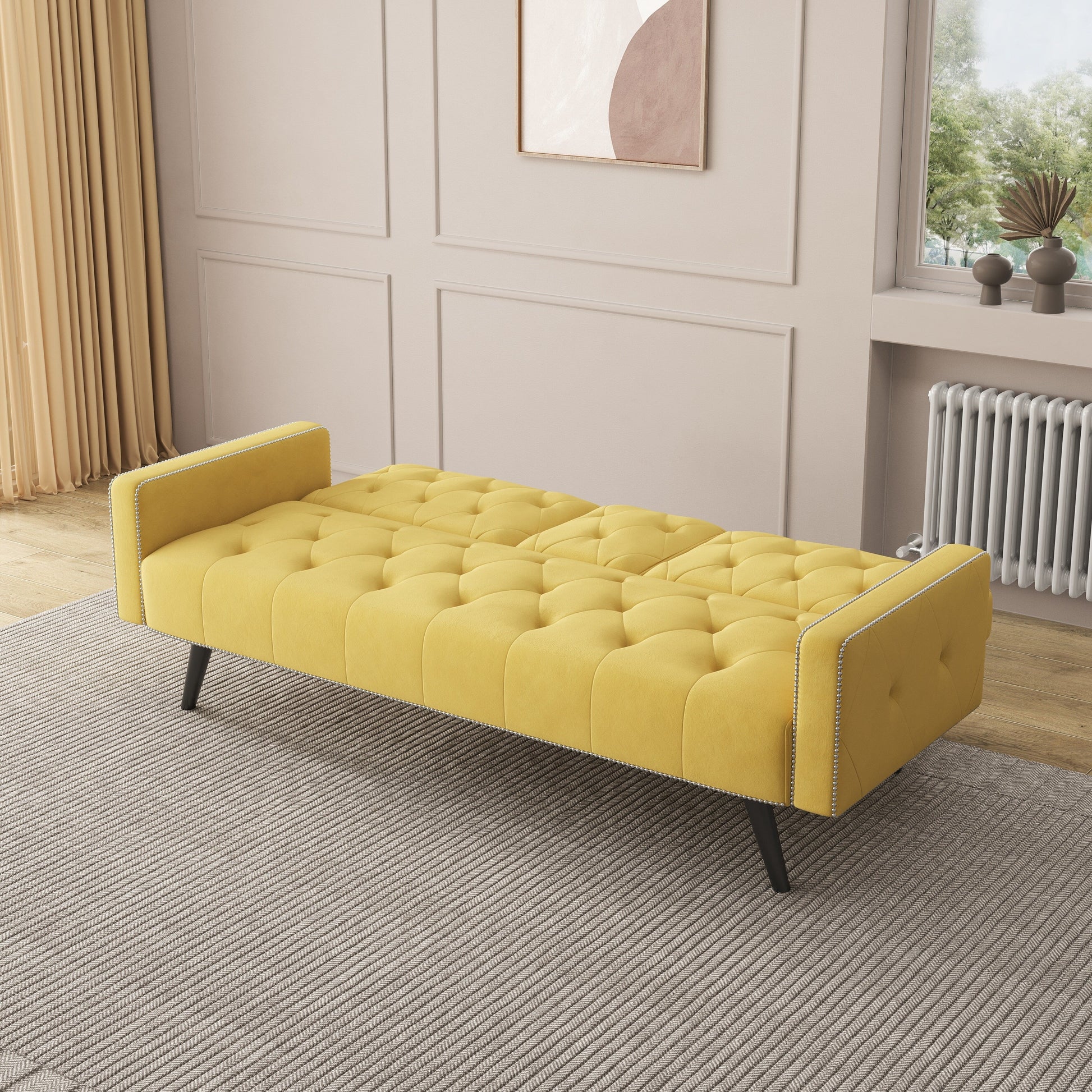 Divano letto a 3 posti in velluto giallo con borchie e portabicchieri